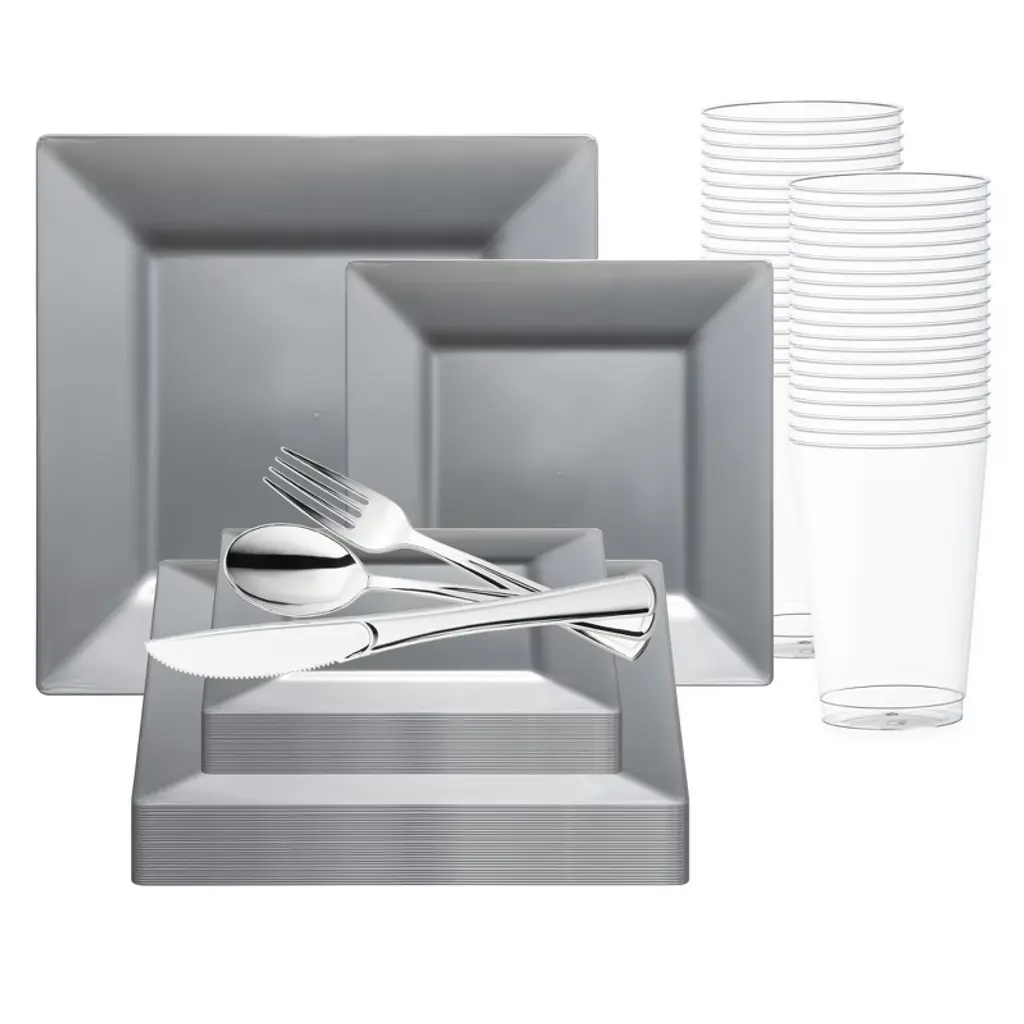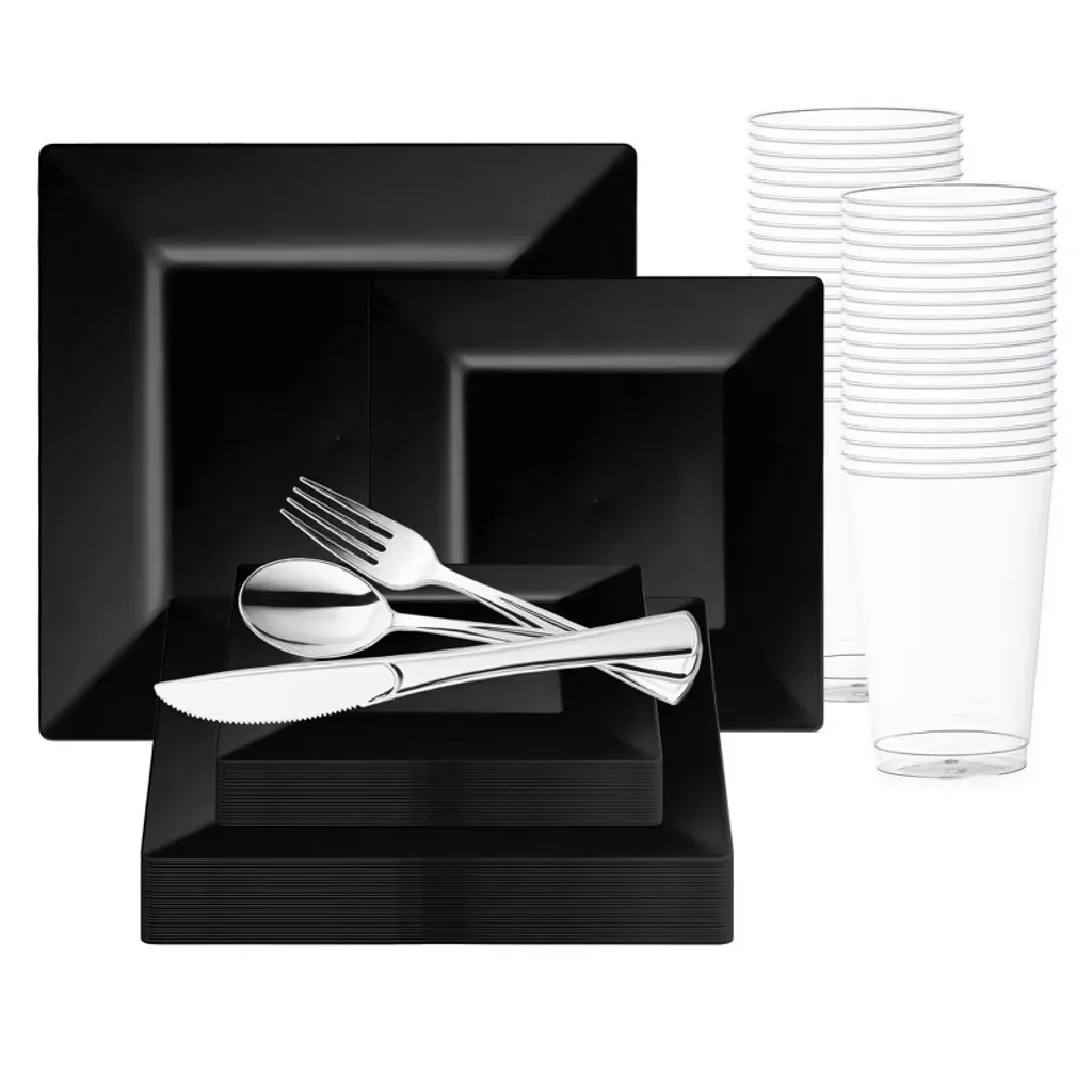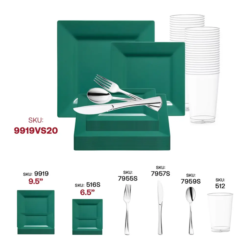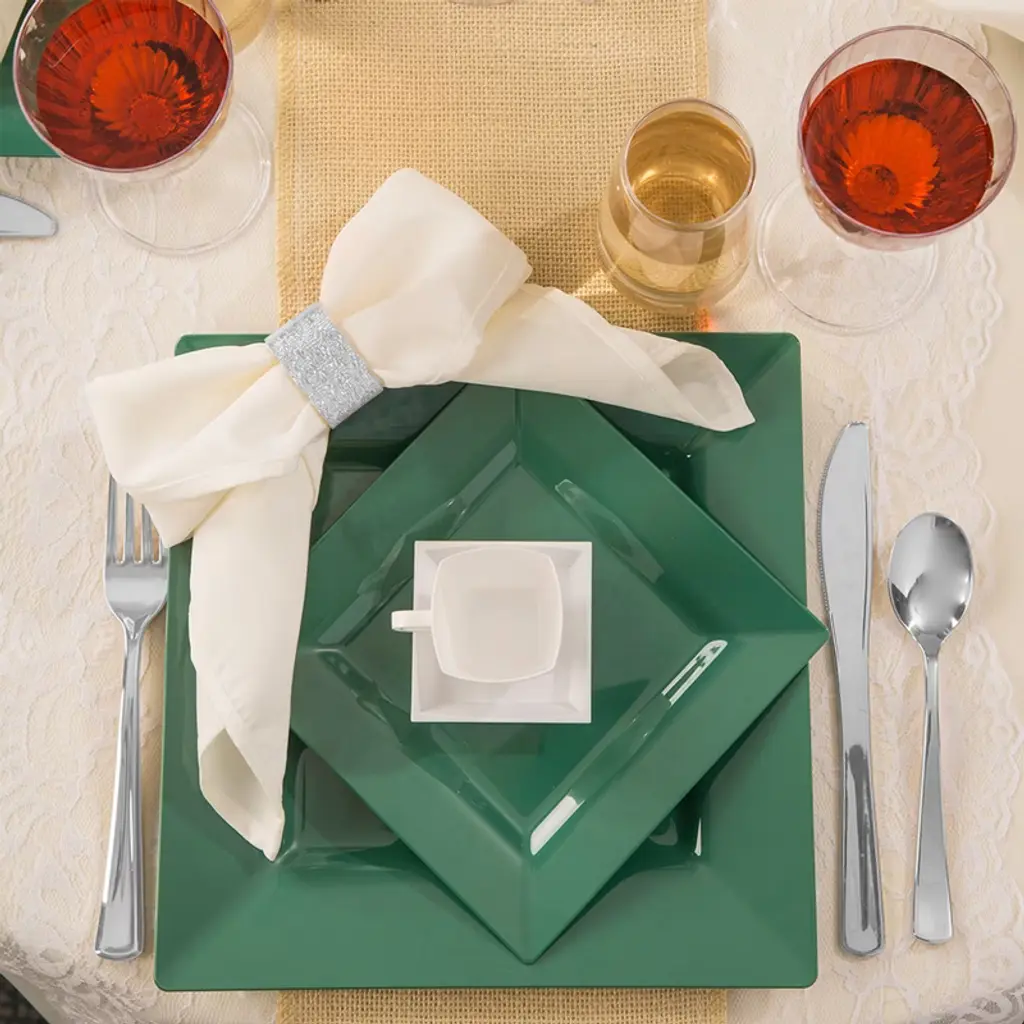 Add a touch of fashionable style to your wedding reception with this modern disposable plastic tableware value set. This comprehensive package boasts 120 dinner and 120 salad plates, each featuring a chic square shape and hunter-green design for a contemporary flair. Accompanied by 120 forks, spoons, and knives, as well as 120 12 oz. tumblers, it ensures every guest is catered to with style and convenience. Crafted from high-quality plastic, these pieces combine durability with sophistication, making them ideal for any elegant affair. With ample quantities and a striking hue, this set promises to elevate your wedding reception to new heights of refinement and luxury.