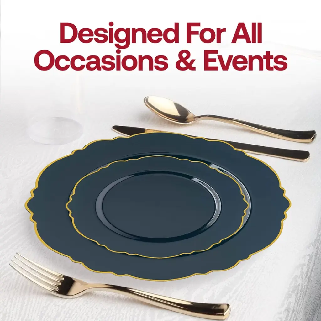 Buy our Navy with Gold Rim Blossom Disposable Plastic Dinnerware Set at the best price. No washing necessary! Shop now to upgrade your event effortlessly!