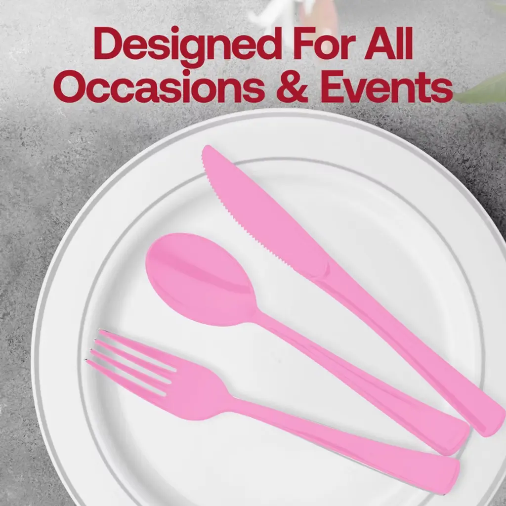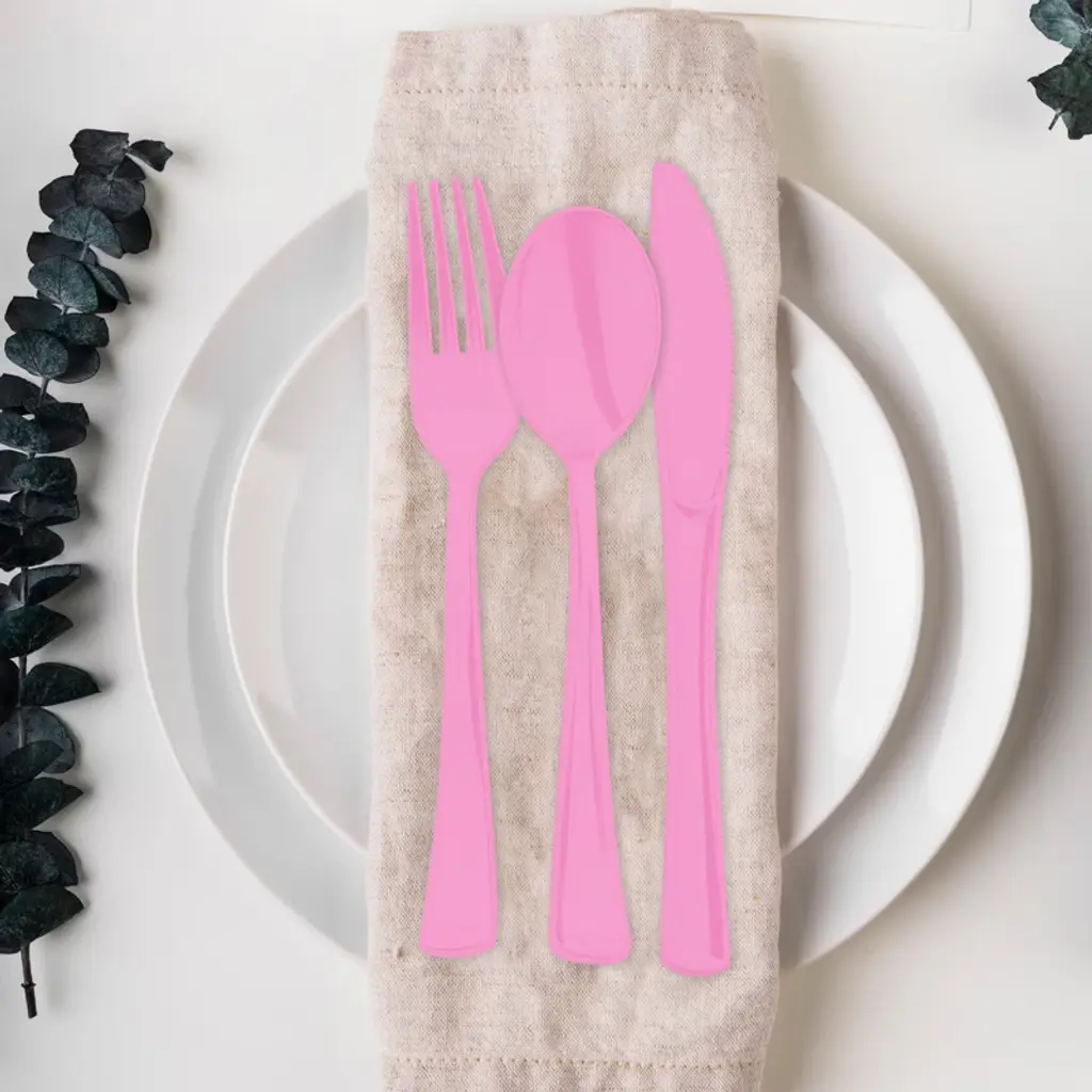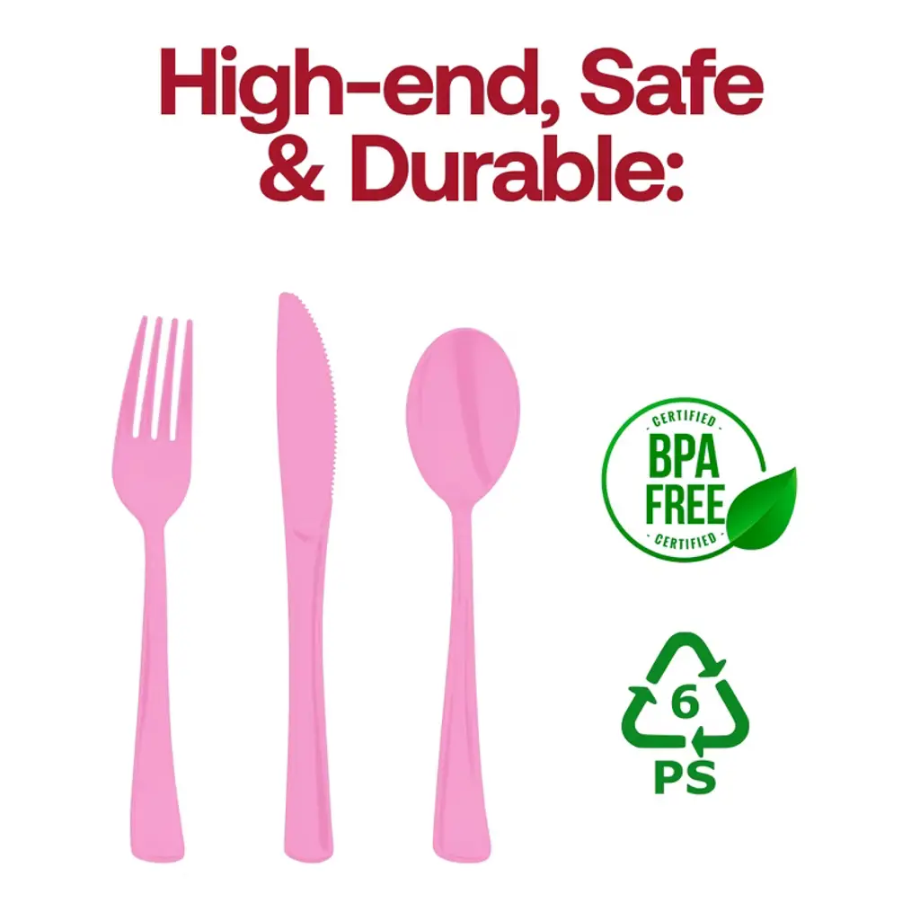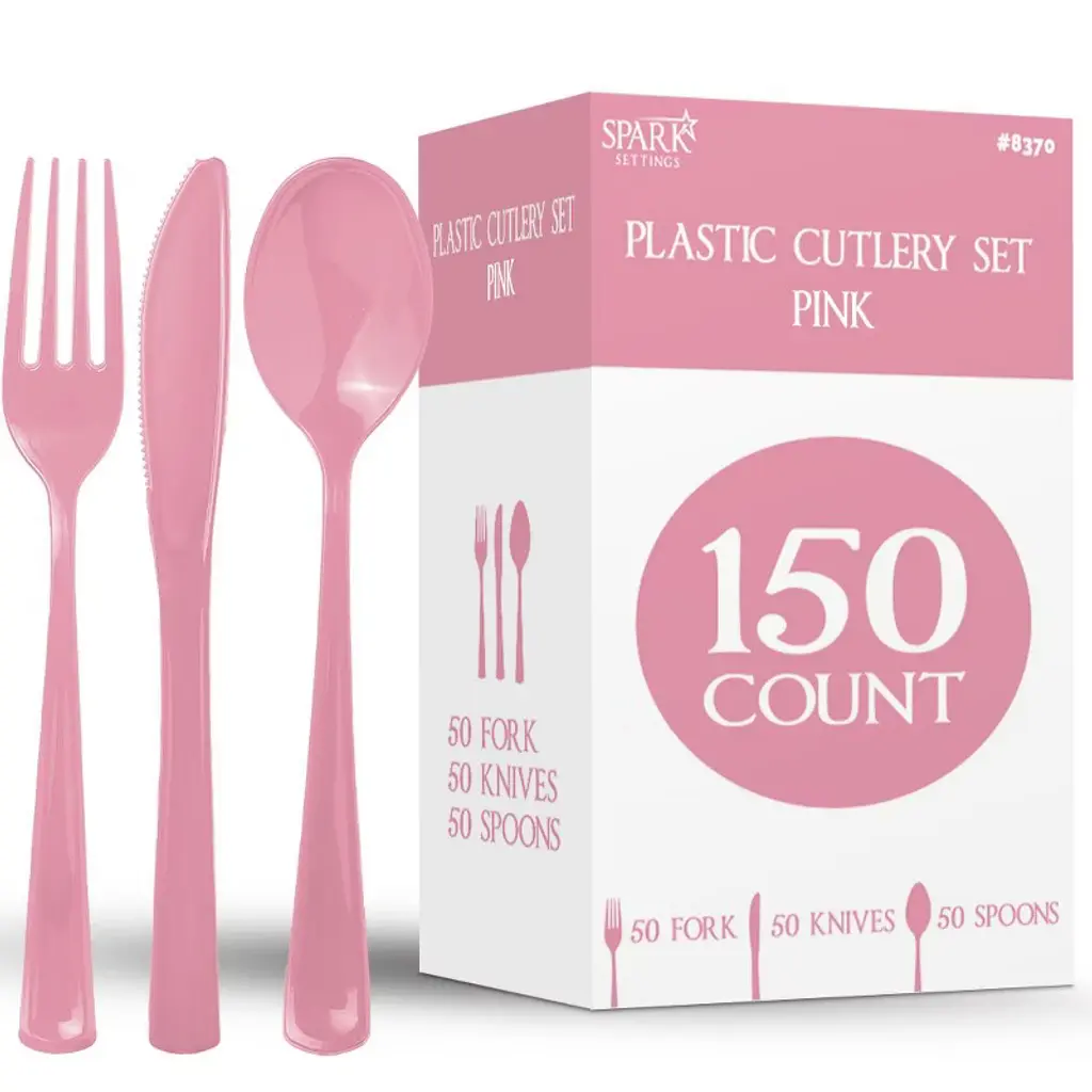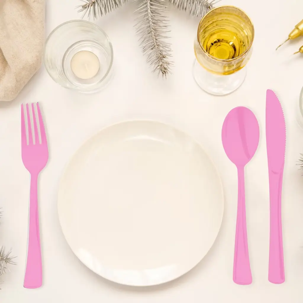 Make every table setting pop with our Pink Disposable Plastic Party Cutlery Set, featuring matching forks, knives, and spoons in a vibrant candy-pink finish. Crafted from sturdy, BPA-free plastic with a glossy mirror-like coating, this stylish set offers the strength to handle everything from sizzling entrées to chilled desserts without bending or breaking. Perfect for birthday parties, showers, luncheons, or catered events, each utensil adds charm to your décor while simplifying cleanup. Lightweight, stackable, and recyclable, this set delivers convenience without sacrificing presentation.