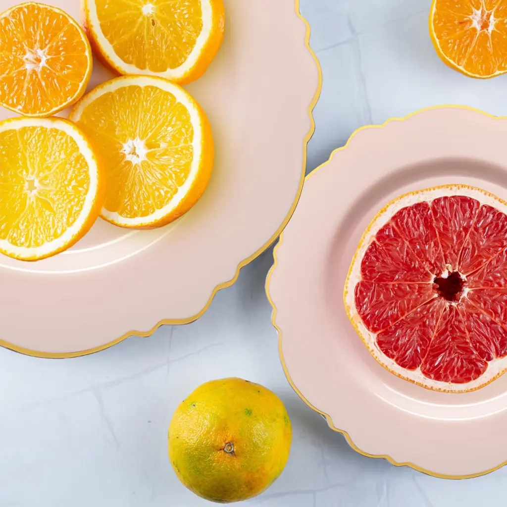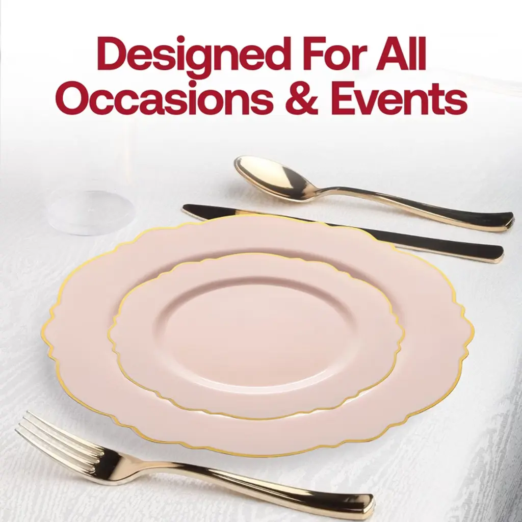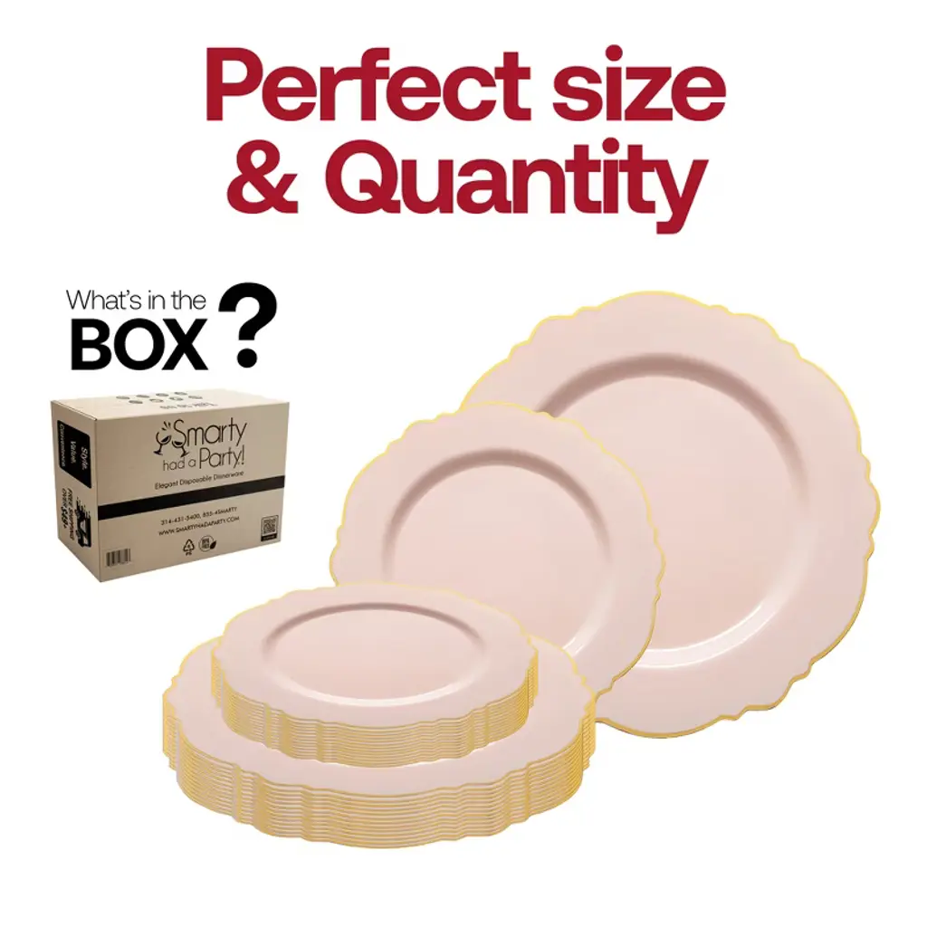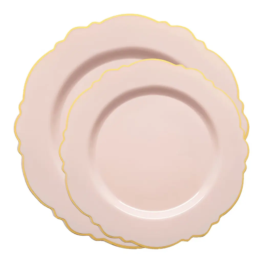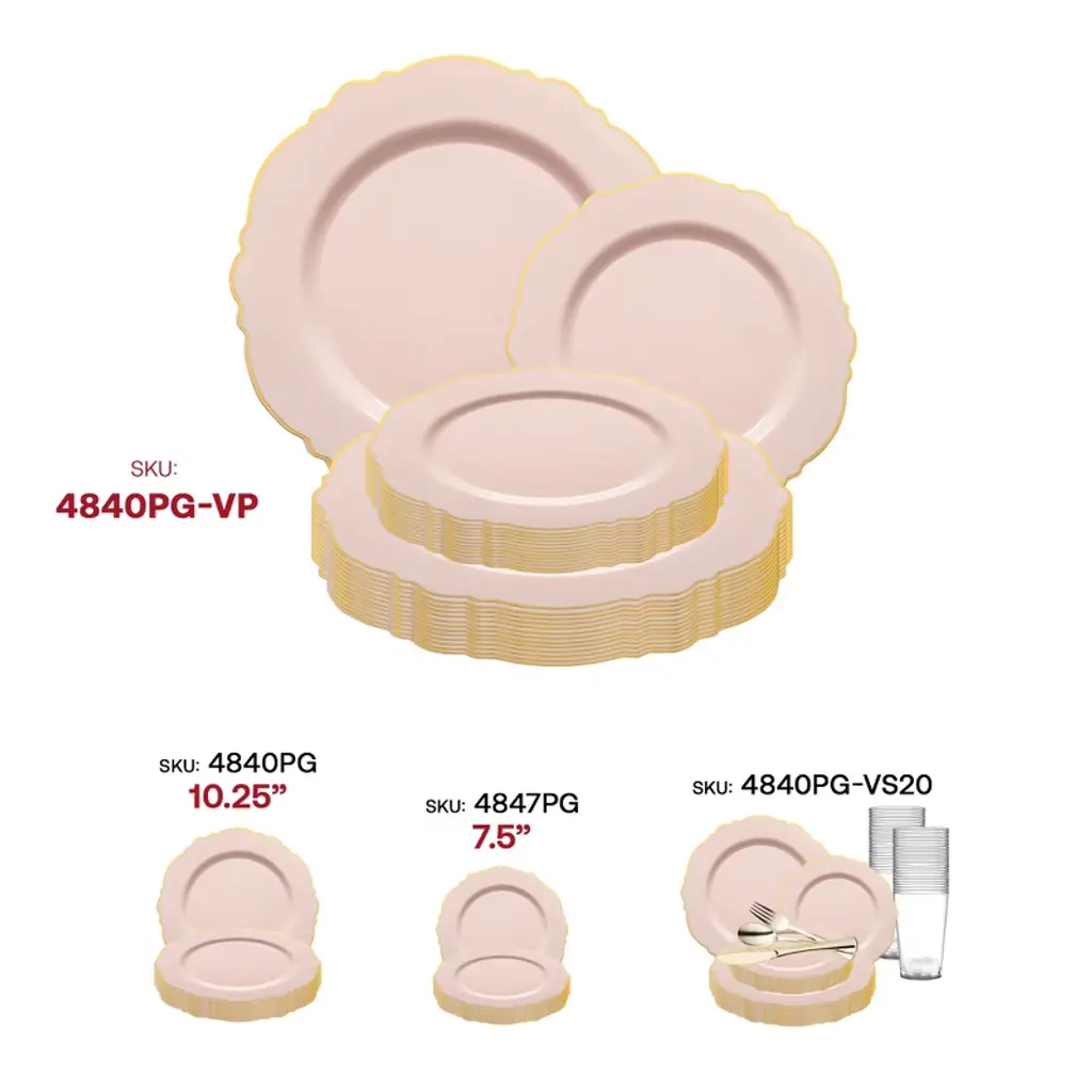 Enjoy showing off your perfect hosting skills at your next party with this adorable disposable plastic dinnerware value set. This set includes 120 dinner plates and 120 salad plates, which is enough for a party with a long list of guests. The durable plastic plates are pink with shiny gold rims and blossom edges. They offer a sophisticated look that will add a touch of elegance to any event or party.