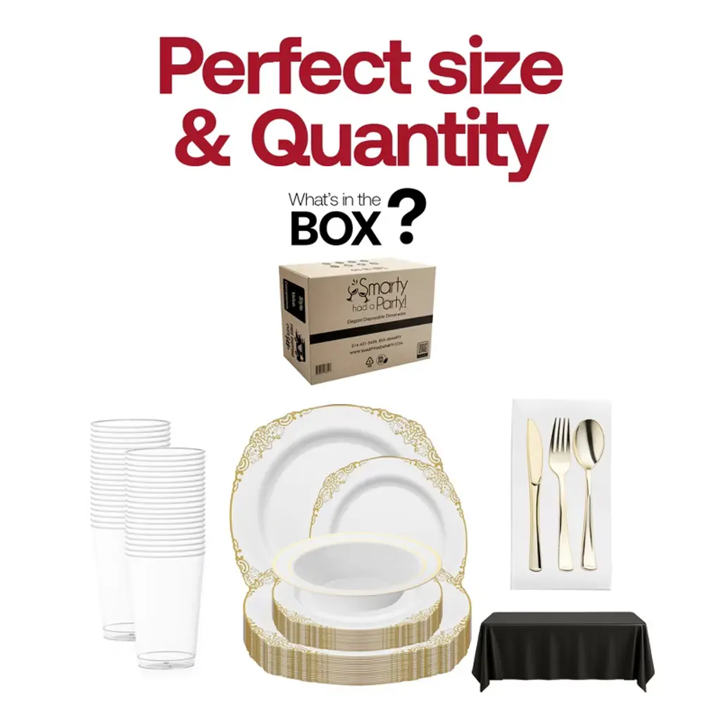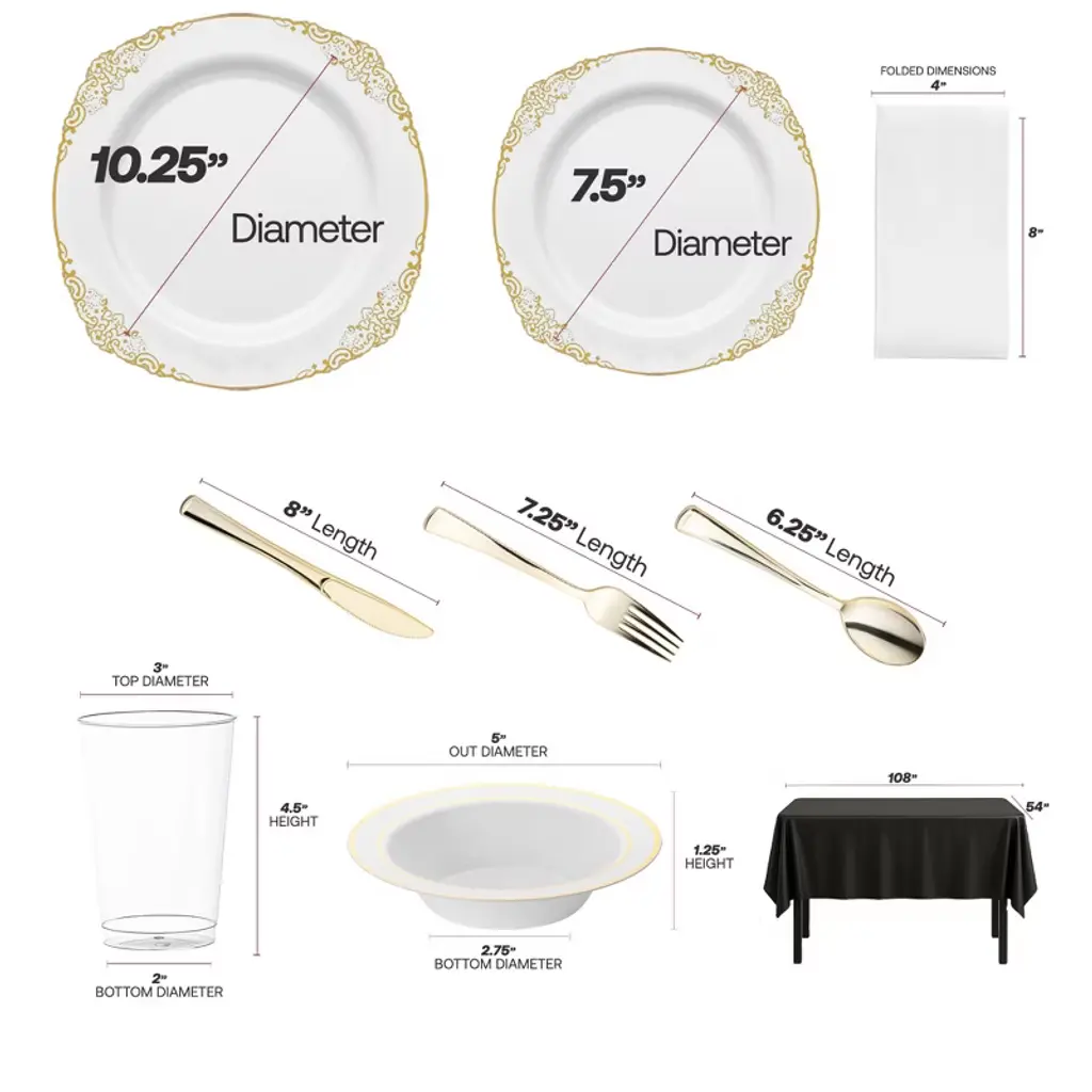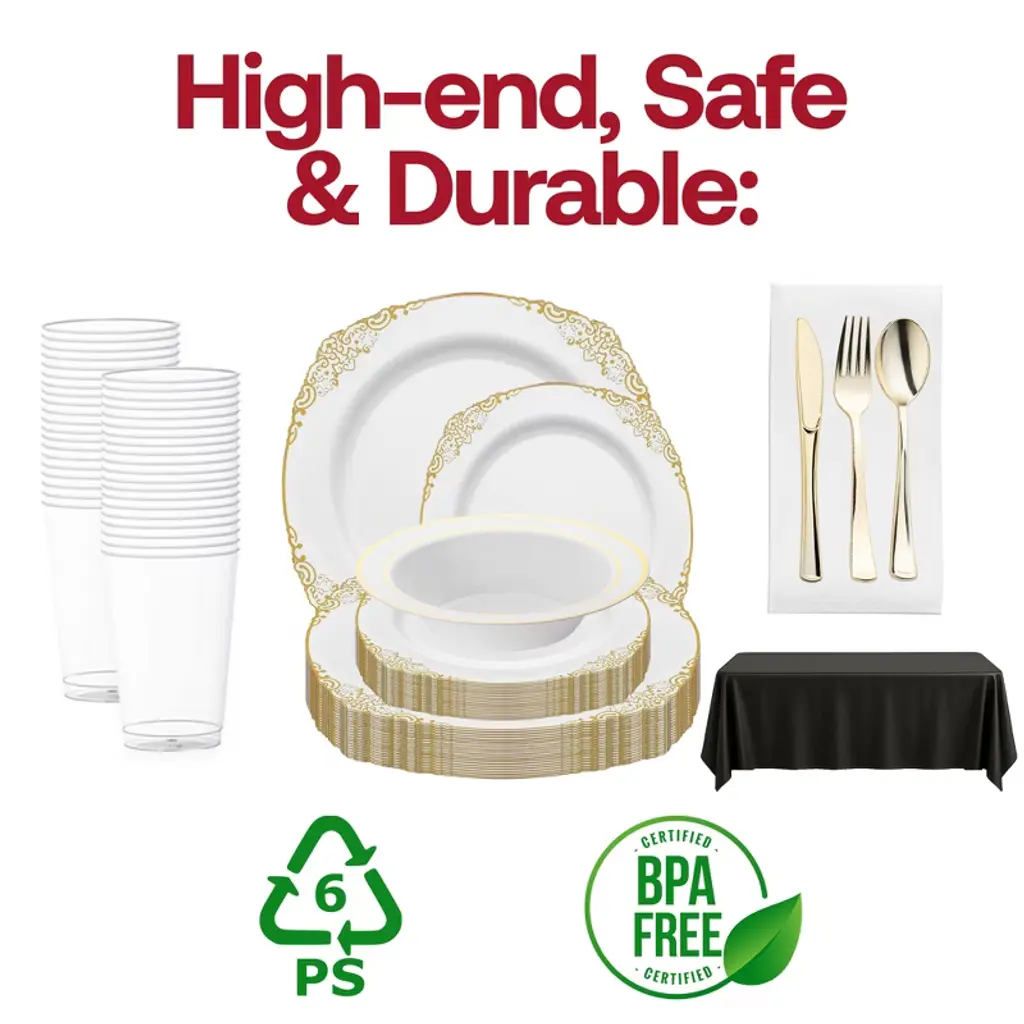 Serve your guests with elegance and convenience using this banquet-size disposable dinnerware set for 60 guests, featuring white dinner plates, salad plates, and dessert bowls trimmed with gold. The set includes polished gold flatware, clear drink cups, crisp white buffet napkins, and black tablecloths for a modern and sophisticated contrast. Made from durable BPA-free plastic, this dinnerware is strong enough for multi-course meals while ensuring stress-free single-use cleanup. Perfect for weddings, anniversaries, corporate events, and holiday parties, it combines classic gold-trimmed style with practicality for large gatherings.