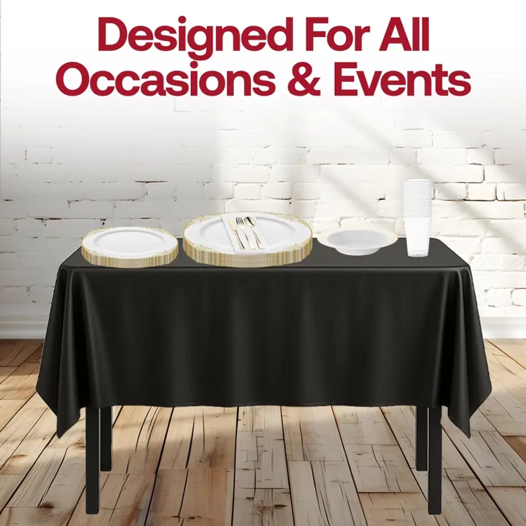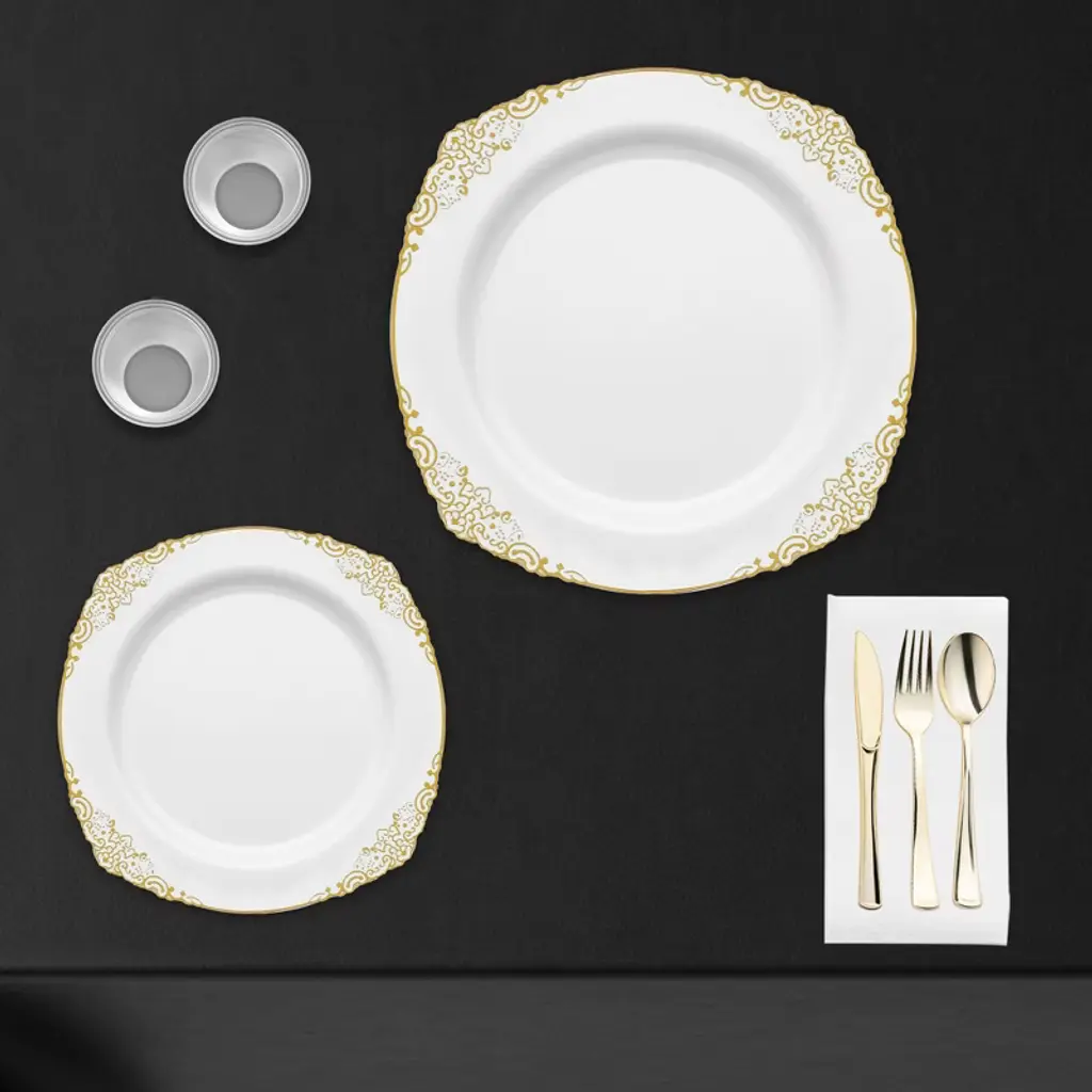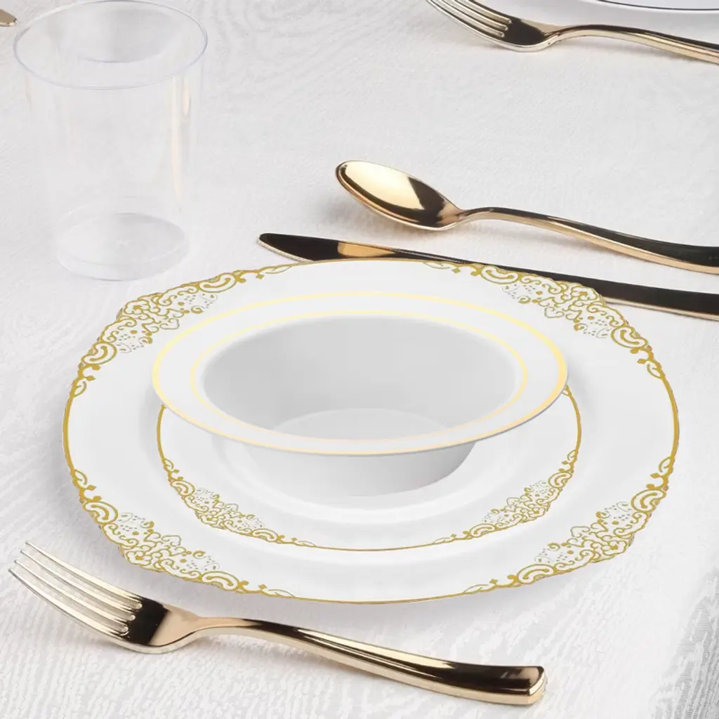Serve your guests with elegance and convenience using this banquet-size disposable dinnerware set for 60 guests, featuring white dinner plates, salad plates, and dessert bowls trimmed with gold. The set includes polished gold flatware, clear drink cups, crisp white buffet napkins, and black tablecloths for a modern and sophisticated contrast. Made from durable BPA-free plastic, this dinnerware is strong enough for multi-course meals while ensuring stress-free single-use cleanup. Perfect for weddings, anniversaries, corporate events, and holiday parties, it combines classic gold-trimmed style with practicality for large gatherings.
