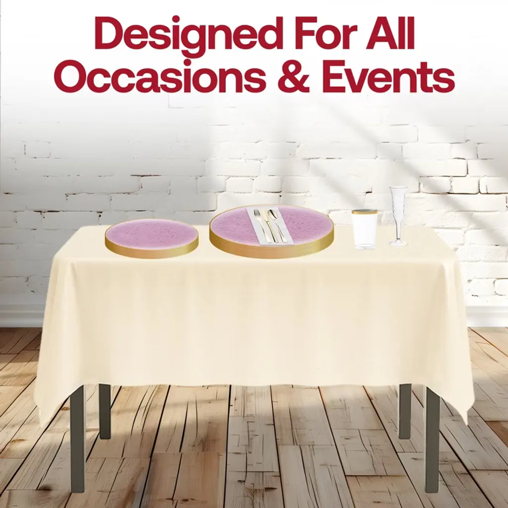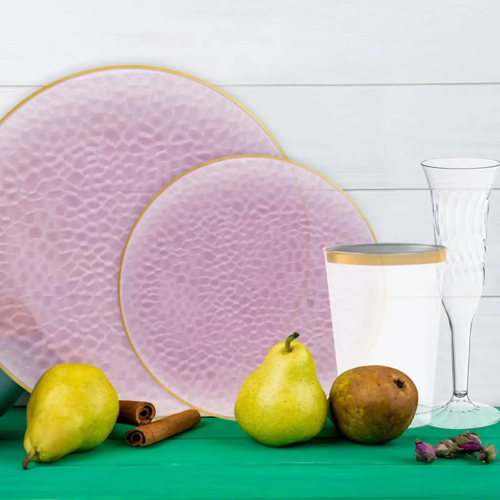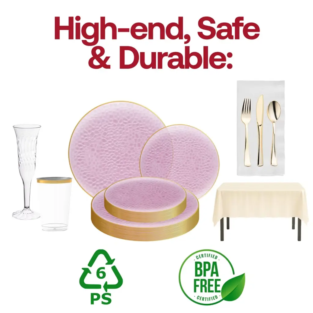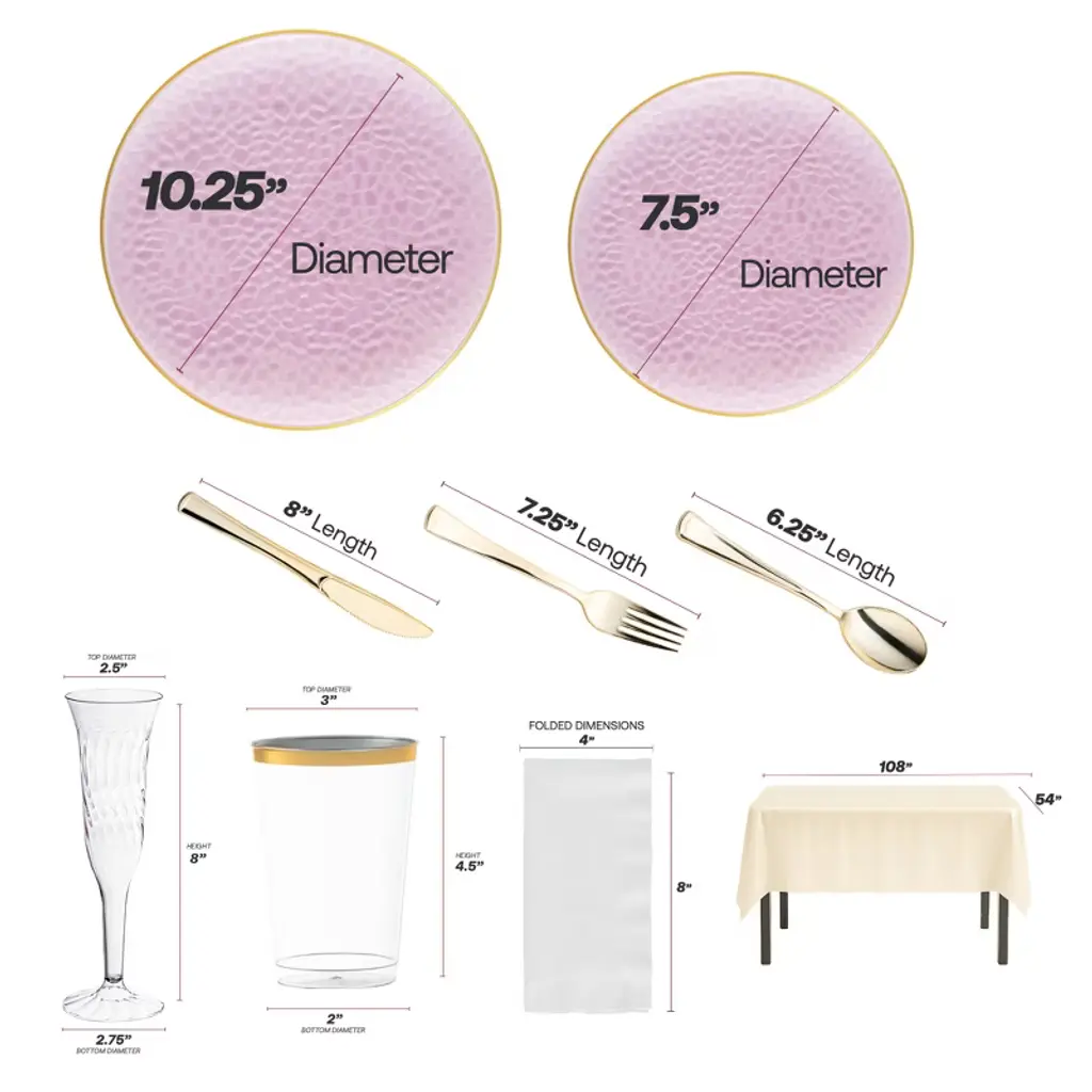Celebrate in style with this disposable dinnerware set for 50 guests, featuring clear pink dinner plates and salad plates accented with gold, paired with elegant gold flatware. The set also includes clear tumblers with gold trim, champagne flutes, crisp white napkins, and ivory tablecloths for a refined presentation. Crafted from durable BPA-free plastic, this dinnerware set is strong enough for full meals while ensuring stress-free, single-use cleanup. Perfect for weddings, bridal showers, baby showers, birthdays, and upscale parties, it combines soft pink charm with gold elegance for unforgettable gatherings.
