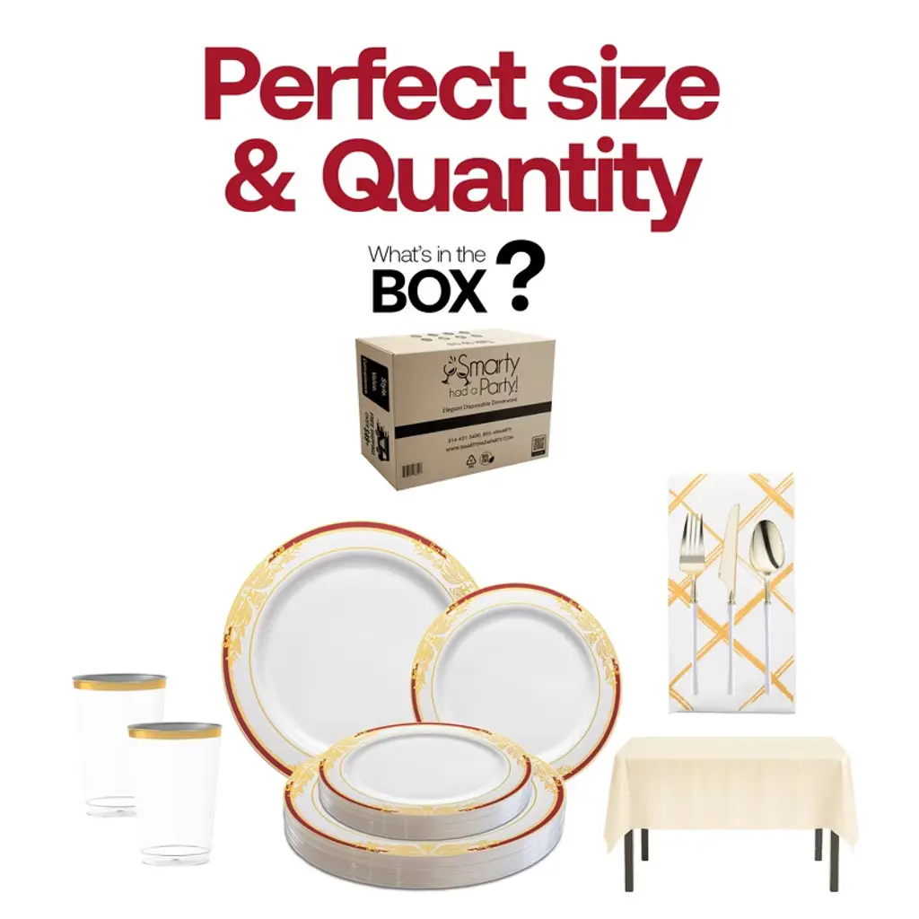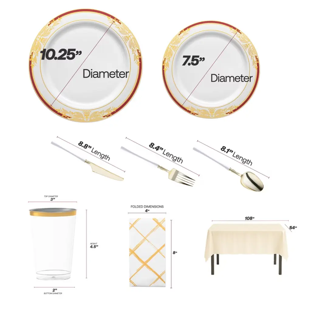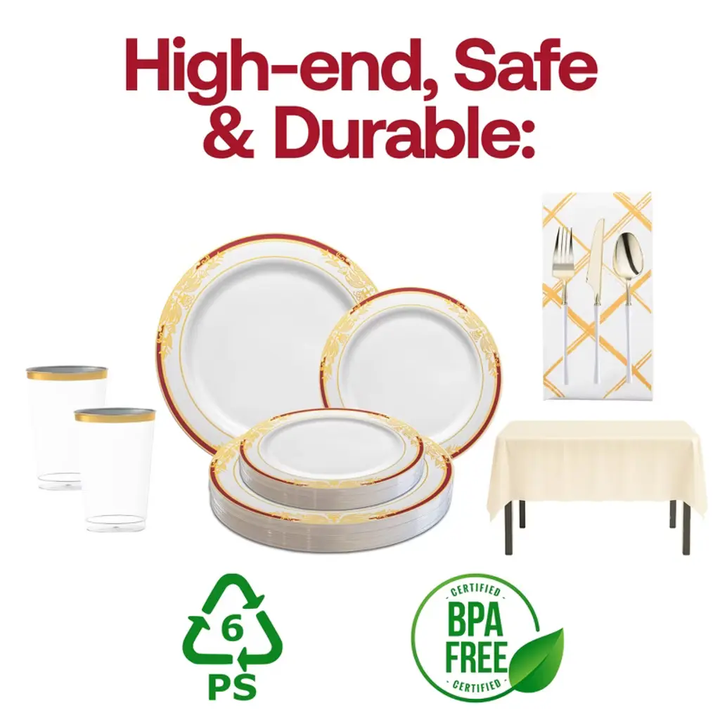 Make a lasting impression at your next event with this luxury disposable dinnerware set for 60 guests, featuring white dinner and salad plates detailed with rich burgundy and shimmering gold. The set includes stylish gold-and-white flatware, clear tumblers with gold rims, ivory tablecloths, and coordinating white napkins with gold accents to create a polished and festive tablescape. Crafted from durable BPA-free plastic, this set delivers the sophistication of fine china with the ease of disposable cleanup. Perfect for weddings, holiday celebrations, banquets, and upscale dinner parties, it ensures your large gathering is both elegant and effortless.