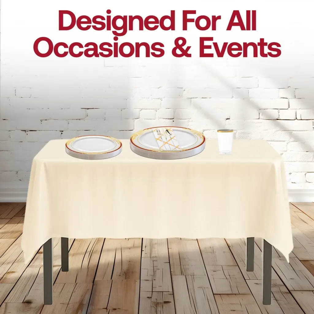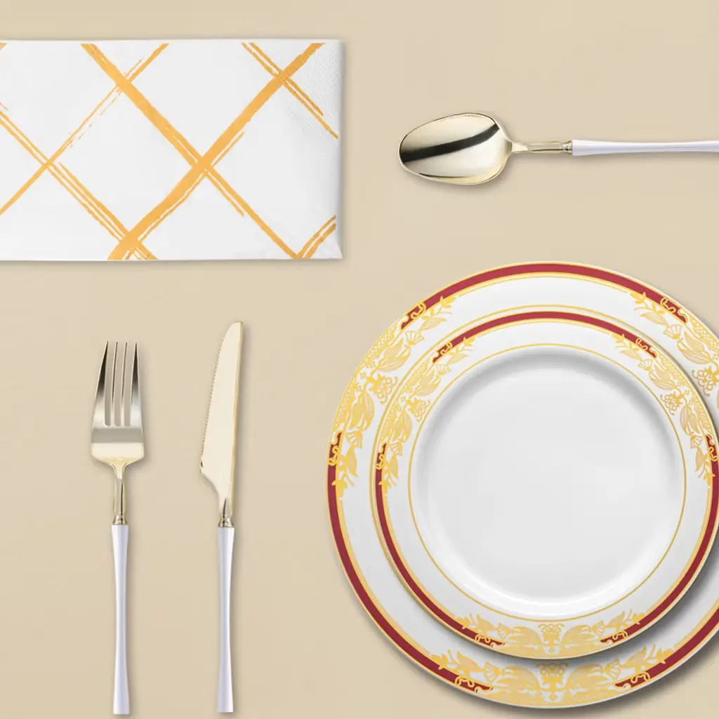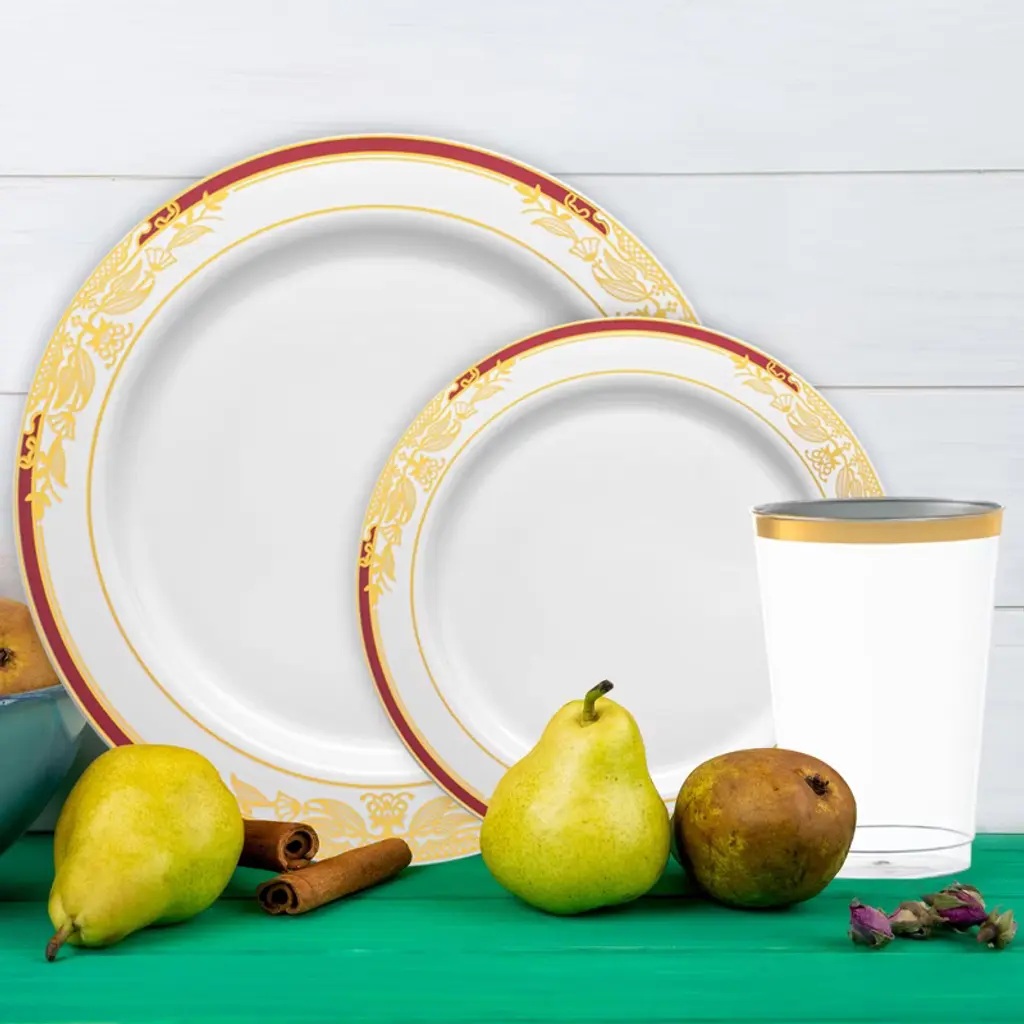 Make a lasting impression at your next event with this luxury disposable dinnerware set for 60 guests, featuring white dinner and salad plates detailed with rich burgundy and shimmering gold. The set includes stylish gold-and-white flatware, clear tumblers with gold rims, ivory tablecloths, and coordinating white napkins with gold accents to create a polished and festive tablescape. Crafted from durable BPA-free plastic, this set delivers the sophistication of fine china with the ease of disposable cleanup. Perfect for weddings, holiday celebrations, banquets, and upscale dinner parties, it ensures your large gathering is both elegant and effortless.