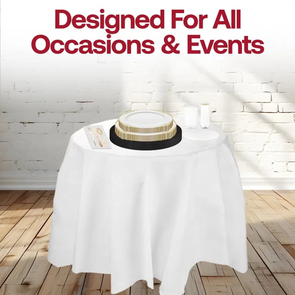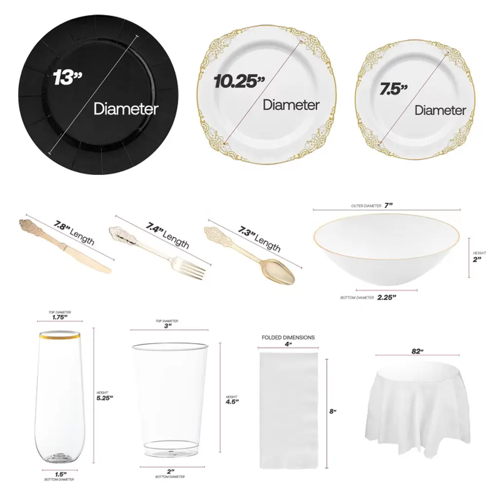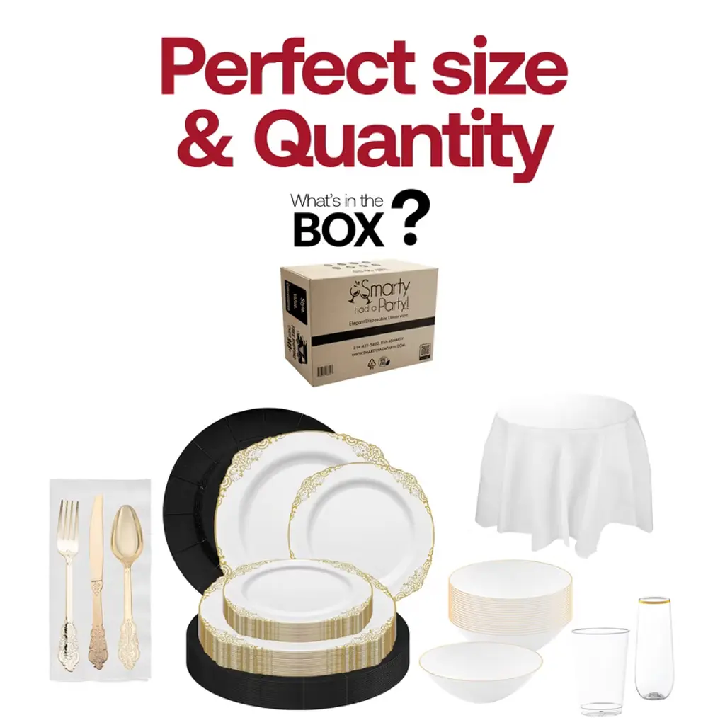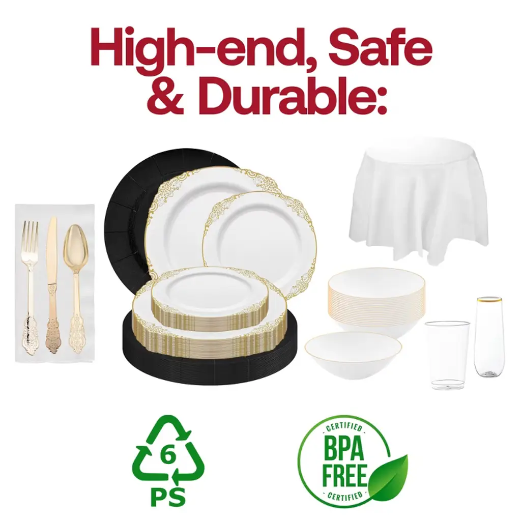 Host your next celebration in style with this luxury disposable dinnerware set for 50 guests, designed to impress with black charger plates, white dinner and salad plates trimmed in gold, and elegant white-and-gold soup bowls. The gold flatware, paired with clear tumblers and champagne flutes with gold rims, creates a polished look that’s perfect for weddings, anniversaries, banquets, and holiday gatherings. Complete with crisp white tablecloths and napkins, this set offers a cohesive and upscale presentation. Crafted from durable BPA-free plastic, it combines the beauty of fine china with the convenience of disposable use for effortless setup and cleanup.