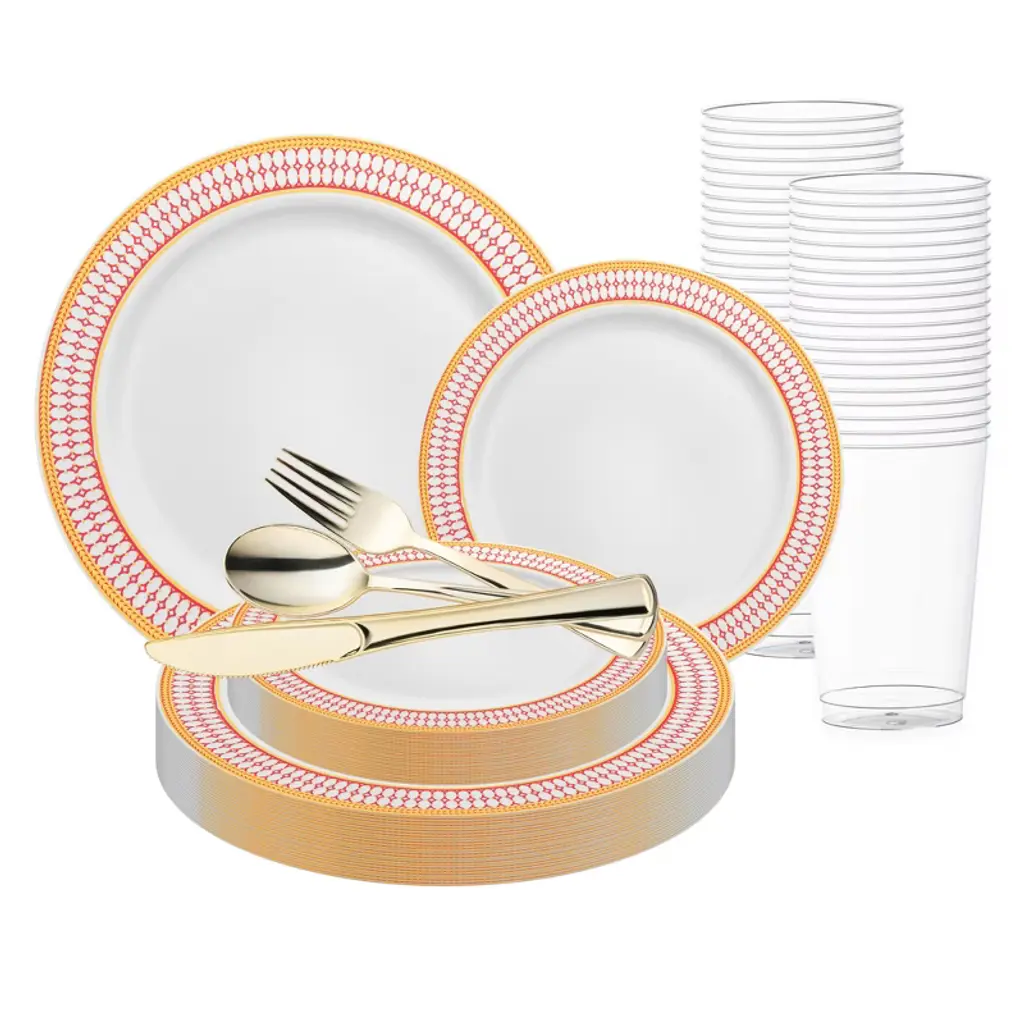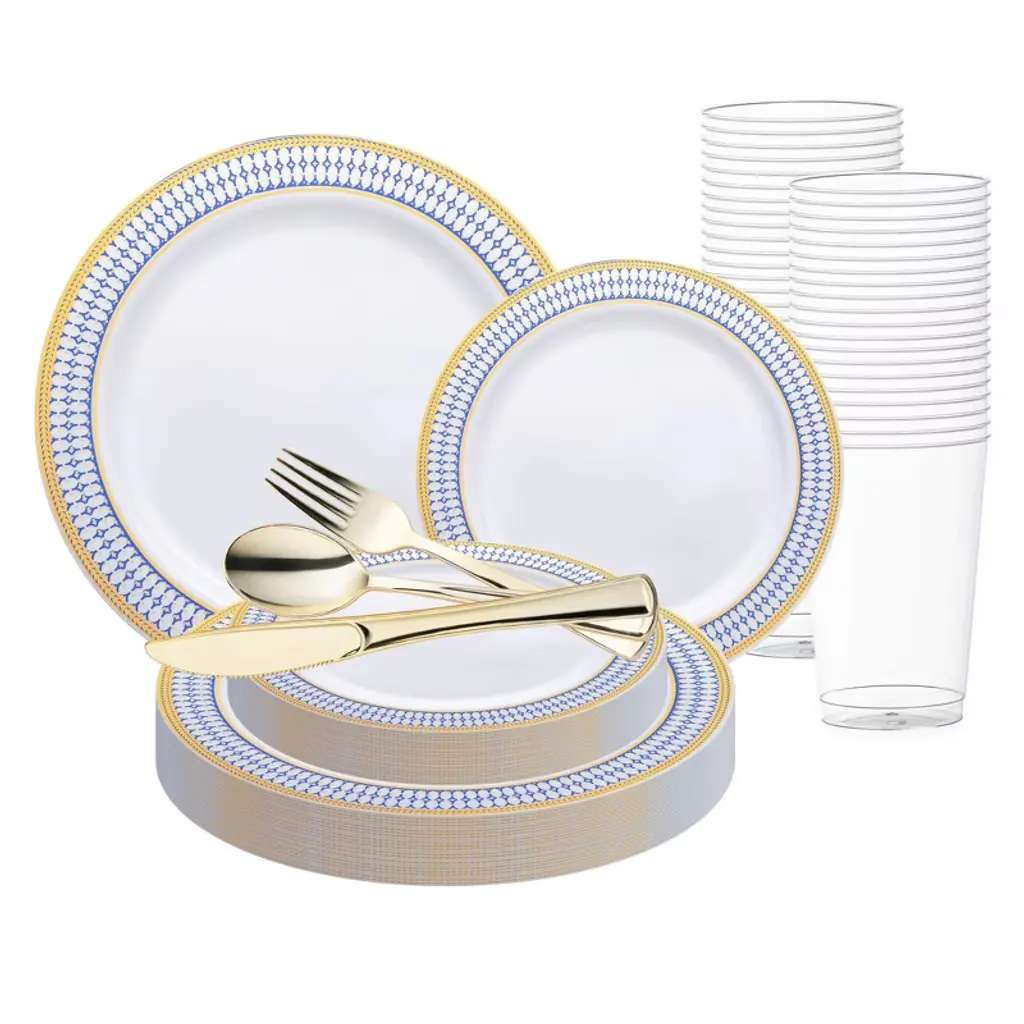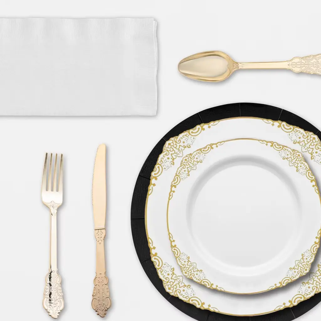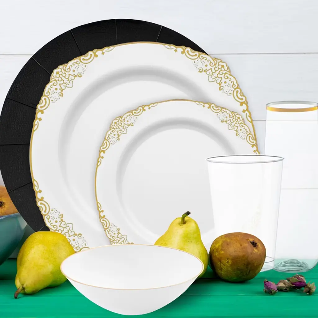 Host your next celebration in style with this luxury disposable dinnerware set for 50 guests, designed to impress with black charger plates, white dinner and salad plates trimmed in gold, and elegant white-and-gold soup bowls. The gold flatware, paired with clear tumblers and champagne flutes with gold rims, creates a polished look that’s perfect for weddings, anniversaries, banquets, and holiday gatherings. Complete with crisp white tablecloths and napkins, this set offers a cohesive and upscale presentation. Crafted from durable BPA-free plastic, it combines the beauty of fine china with the convenience of disposable use for effortless setup and cleanup.