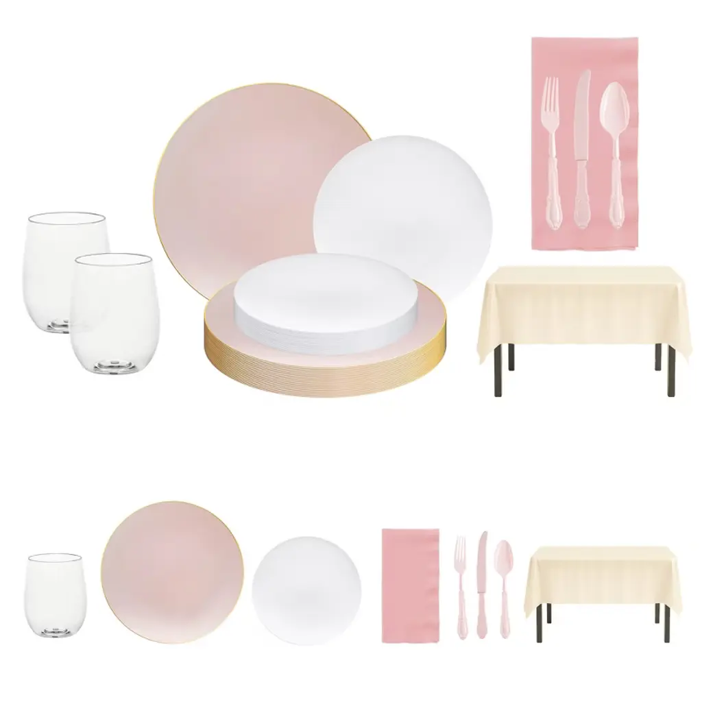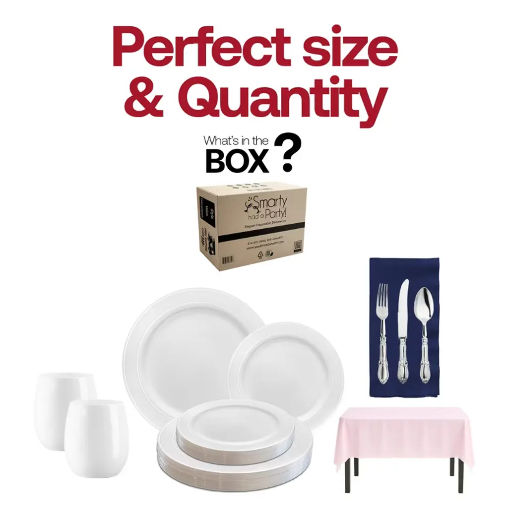 Bring elegance to your next gathering with this disposable dinnerware set for 20 guests, featuring white dinner and salad plates with silver trim, paired with matching silver flatware for a polished look. The set includes navy blue napkins, pink tablecloths, white cups, and stylish wine glasses to complete a chic and modern tablescape. Crafted from durable BPA-free plastic, this set combines upscale design with the convenience of one-time use, making it perfect for weddings, anniversaries, birthdays, showers, and holiday celebrations.