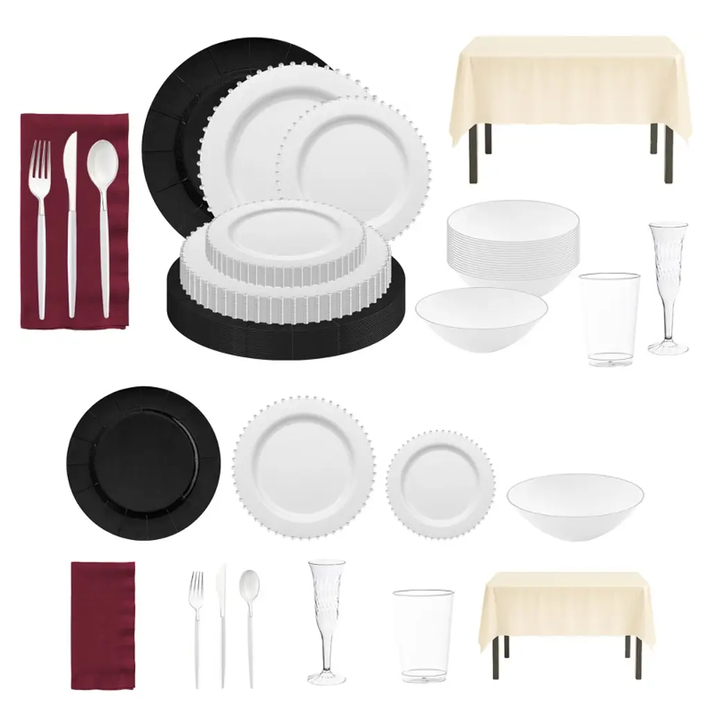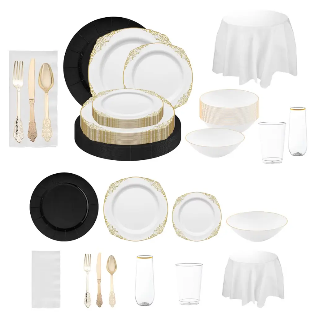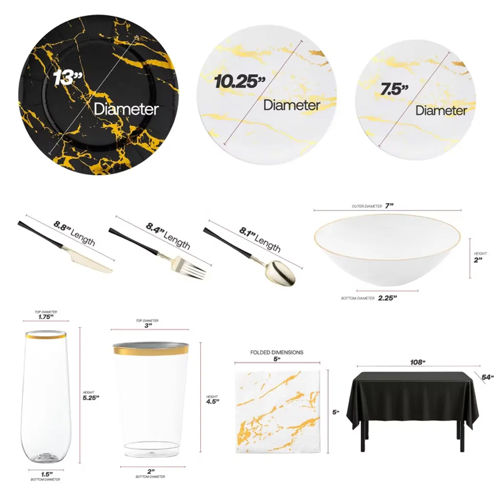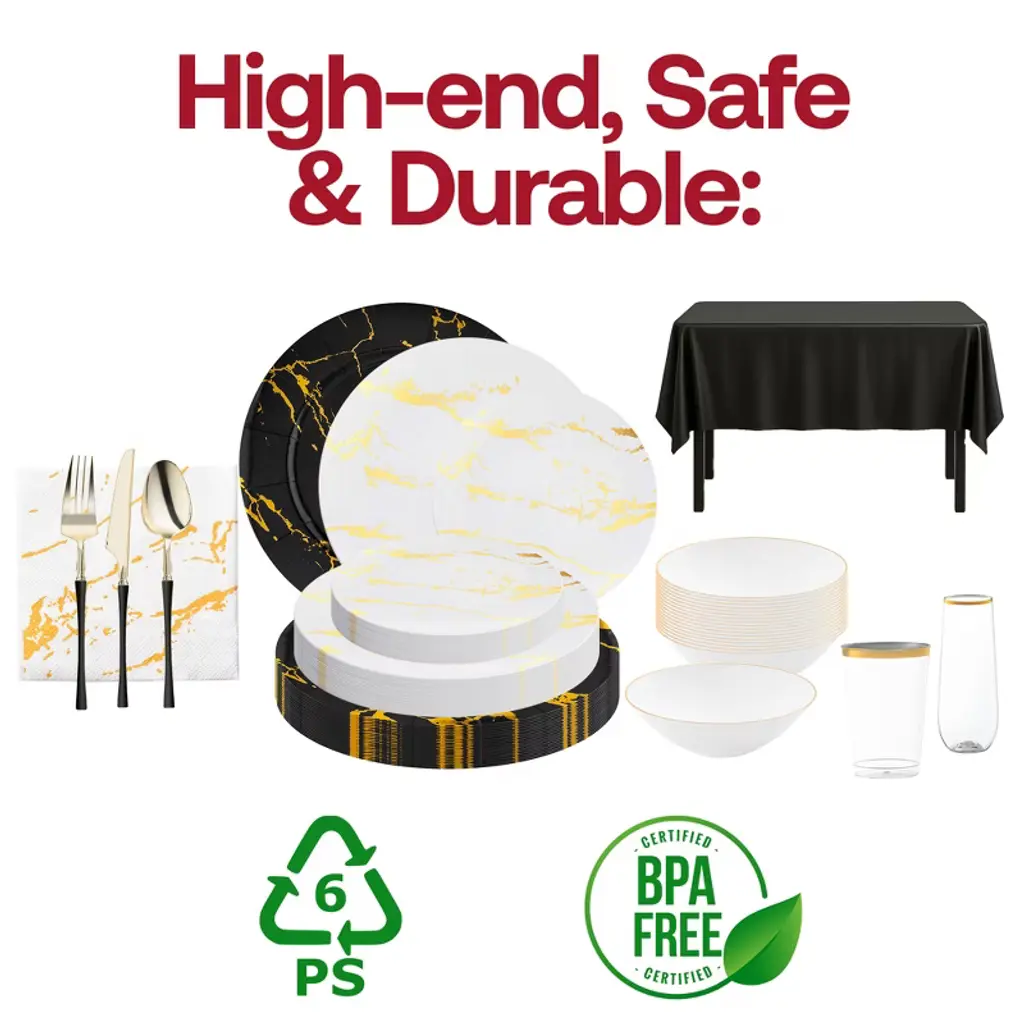 Host an unforgettable celebration with this premium dinnerware set for 100 guests, designed with black and gold charger plates, elegant white with gold dinnerware, and crystal-style champagne flutes. The coordinating gold with black flatware, black tablecloths, and white with gold beverage napkins create a polished and upscale tablescape. Made from durable, BPA-free premium plastic, this disposable dinnerware set offers both luxury and convenience, making it the perfect choice for weddings, banquets, corporate parties, anniversaries, and holiday gatherings.