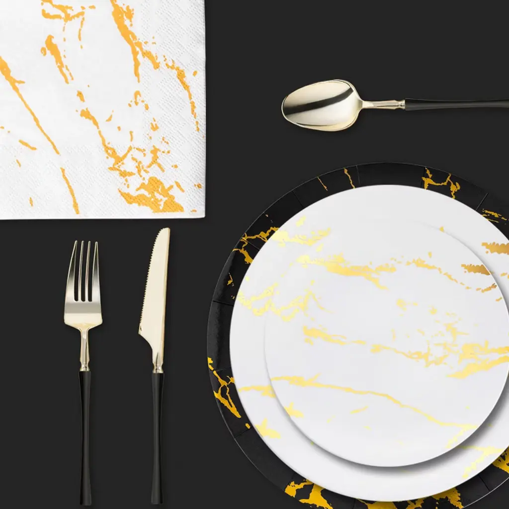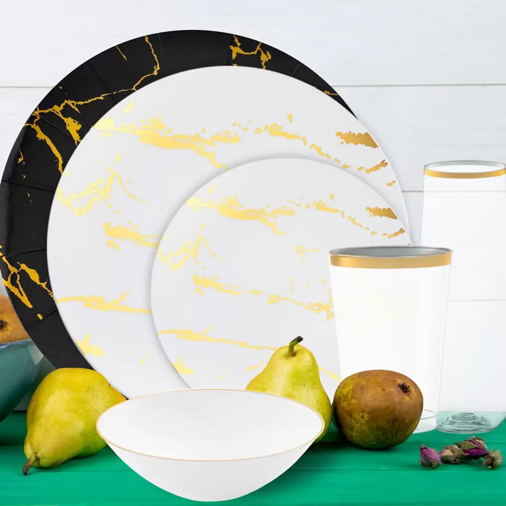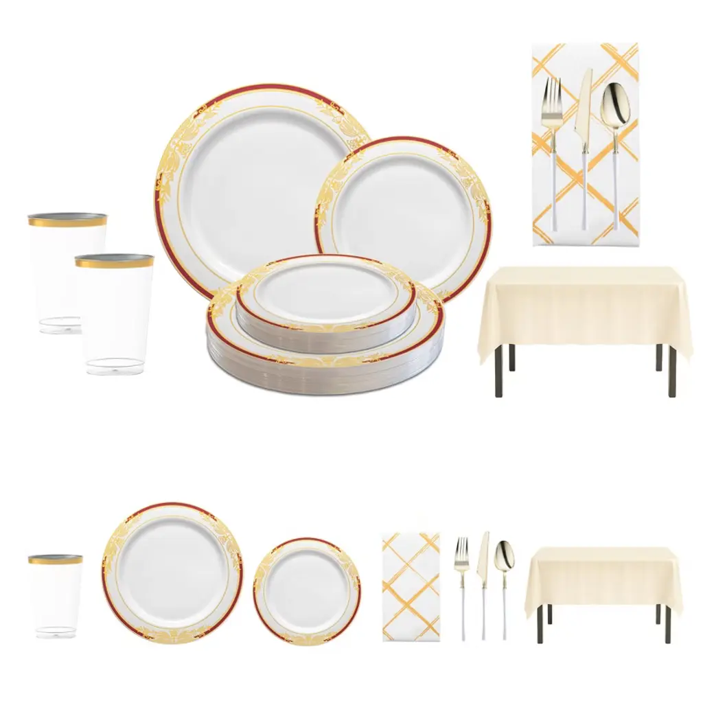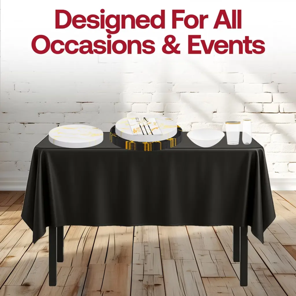 Host an unforgettable celebration with this premium dinnerware set for 100 guests, designed with black and gold charger plates, elegant white with gold dinnerware, and crystal-style champagne flutes. The coordinating gold with black flatware, black tablecloths, and white with gold beverage napkins create a polished and upscale tablescape. Made from durable, BPA-free premium plastic, this disposable dinnerware set offers both luxury and convenience, making it the perfect choice for weddings, banquets, corporate parties, anniversaries, and holiday gatherings.