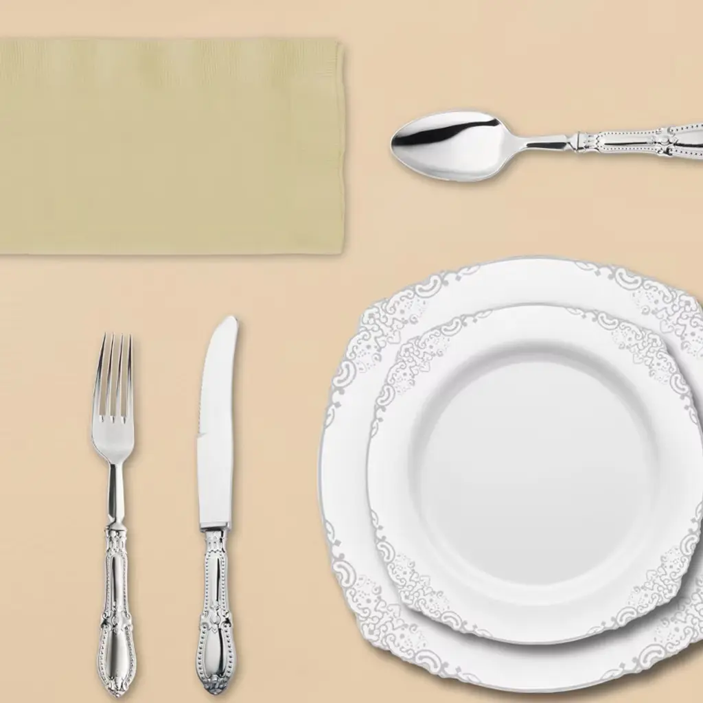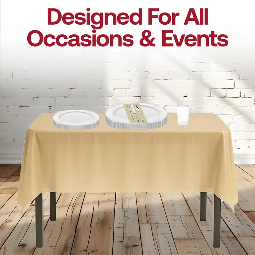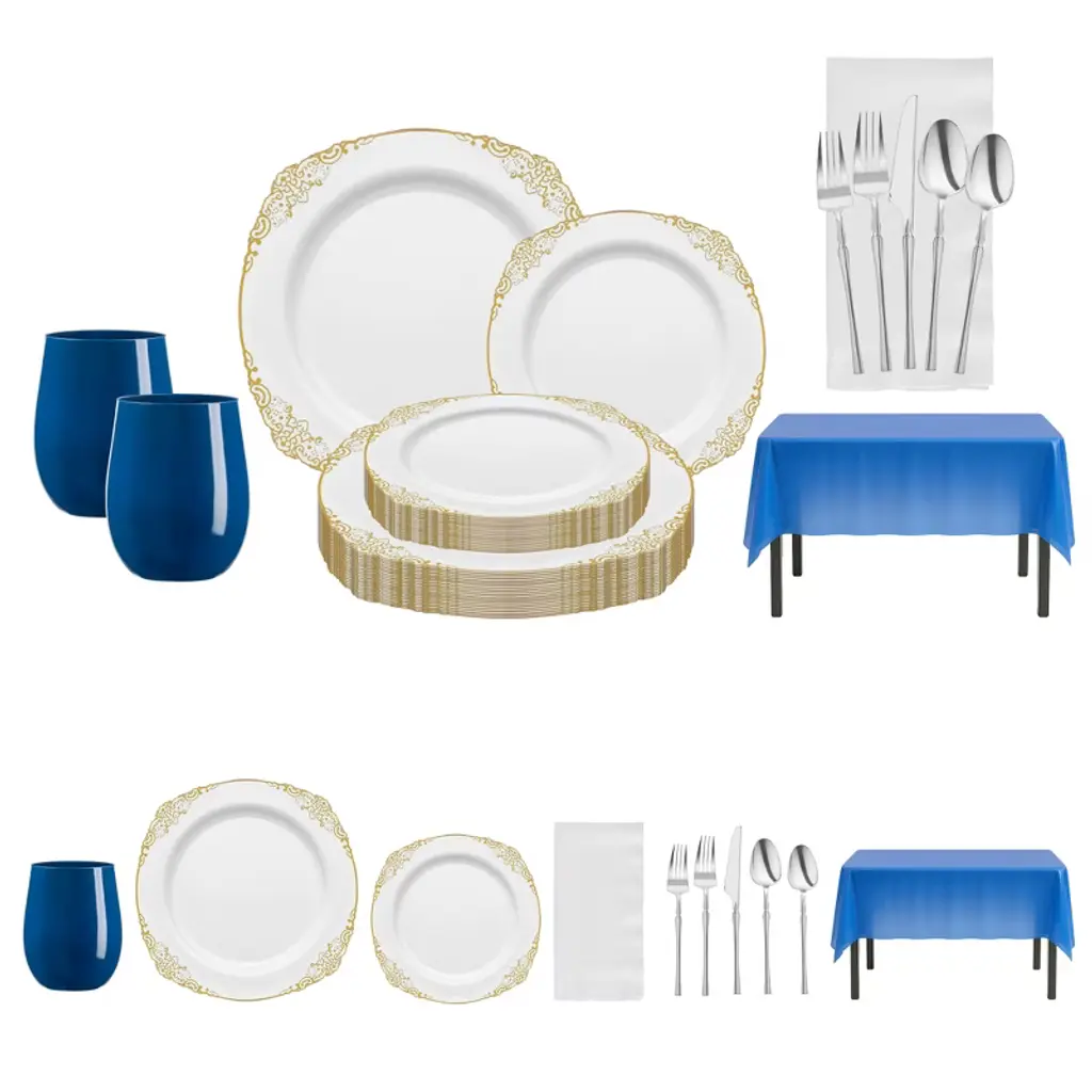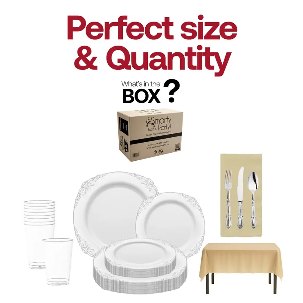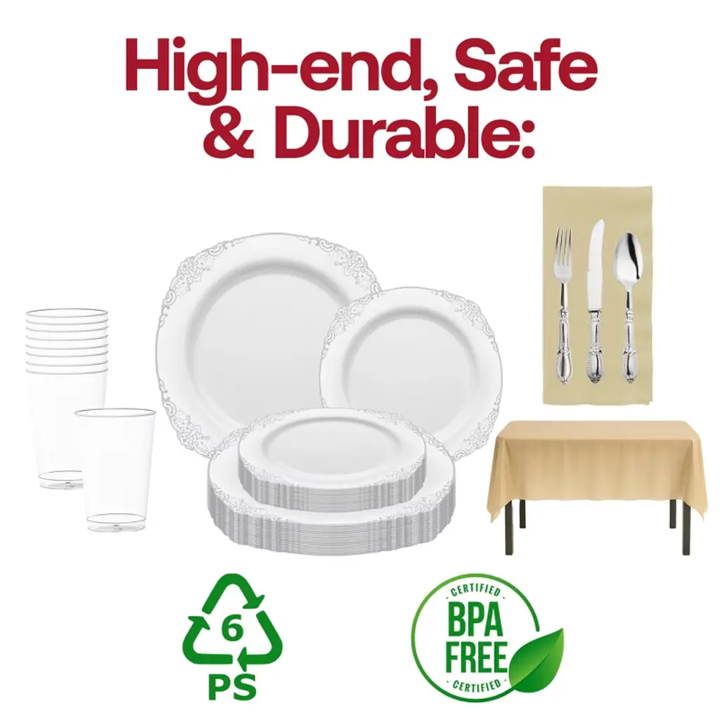 Elevate your table setting with this service for 20 disposable dinnerware set, featuring elegant white plates with silver trim, matching silver cutlery, and clear cups. The set is beautifully complemented by shimmering gold tablecloths and ivory napkins, creating a refined contrast that’s perfect for weddings, anniversaries, holiday dinners, and formal gatherings. Made from BPA-free, durable plastic, this dinnerware combines upscale presentation with the convenience of quick cleanup.