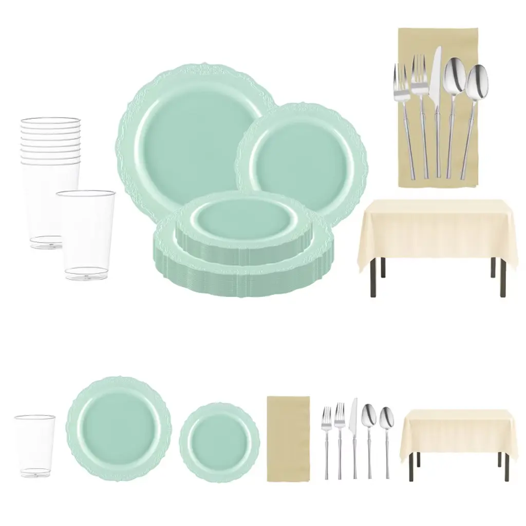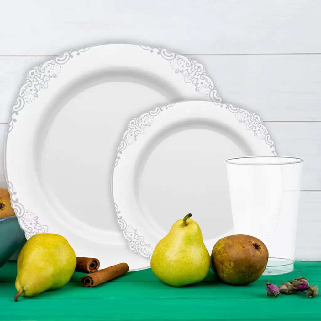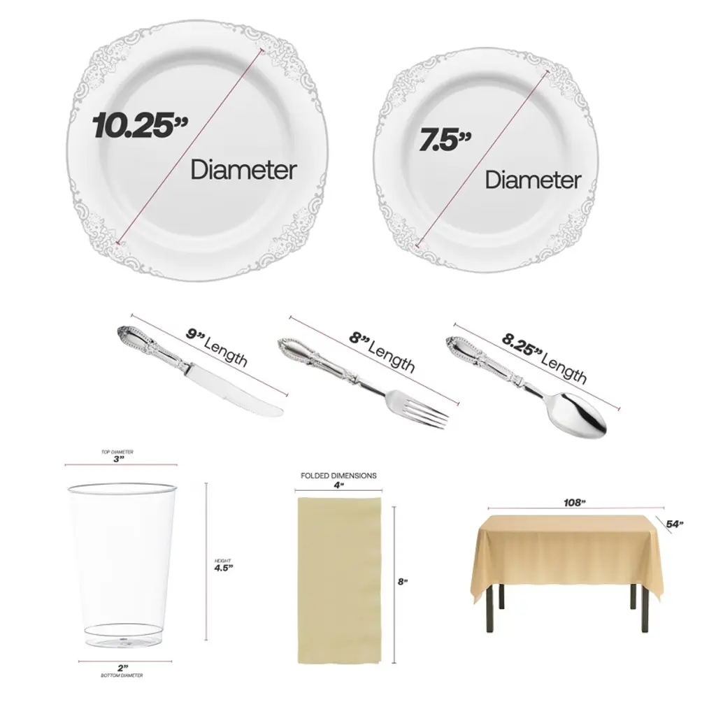 Host large gatherings with ease using this service for 60 disposable dinnerware set, designed with white plates accented by elegant silver trim and complemented by polished silver flatware. The set includes gold tablecloths and ivory napkins that add a touch of luxury to weddings, banquets, and formal celebrations. Crafted from BPA-free premium plastic, this dinnerware delivers upscale style with the practicality of quick cleanup, making it ideal for both intimate and grand events.