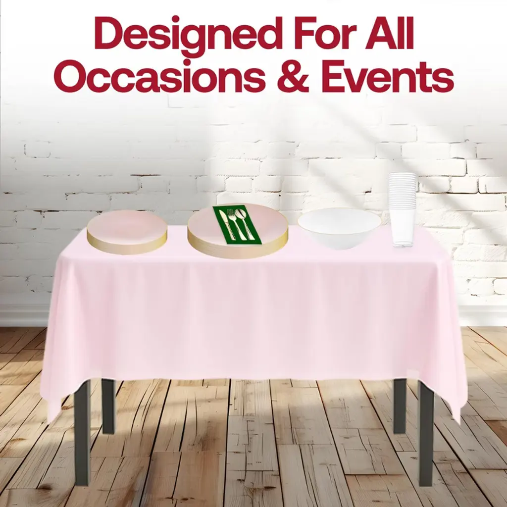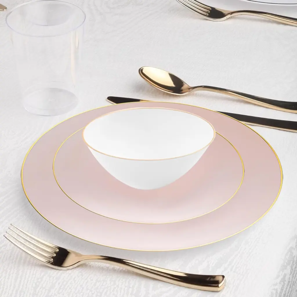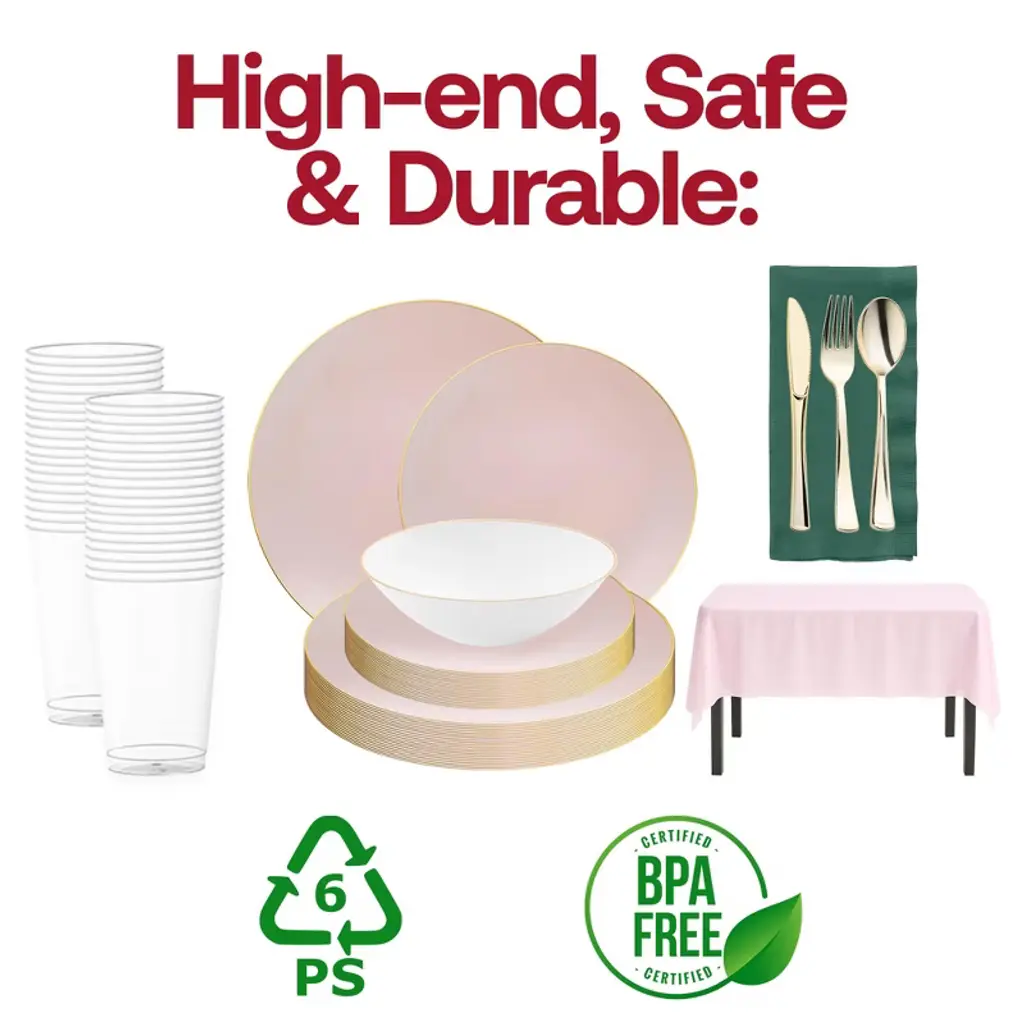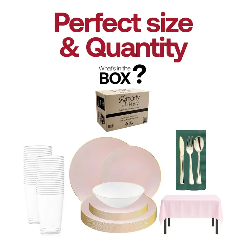 Celebrate in style with this service for 20 pink with gold dinnerware set, featuring dinner plates, salad plates, and dessert bowls accented in elegant metallic trim. Coordinated with gold flatware, pink tablecloths, hunter green napkins, and clear cups, this set brings sophistication and vibrant charm to weddings, birthdays, showers, and special events. Made from durable, BPA-free plastic, it combines upscale design with easy cleanup for a stress-free hosting experience.