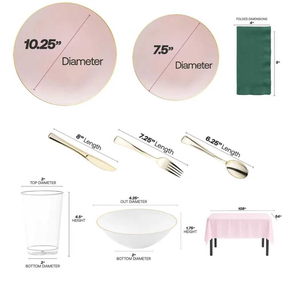 Host larger gatherings with ease using this service for 60 pink with gold dinnerware set, complete with dinner plates, salad plates, dessert bowls, gold flatware, pink tablecloths, hunter green napkins, and clear cups. Perfect for weddings, birthdays, showers, and holiday events, this stylish set combines elegant pink and gold accents with durable BPA-free plastic for a premium look and effortless cleanup. Designed to impress while keeping entertaining stress-free.