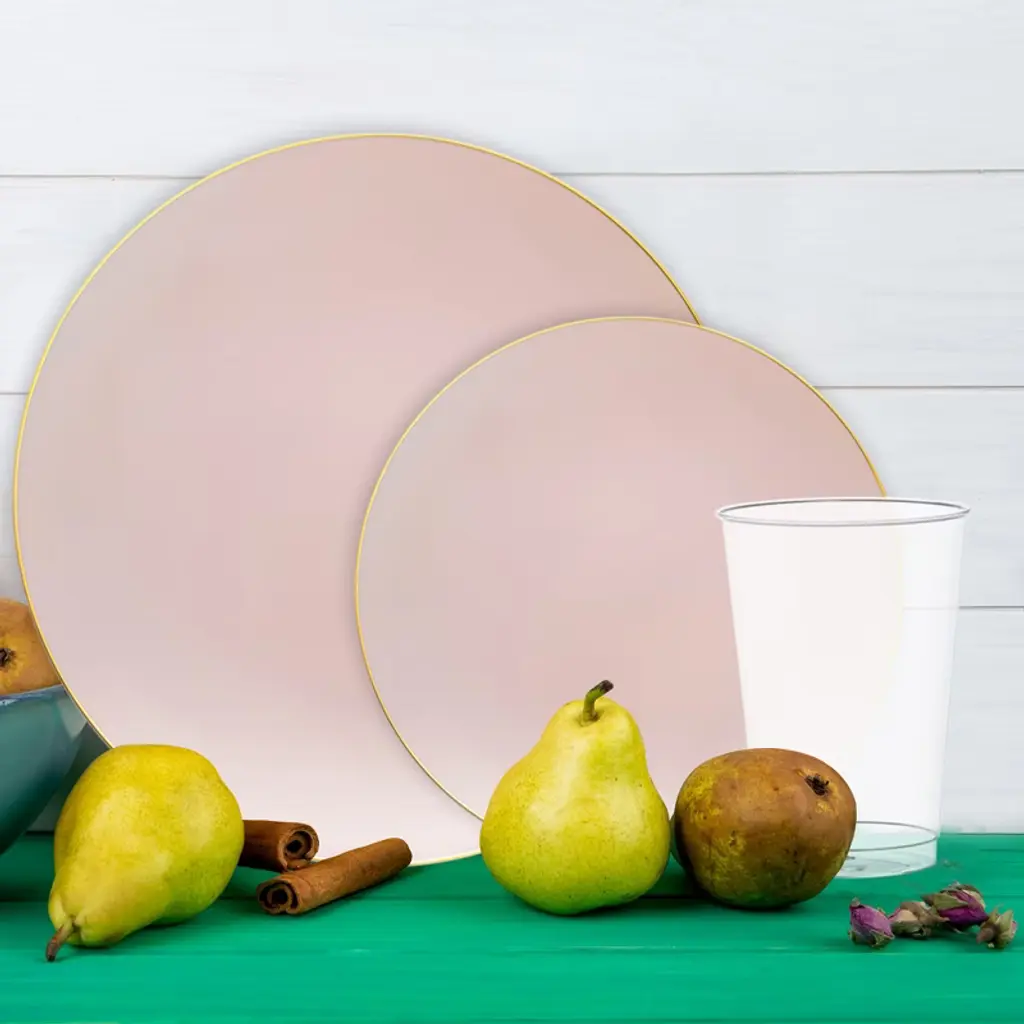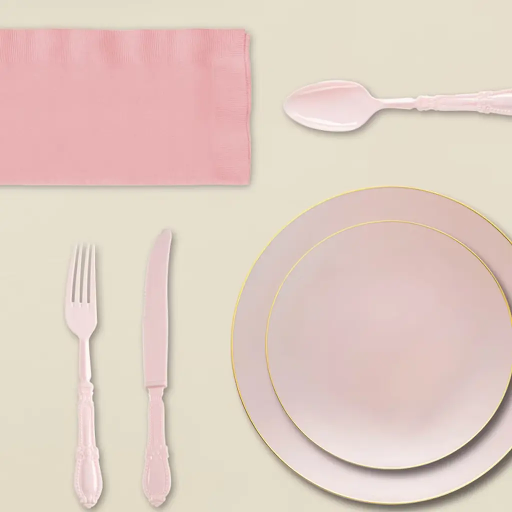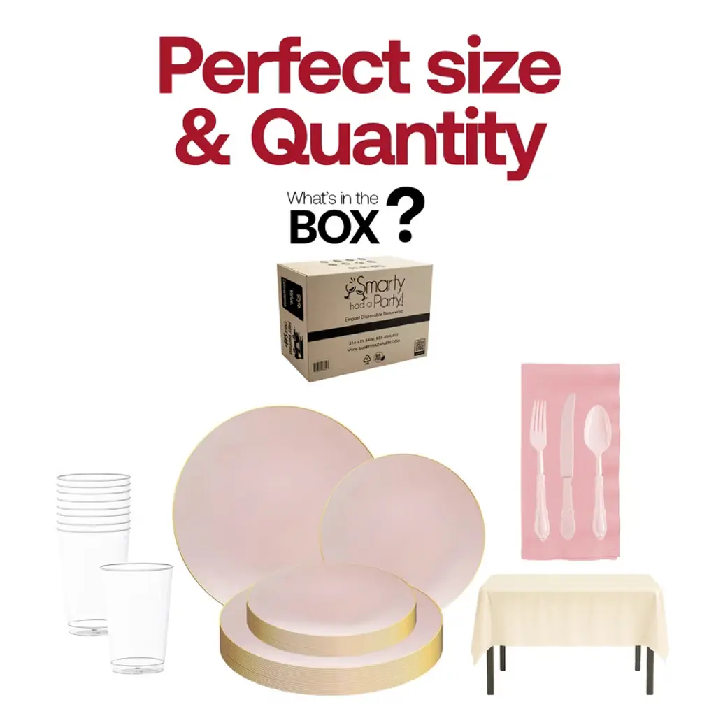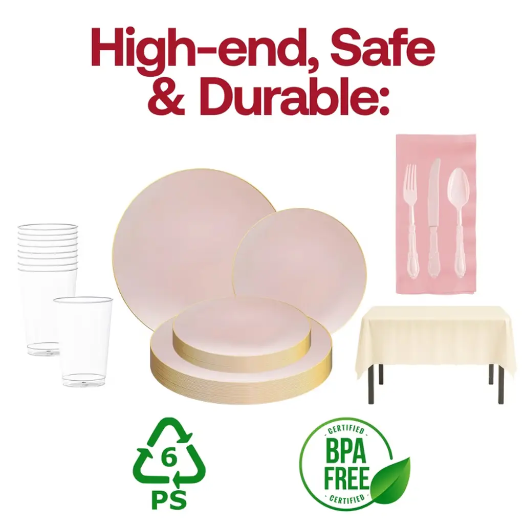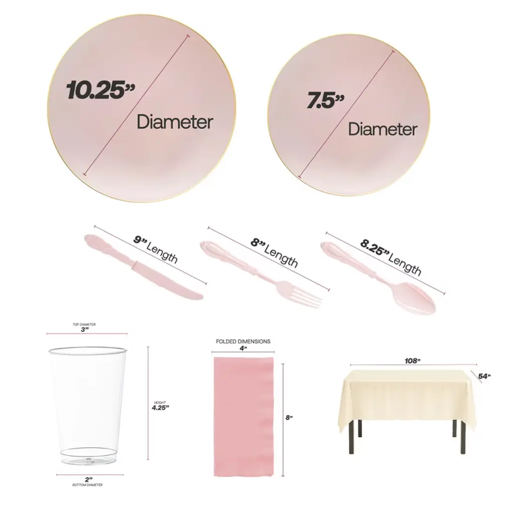 Host unforgettable events with this service for 60 pink with gold dinnerware set, featuring elegant dinner plates, salad plates, matching pink flatware, ivory tablecloths, pink napkins, and clear cups. Perfect for weddings, birthdays, bridal showers, and upscale gatherings, this set combines modern elegance with disposable convenience. Crafted from strong, BPA-free plastic, it offers reliable durability while maintaining a refined presentation, making cleanup effortless after your celebration.