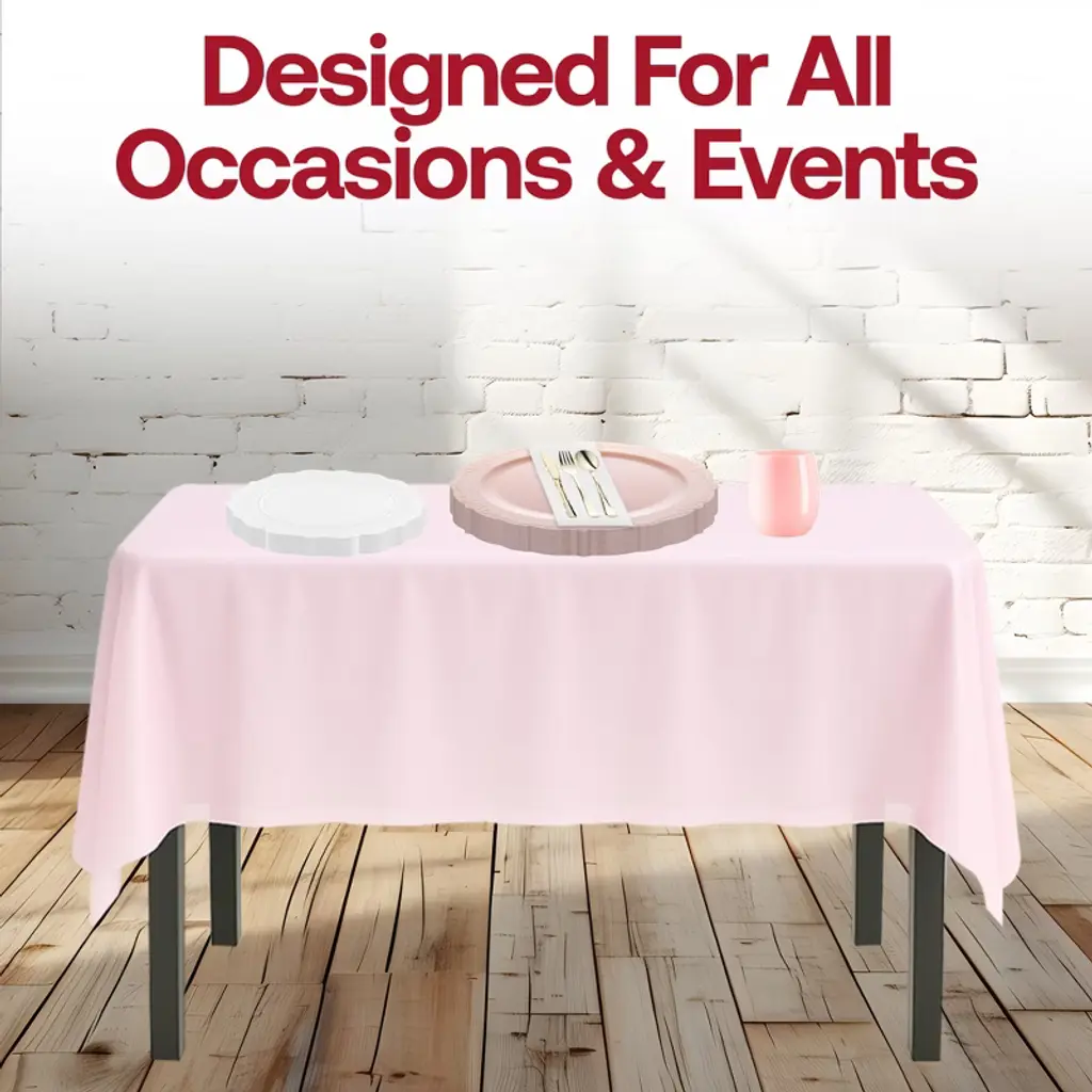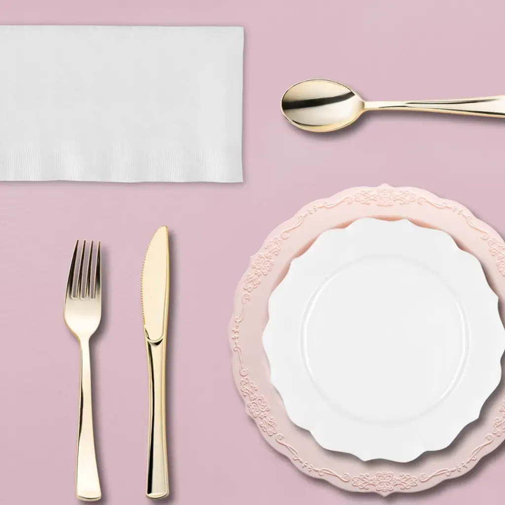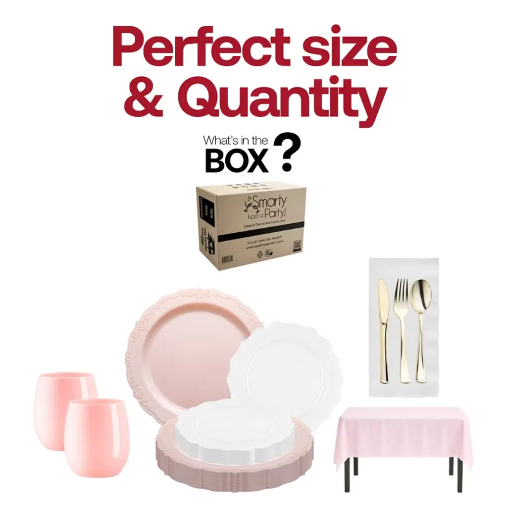 Celebrate in style with this service for 60 disposable dinnerware set in pink, white, and gold. Designed for weddings, birthdays, and large gatherings, this complete set includes pink dinner plates, white salad plates, gold flatware, pink tablecloths, white napkins, pink cups, and wine glasses. Crafted from sturdy BPA-free plastic, it ensures a luxurious look while keeping setup simple and cleanup stress-free, making it the perfect choice for elegant yet convenient entertaining.