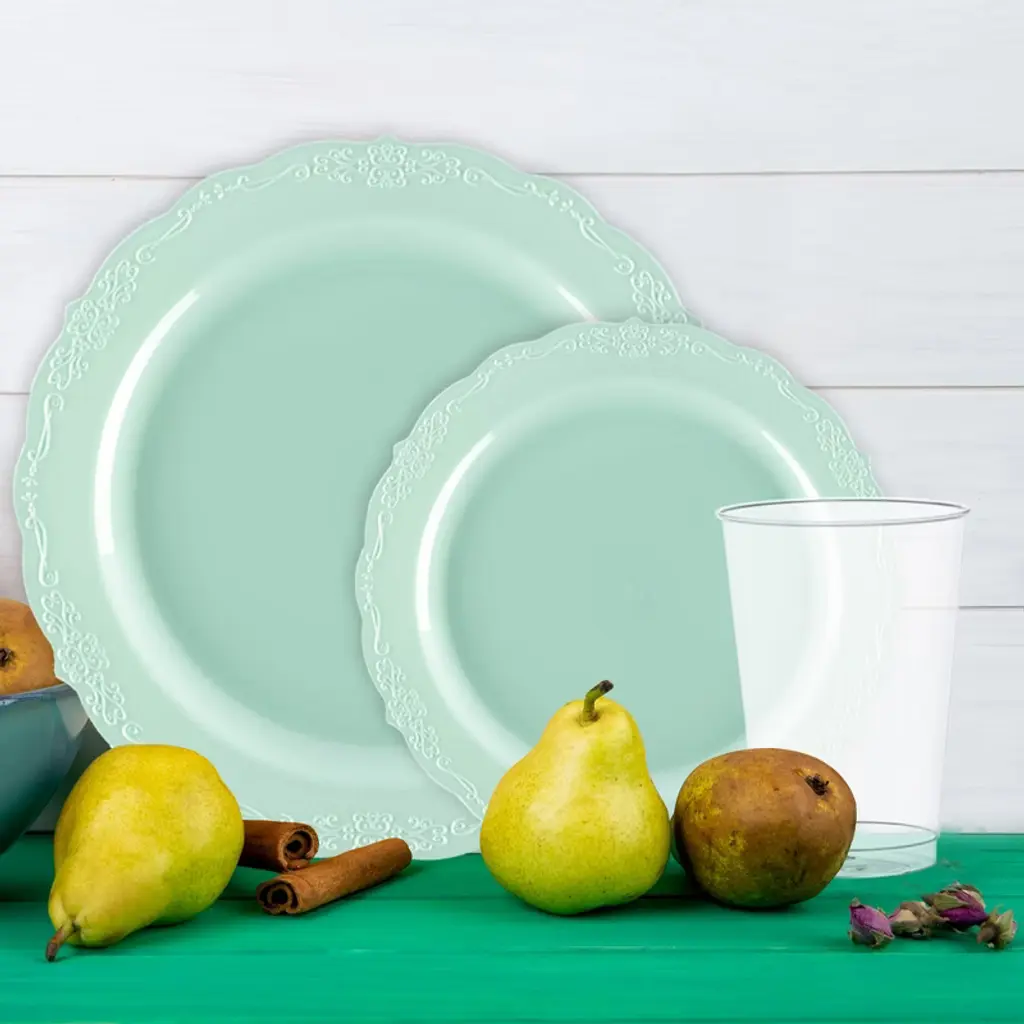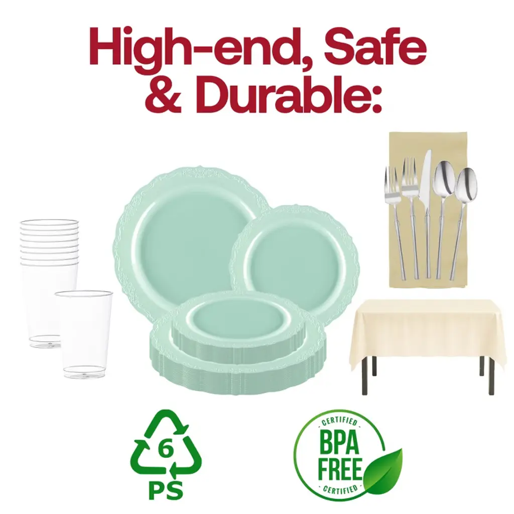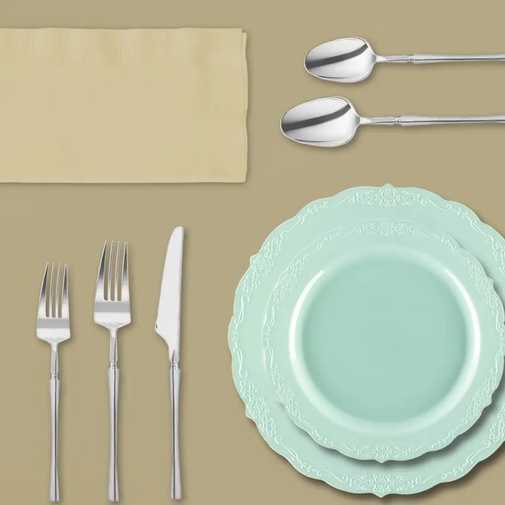 Add a refreshing touch of color to your events with this service for 20 turquoise dinnerware set with silver flatware. Featuring turquoise dinner and salad plates, silver utensils including dessert spoons and forks, ivory napkins, matching tablecloths, and clear cups, this complete set combines elegance with convenience. Crafted from premium BPA-free plastic, it offers durability and a polished look, making it ideal for weddings, birthdays, showers, and special gatherings where style meets effortless cleanup.