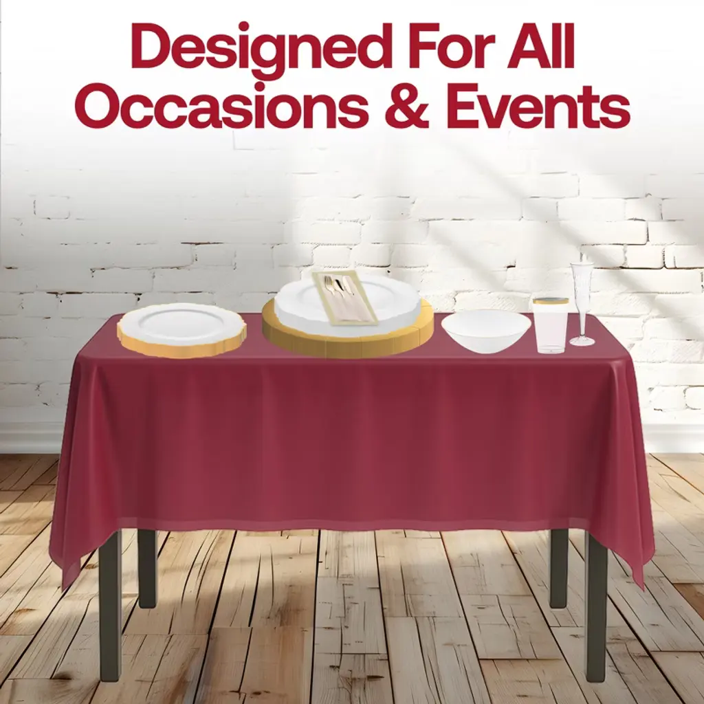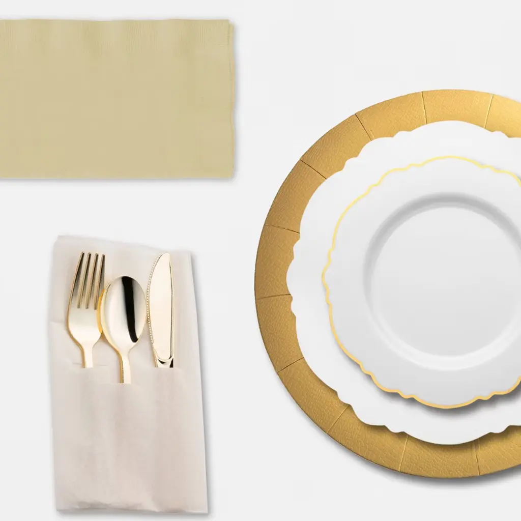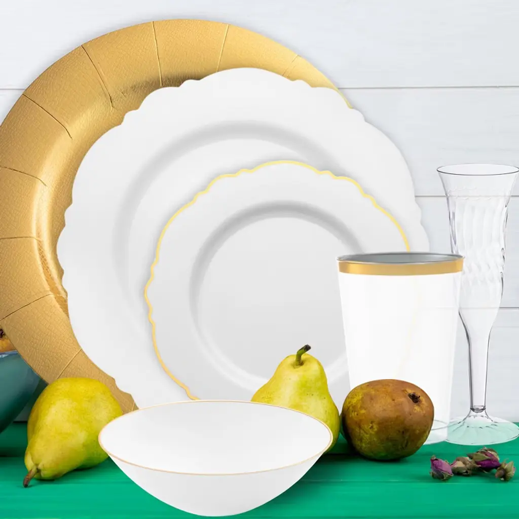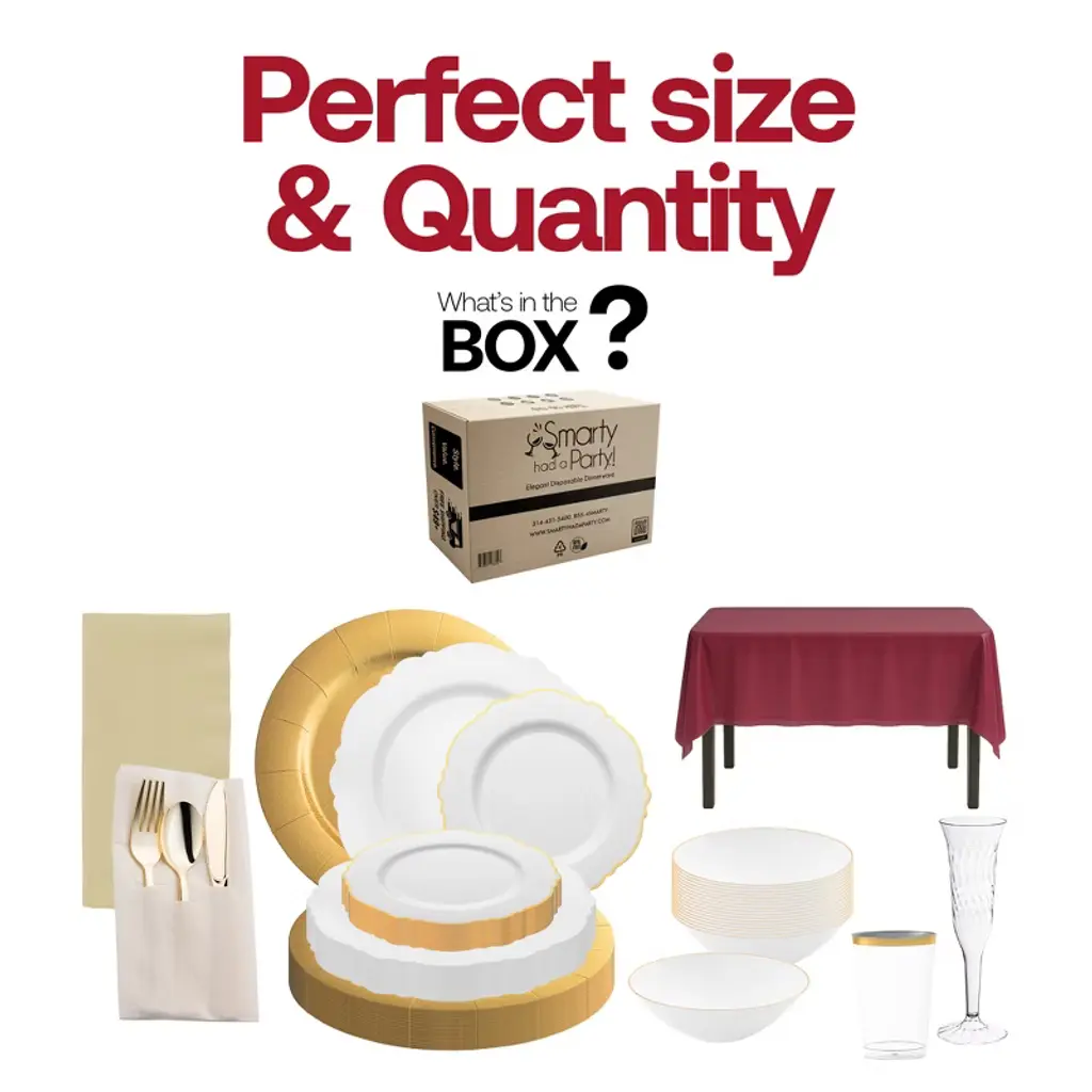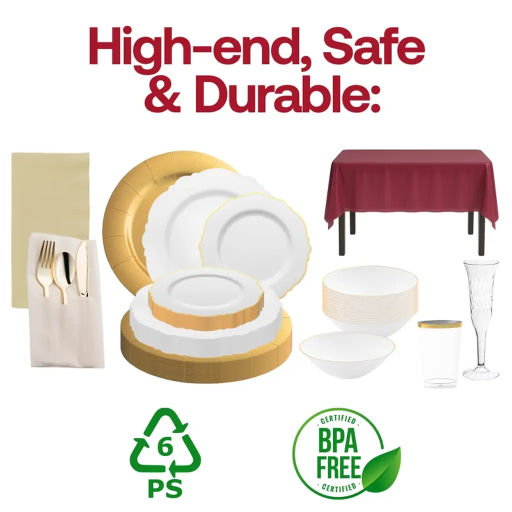 Make your event unforgettable with this service for 50 dinnerware set with gold charger plates and white dinnerware. Designed to impress, it includes elegant white dinner and salad plates with gold accents, matching soup bowls, premium gold flatware, ivory napkins, burgundy tablecloths, and clear gold-trimmed cups. Complete with champagne flutes for toasts, this set combines sophistication and convenience. Crafted from durable BPA-free plastic, it’s perfect for weddings, banquets, birthdays, and upscale celebrations—offering a stunning table setting with hassle-free cleanup.