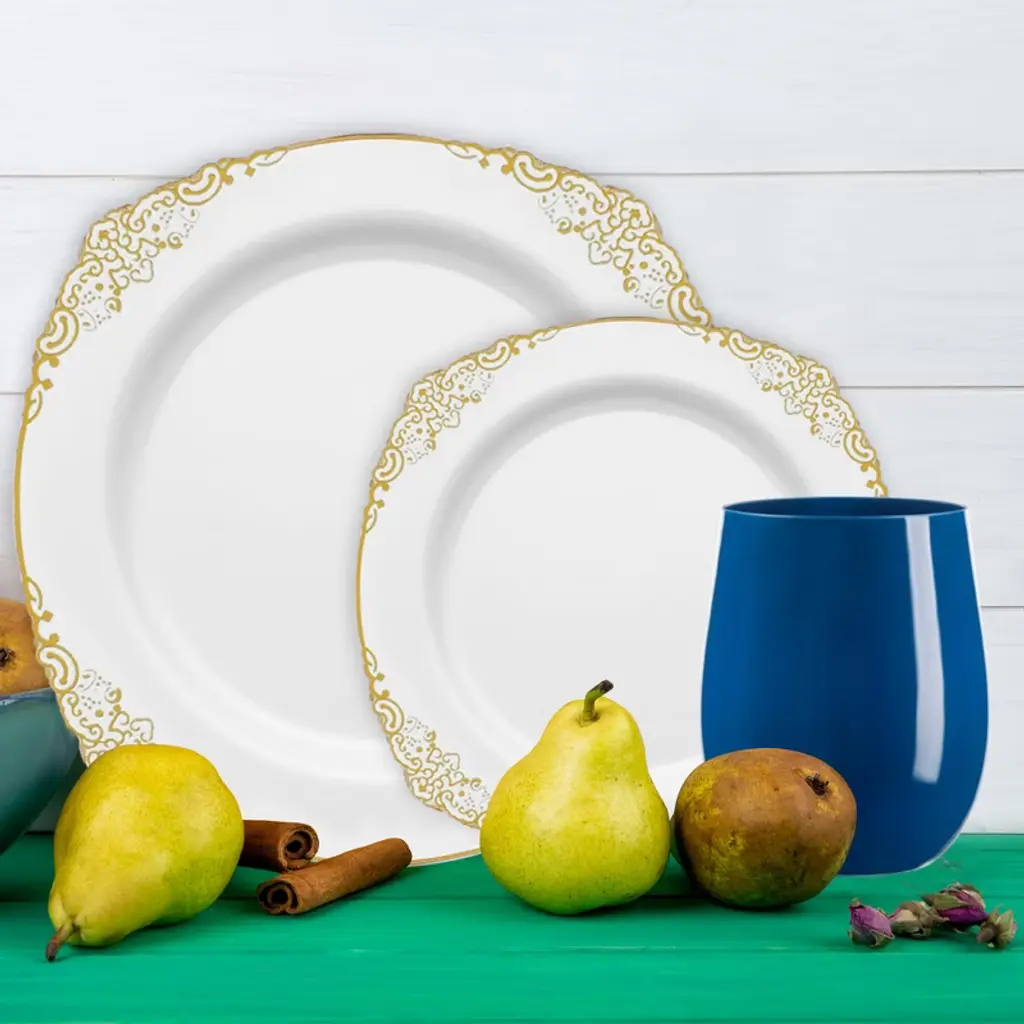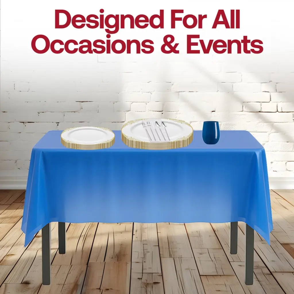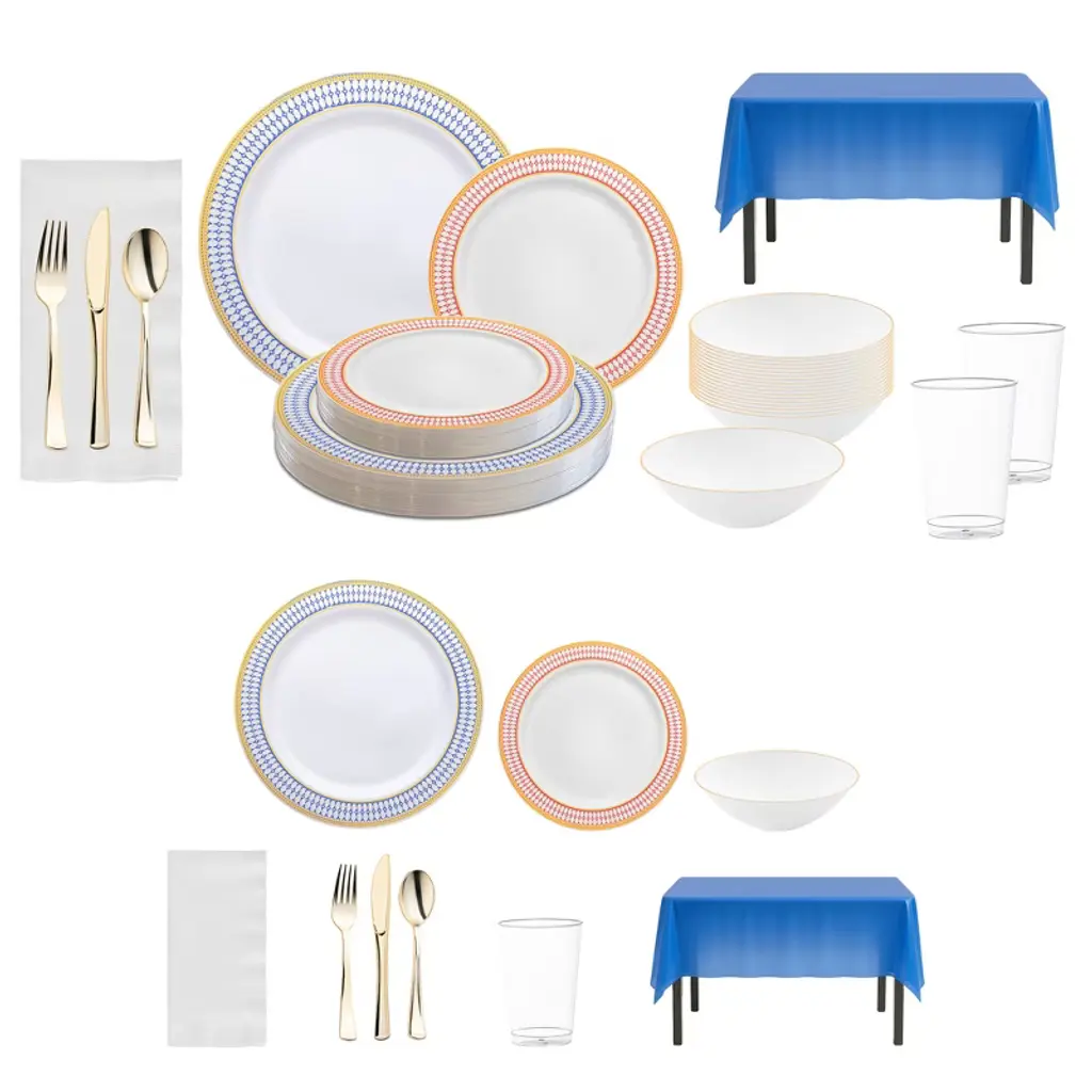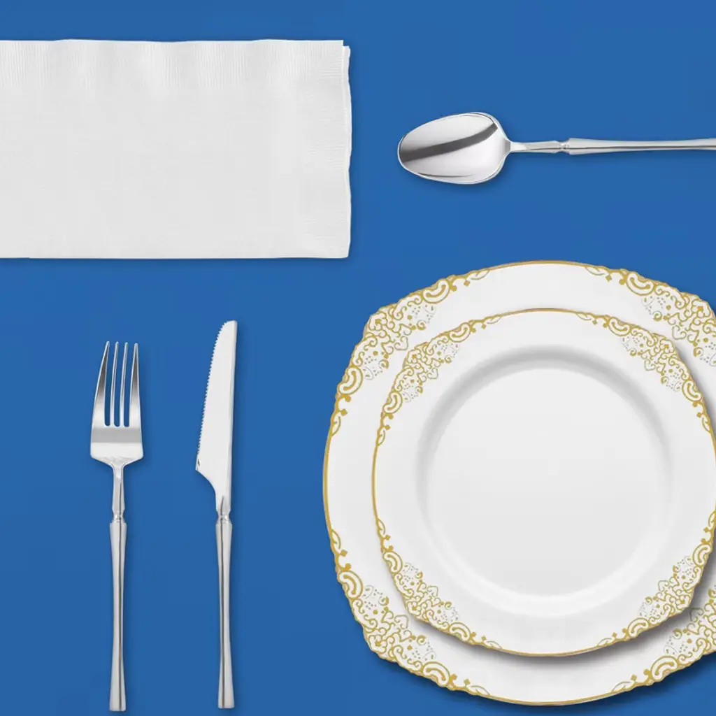 Host large gatherings in style with this service for 60 dinnerware set featuring white with gold plates and silver flatware. Designed for elegance and convenience, the set includes dinner plates, salad plates, dessert forks and spoons, full cutlery, napkins, navy cups, wine glasses, and coordinating navy tablecloths. Each piece is crafted from durable BPA-free plastic that mimics fine china while ensuring easy cleanup. Perfect for weddings, corporate events, anniversaries, or family celebrations, this collection brings timeless sophistication to any occasion.