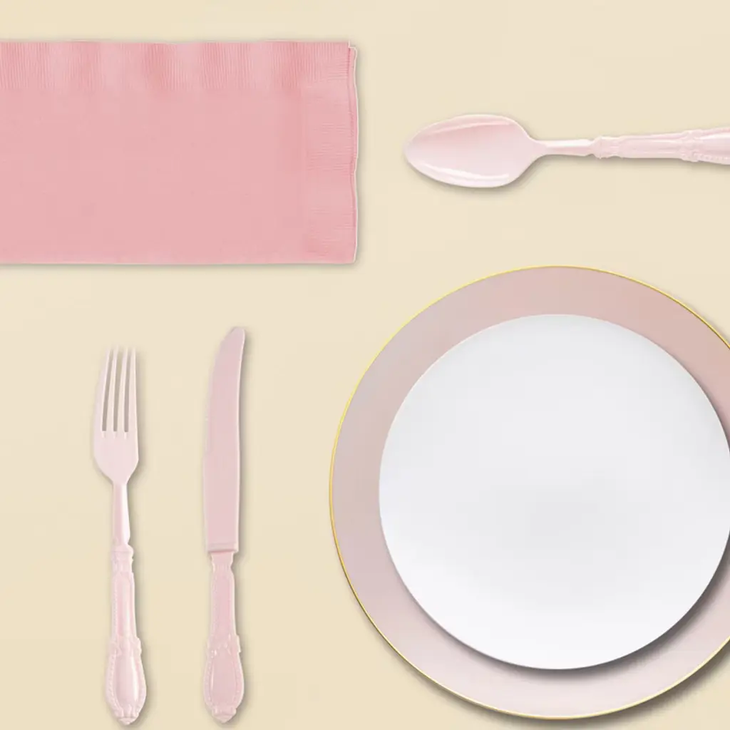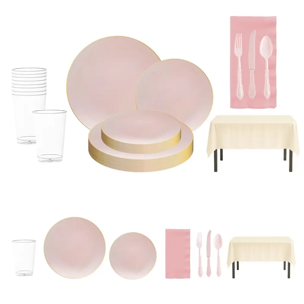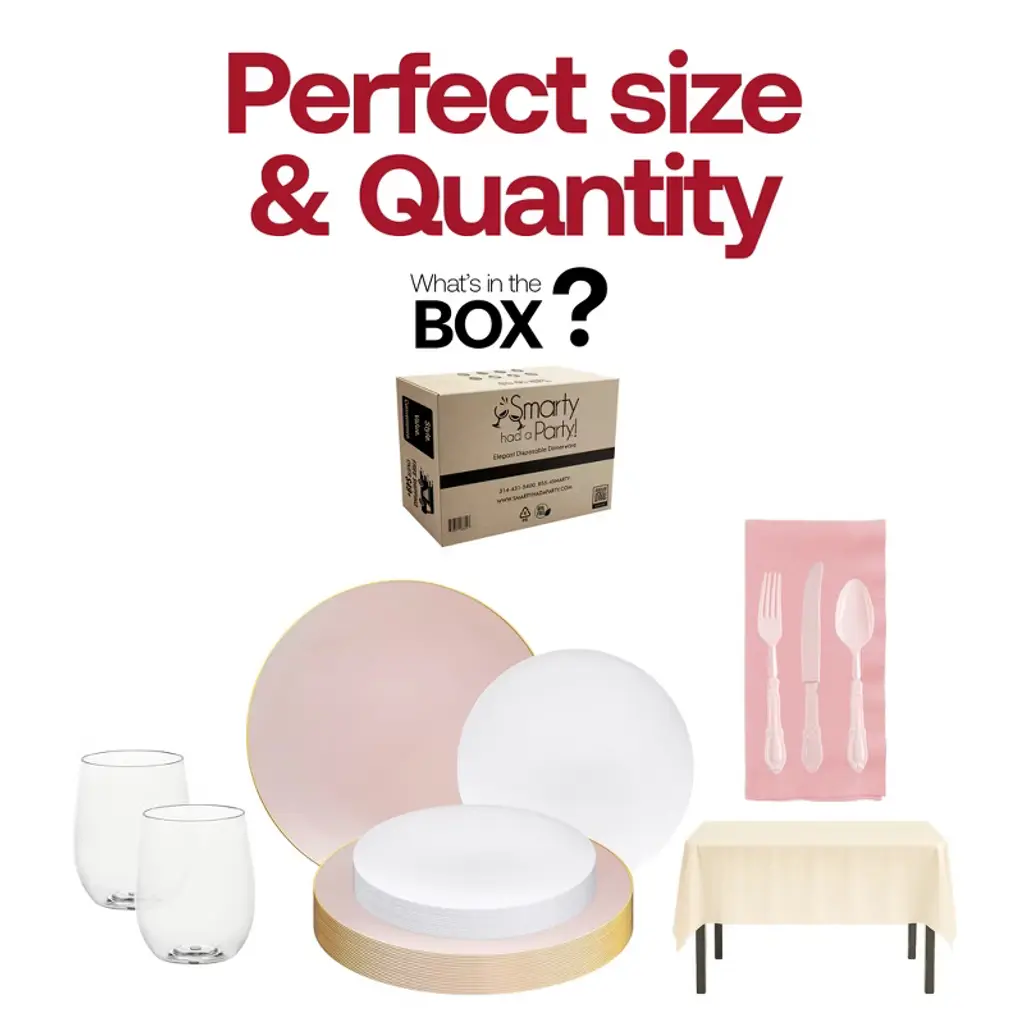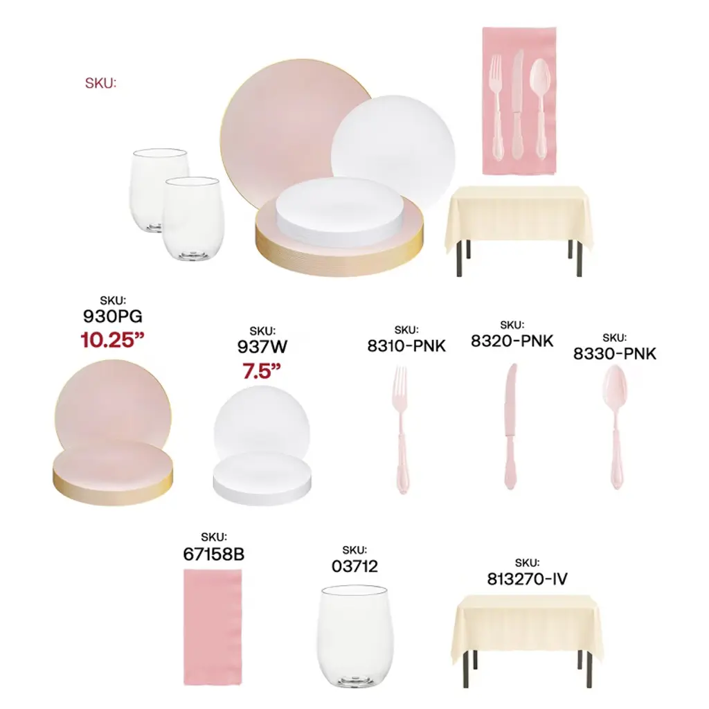 Host in style with this service for 20 pink with gold dinnerware set, complete with matching pink flatware, ivory tablecloths, and soft pink napkins. Featuring pink with gold dinner plates, white salad plates, and clear wine glasses, this set adds elegance and charm to weddings, birthdays, bridal showers, and romantic celebrations. Made from durable BPA-free plastic, it offers the upscale look of real dinnerware with the ease of disposable convenience for quick cleanup.