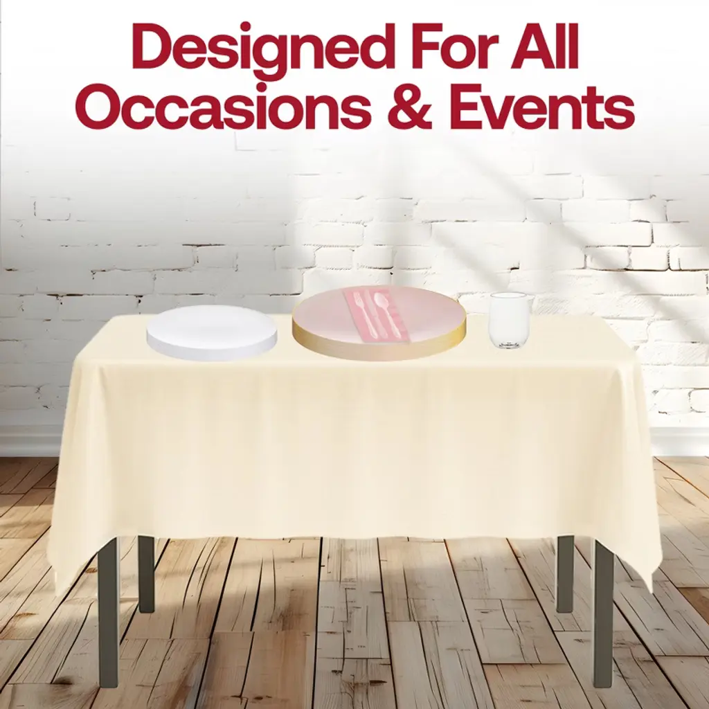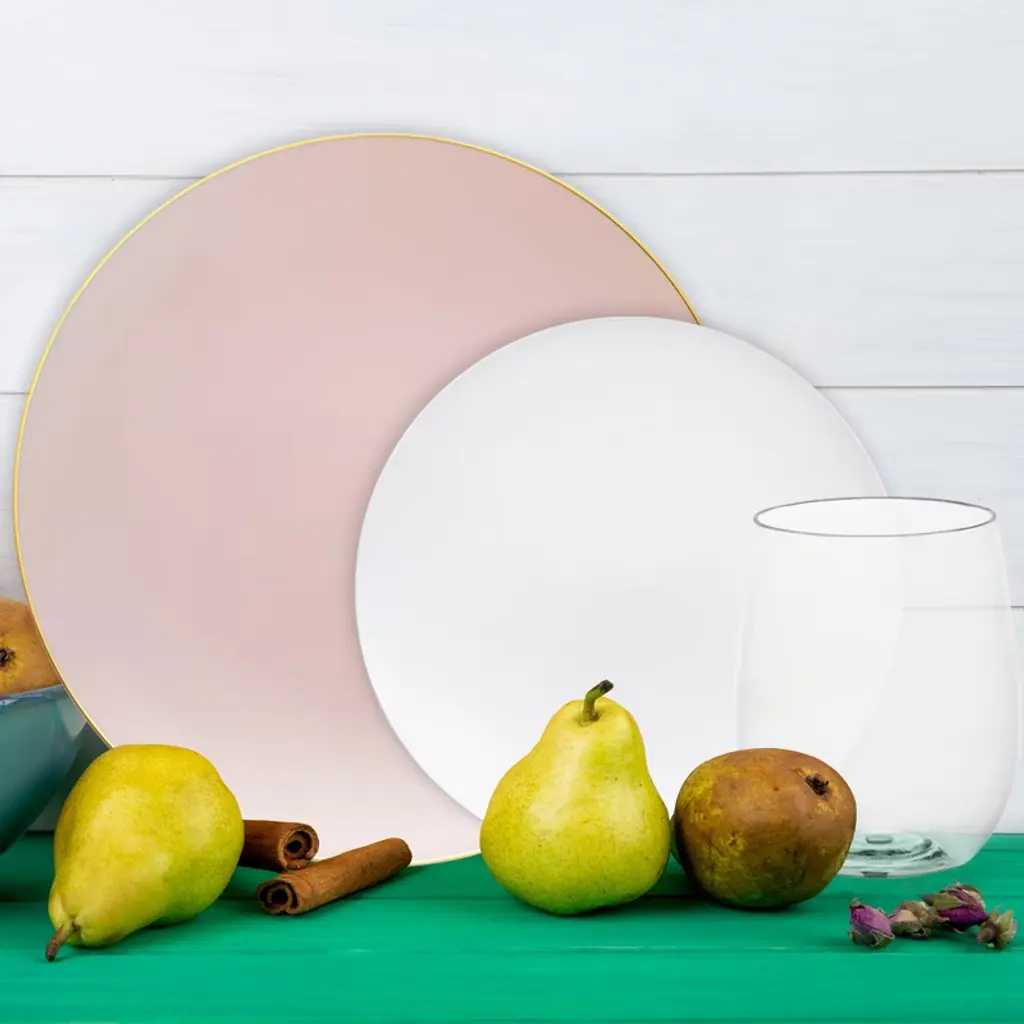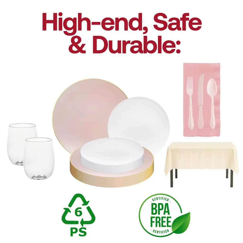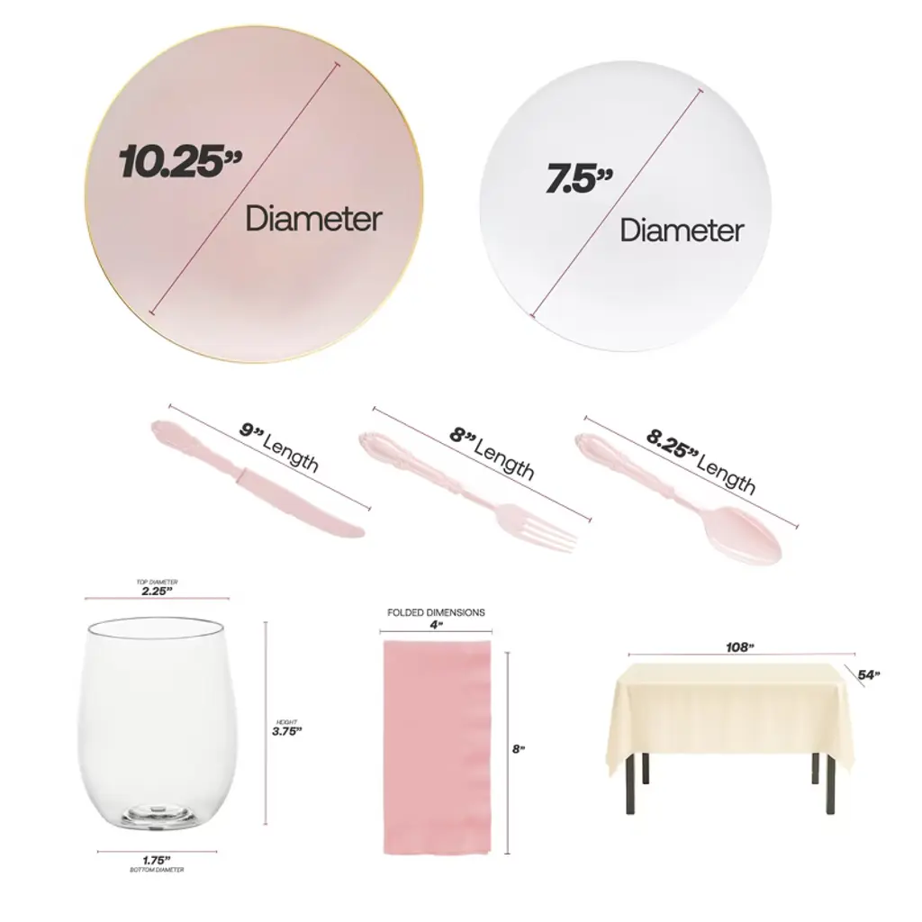 Celebrate in elegance with this service for 60 dinnerware set, designed to impress guests with its modern pink and gold accents. Featuring pink with gold dinner plates, crisp white salad plates, coordinated pink flatware, ivory tablecloths, and pink napkins, this set creates a refined and romantic tablescape. Clear wine glasses add the finishing touch, making it ideal for weddings, bridal showers, birthdays, and special events. Made from durable BPA-free plastic, it provides the upscale look of real dinnerware with the convenience of disposable use for quick and easy cleanup.