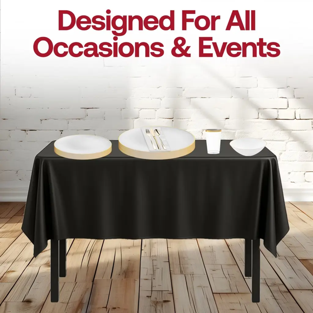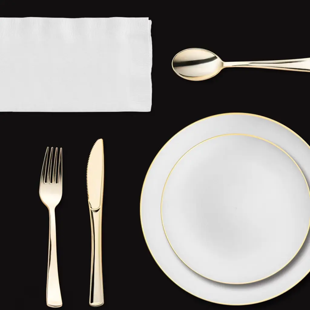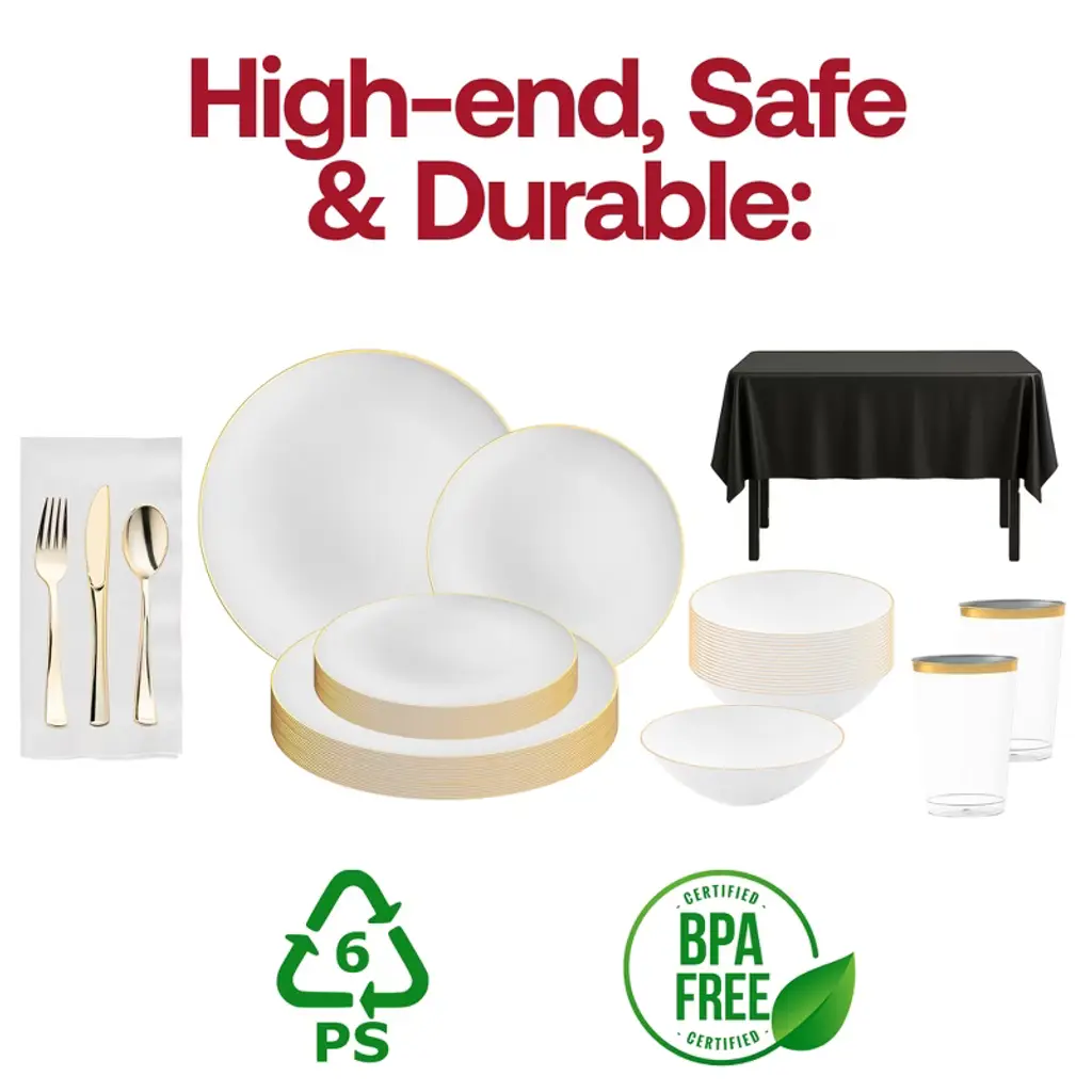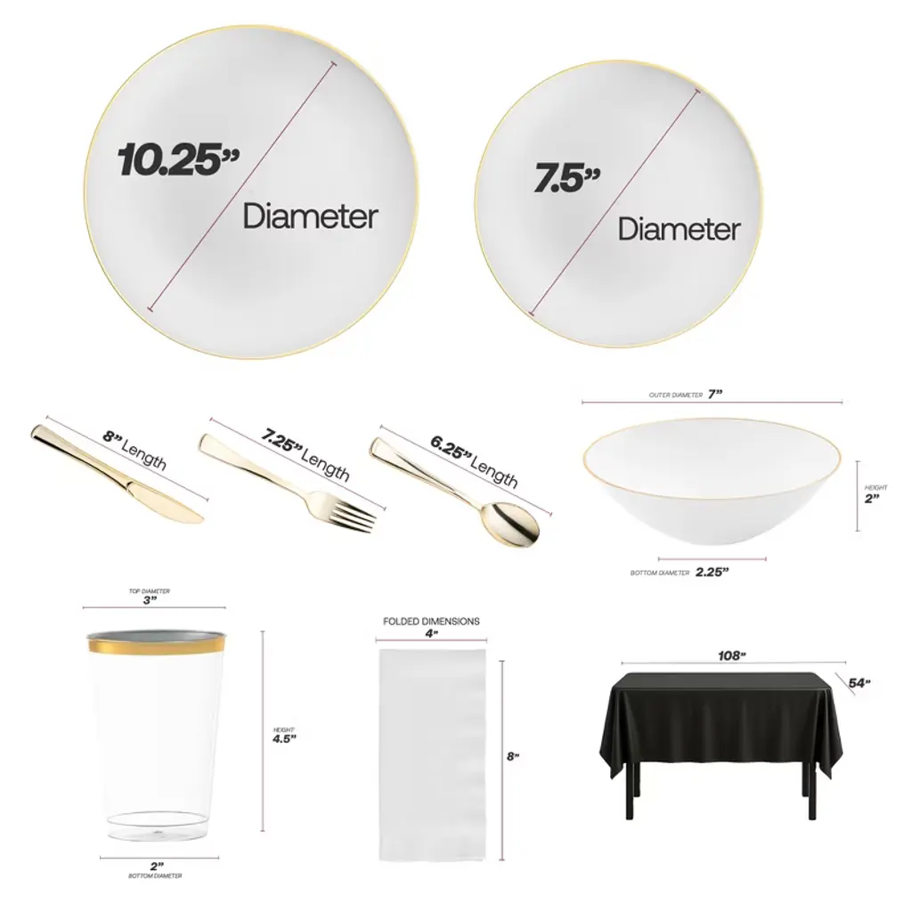 Host your event in timeless elegance with this service for 20 disposable dinnerware set, featuring white with gold dinner and salad plates, matching dessert bowls, and luxurious gold flatware. Coordinated with black tablecloths, crisp white buffet napkins, and clear tumblers with gold trim, this set creates a polished and upscale tablescape. Perfect for weddings, birthdays, anniversaries, and formal gatherings, it combines premium style with the convenience of BPA-free disposable plastic, ensuring effortless cleanup without sacrificing sophistication.