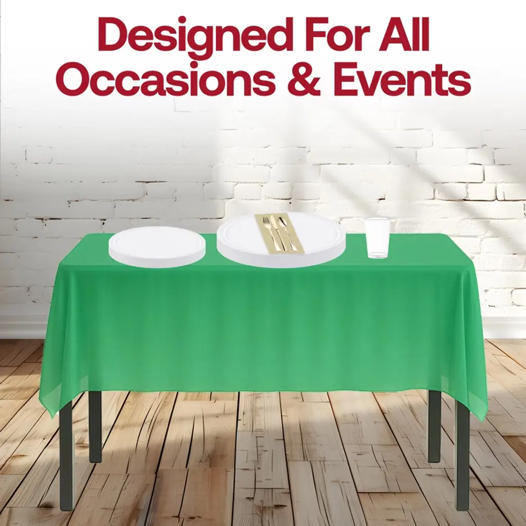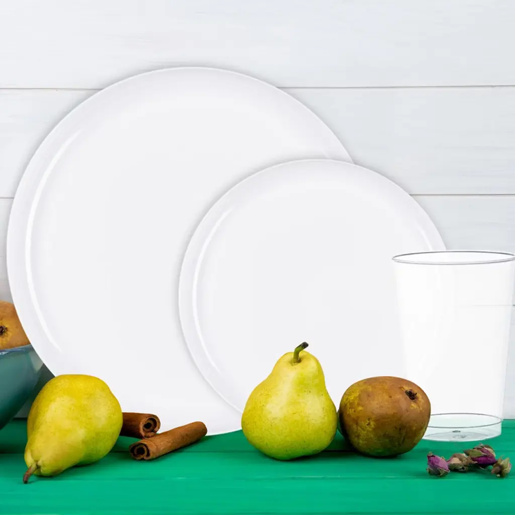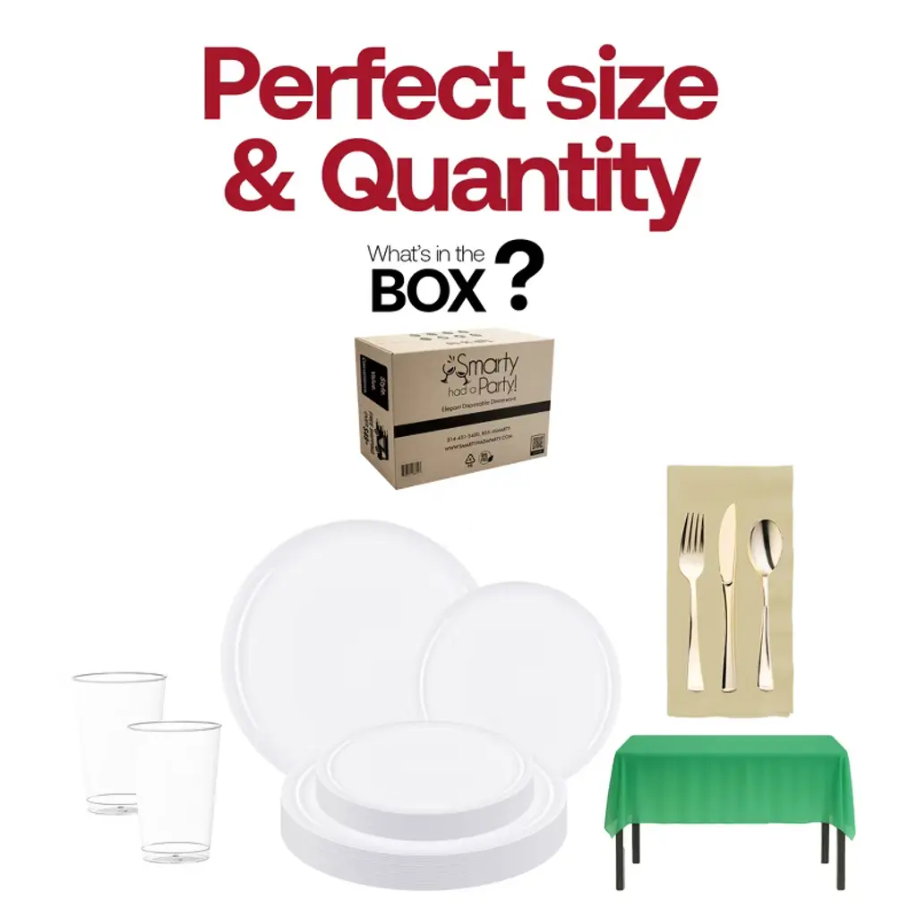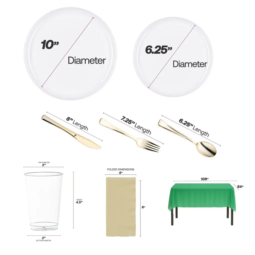 Create a refined dining experience with this service for 60 disposable dinnerware set, featuring elegant white dinner and pastry plates, coordinated gold flatware, hunter green tablecloths, and ivory napkins for a sophisticated contrast. The clear cups add practicality while complementing the set’s elegant design. Perfect for weddings, birthdays, anniversaries, or corporate gatherings, this durable BPA-free plastic set combines upscale presentation with the convenience of quick cleanup.