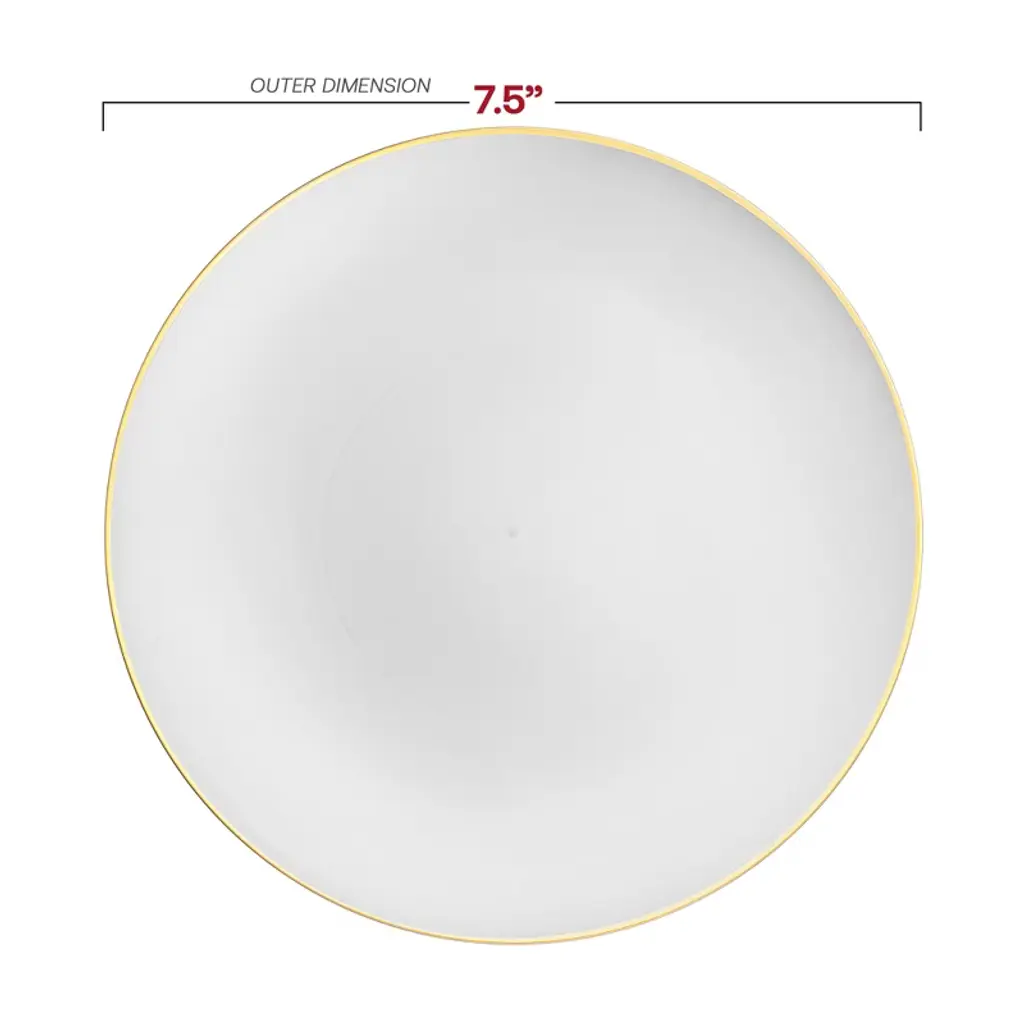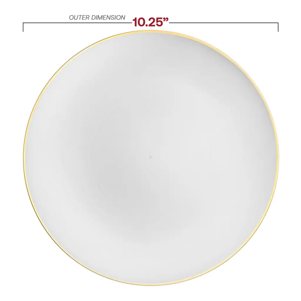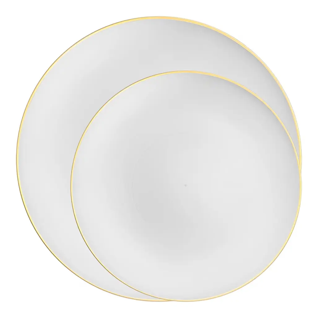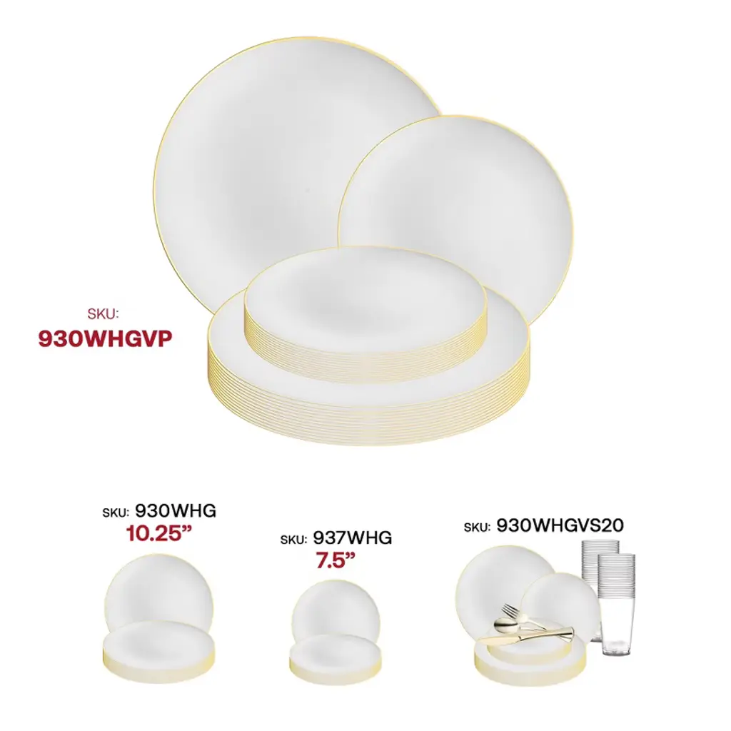 The simple elegance of the white with gold rim organic round disposable plastic dinnerware value set makes it a welcome addition to any dinner table. This white plate features an elegant gold edge, giving it just a touch of classy detail. In addition, these high-quality plastic plates are recyclable and come available in bulk sizes to help you save time and money.
