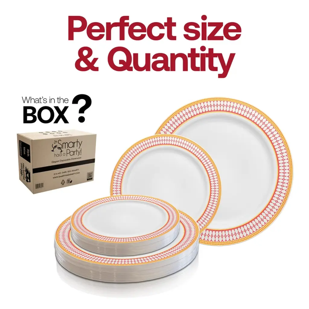 Smarty Had A Party White W/ Red And Gold Chord Rim Plastic Dinnerware Set - 120 Sets