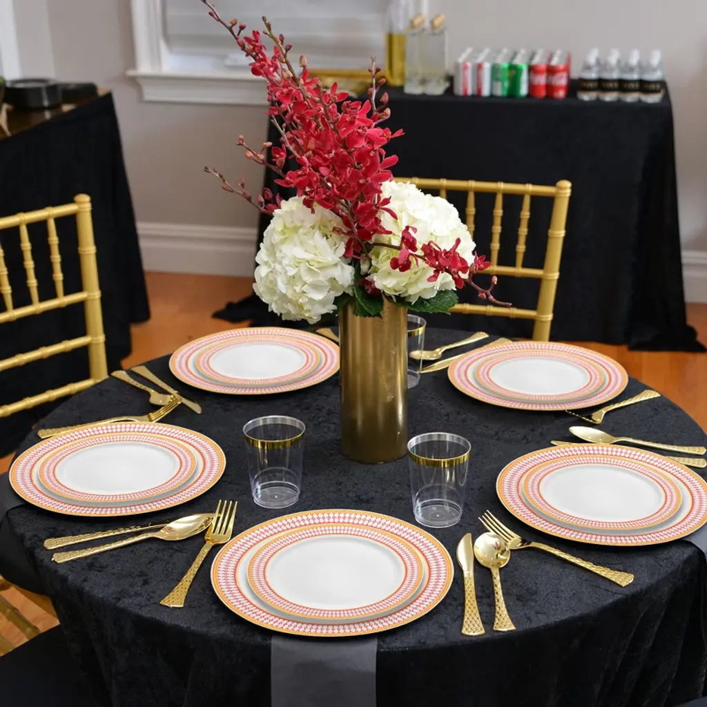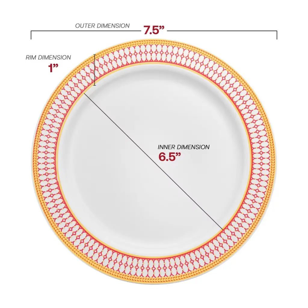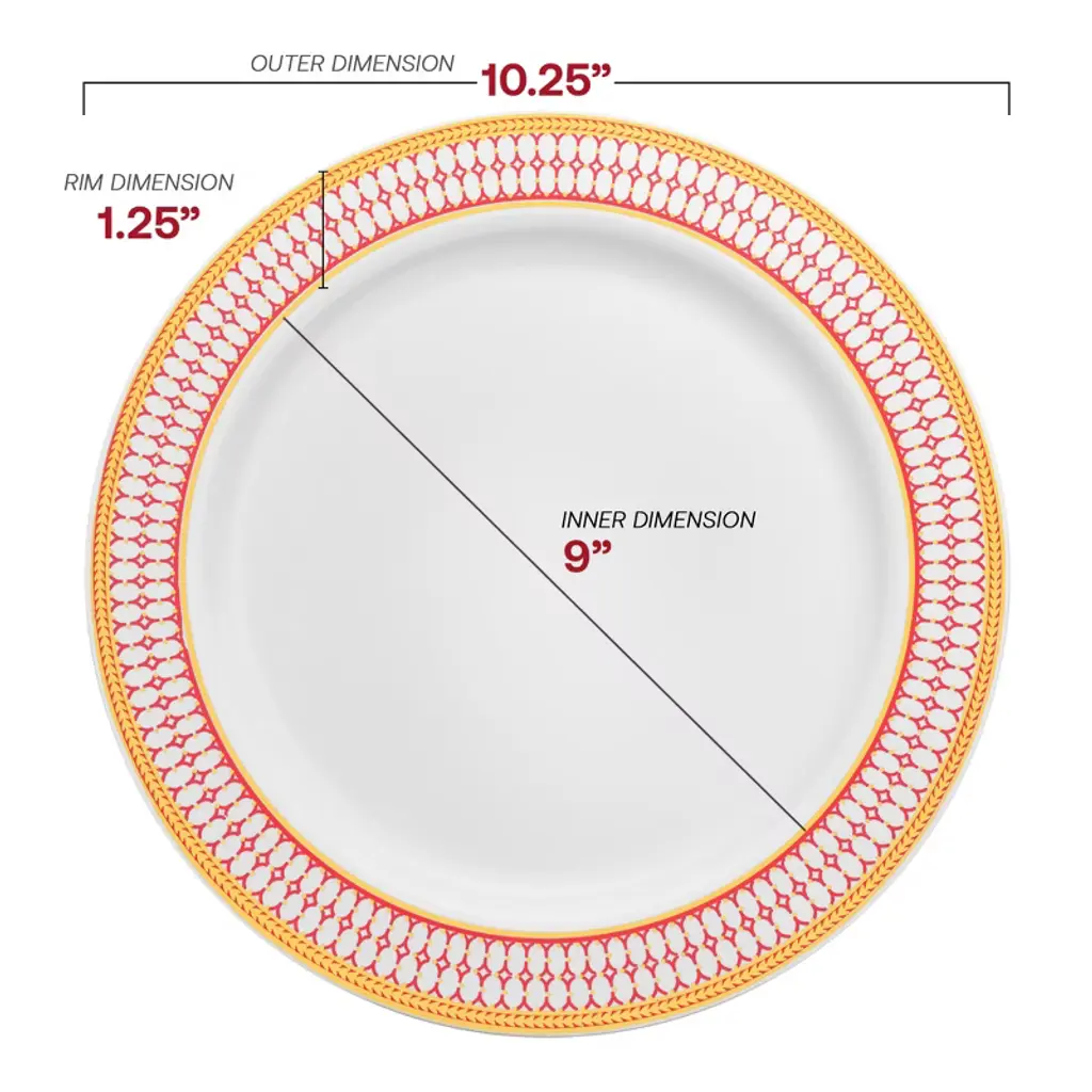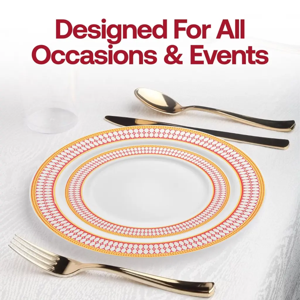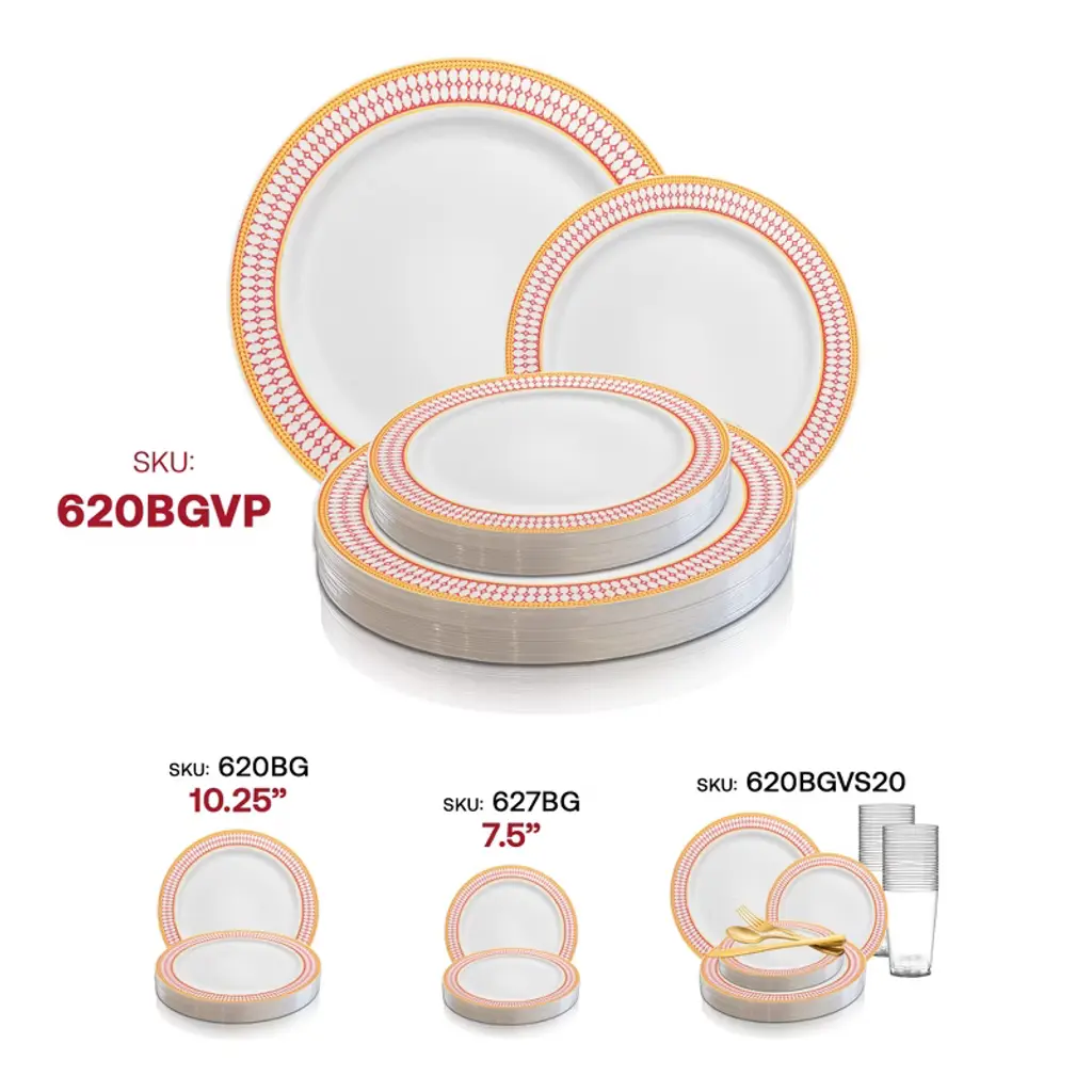 Indulge in regal dining experiences with this splendid disposable plastic wedding value set, encompassing both dinner and salad plates. This gorgeous set pairs the pristine allure of white with intricate red and gold chord rim detailing, exuding opulence and sophistication. Crafted to elevate any occasion, from elegant weddings to lavish dinner parties, each plate offers a seamless blend of luxury and convenience. Whether serving main courses or appetizers, these plates captivate with refined aesthetics and durable plastic construction. Elevate your table setting with this stunning ensemble, ensuring every meal is a feast for the senses, adorned with timeless elegance and charm.