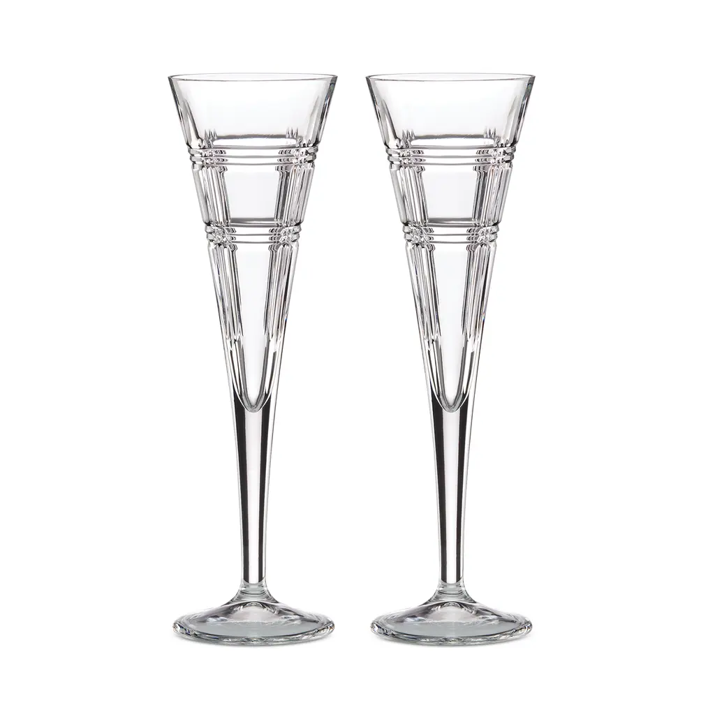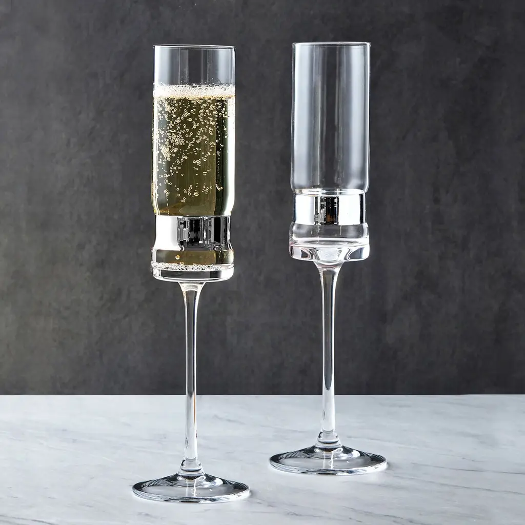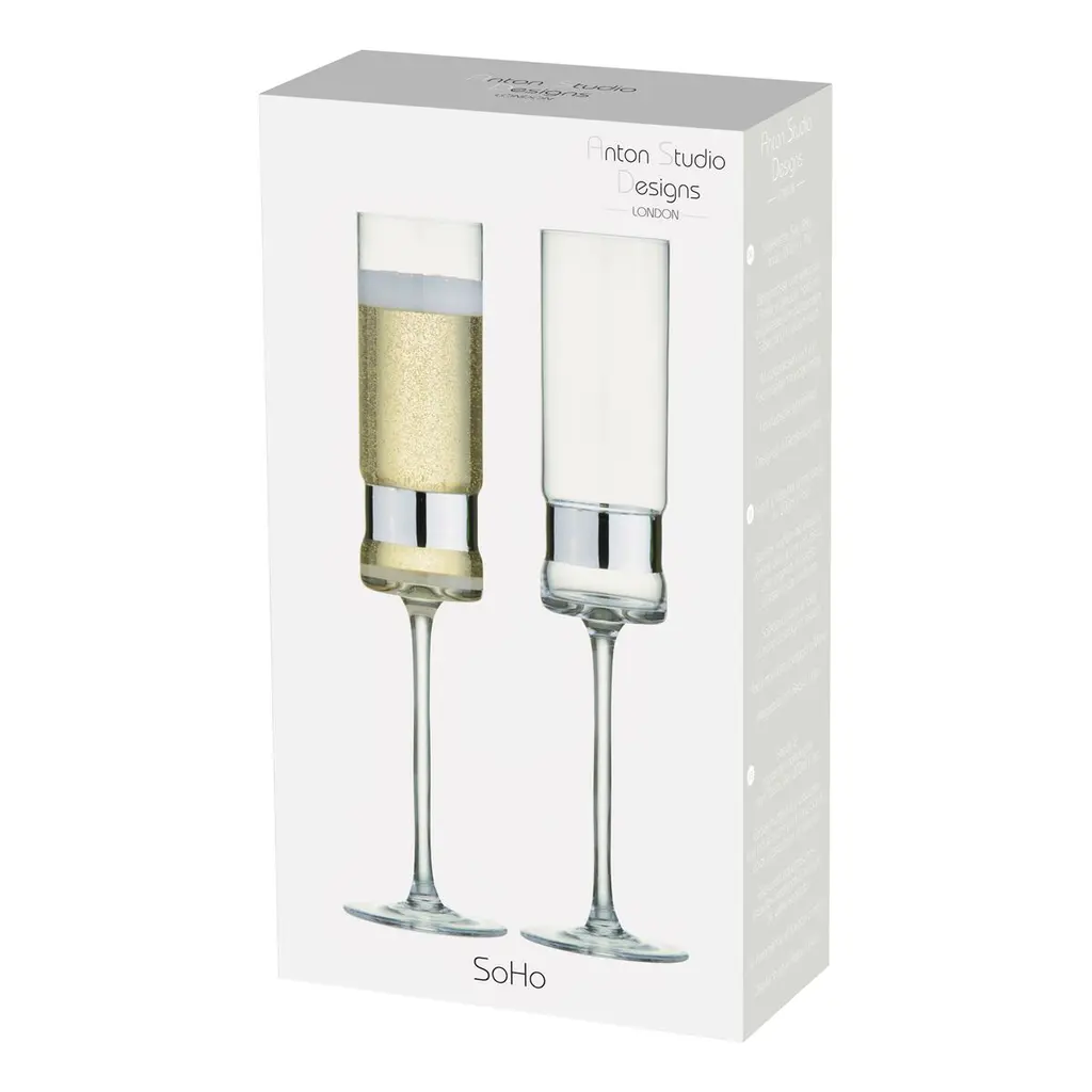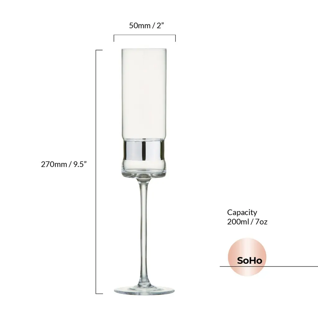 Add a touch of sophistication to your celebrations with SoHo champagne flutes. The bright metallic band adds glamour to the contemporary straight-sided glasses. Mouth blown and handcrafted, these glasses come in a gift box with stunning metallic trim.