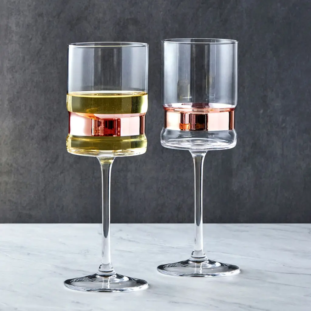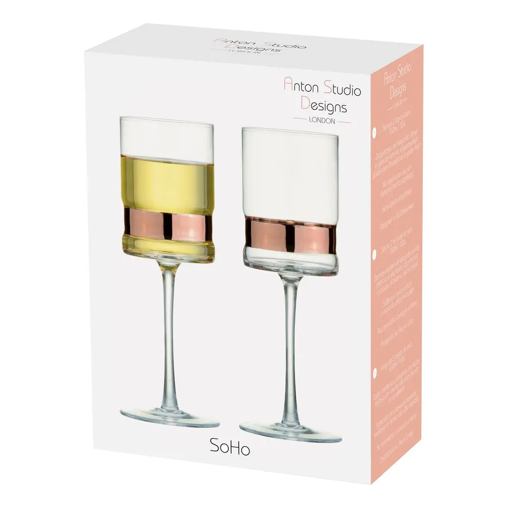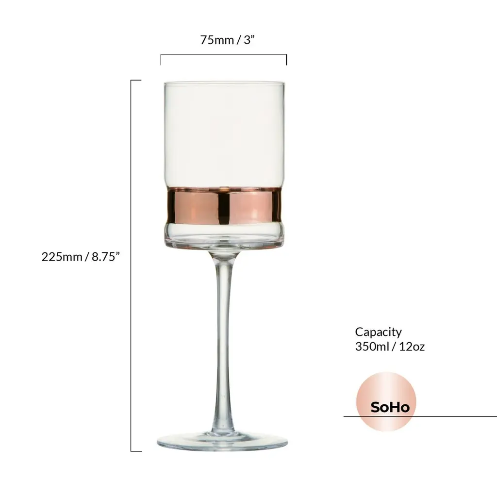 Impress your guests with SoHo wine glasses. The bright metallic band adds a touch of luxury to the contemporary well-rounded glasses. Perfect for any occasion, these glasses come in a gift box with metallic trim.