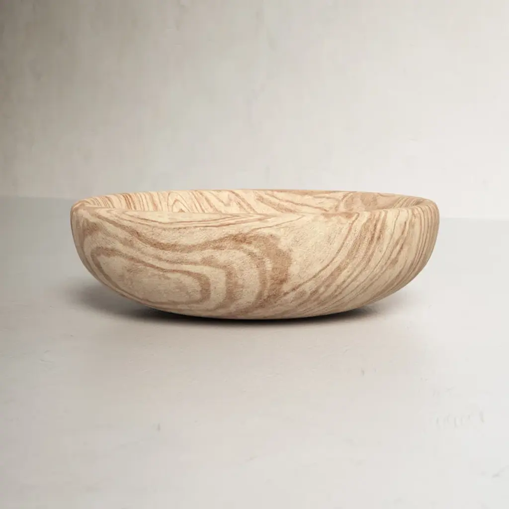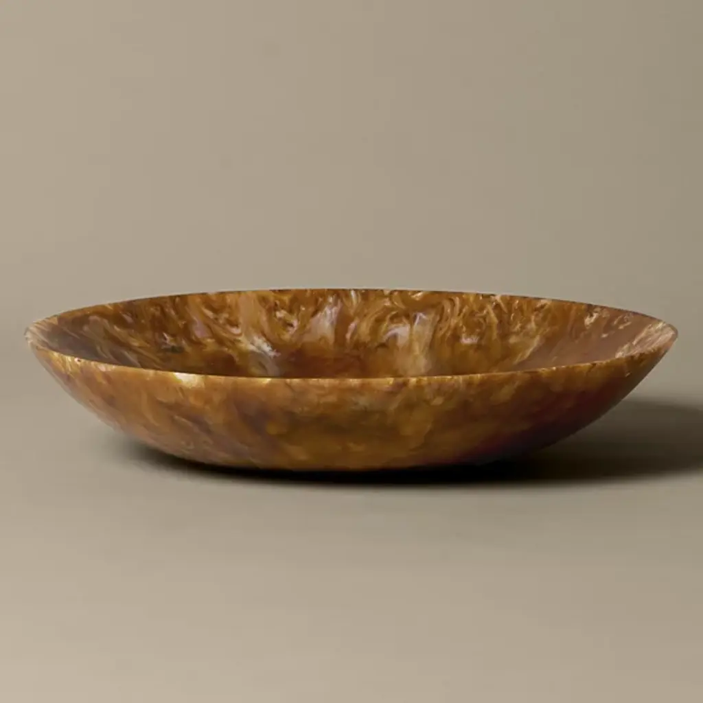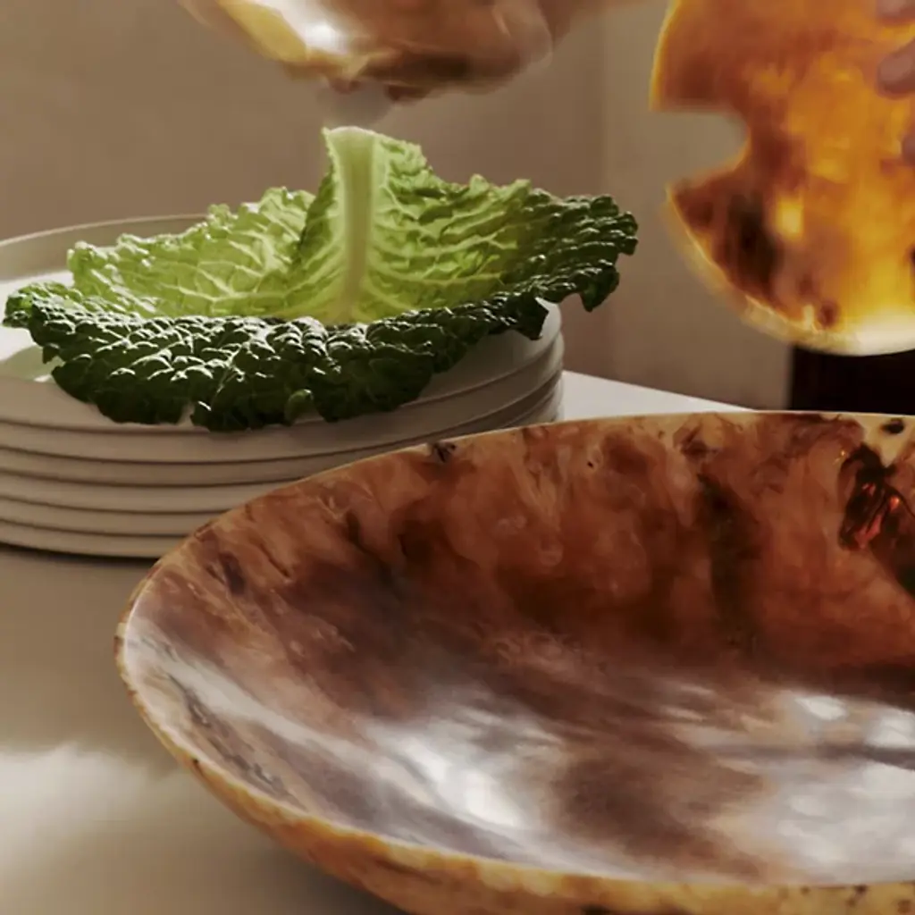 The Sol Salad Bowl from Ferm Living uses resin construction to achieve a marble-like appearance without the weight and fragility of natural stone. Each bowl develops unique veining patterns during the casting process, ensuring no two pieces look identical. The resin material allows for crisp, defined edges while remaining lightweight for everyday handling. Its crescent shape maximizes serving capacity while creating an interesting silhouette that works as tableware or a standalone display piece. The smooth surface cleans easily and resists staining, making it practical for both casual meals and special occasions.