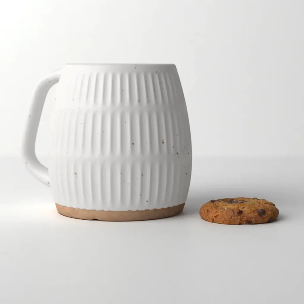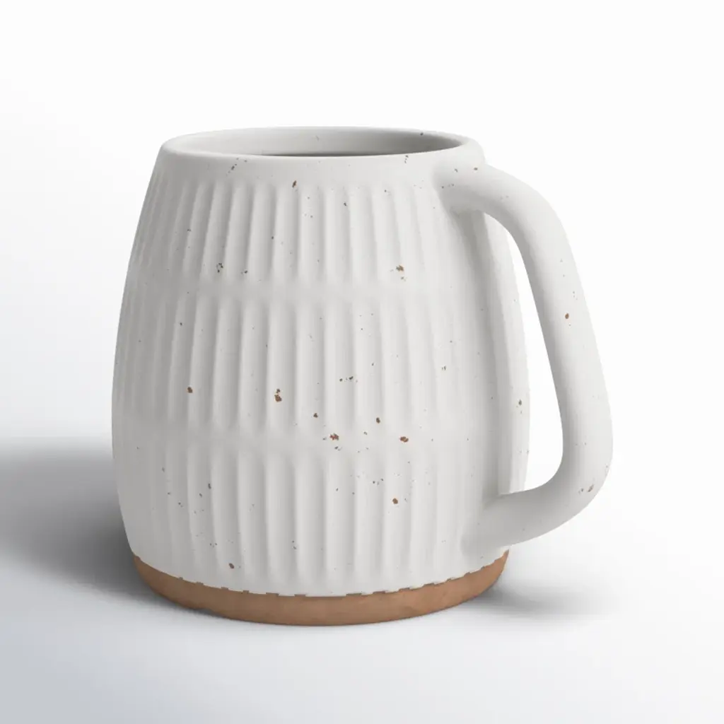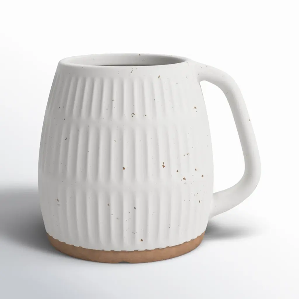 Rustic roast. This handmade coffee mug completes your collection with an aesthetic as organic as your brew. It's hand-crafted from ceramic and holds up to 20 oz., which makes for a generous pour. The design features a ridge texture in a speckled white glaze, softly angled handle, and raw clay peaking through the bottom. We love that this mug has such a natural look, but it's also dishwasher- and microwave-safe, which makes for simple cleaning and reheating.