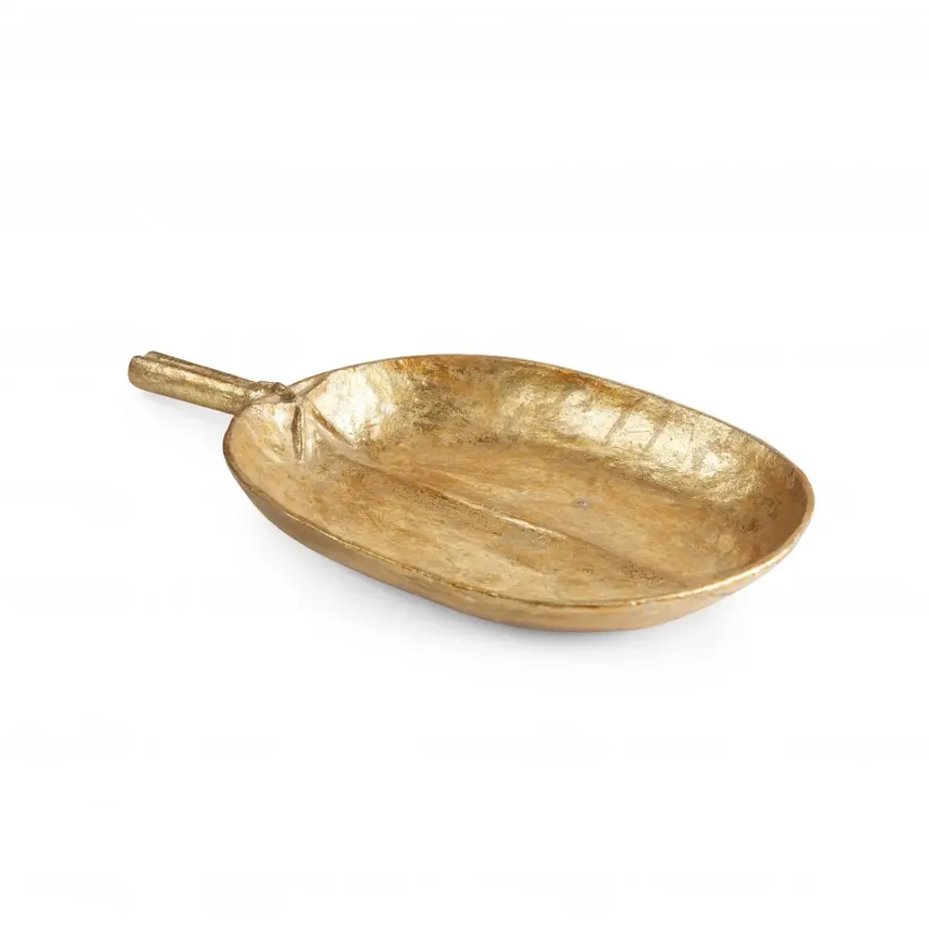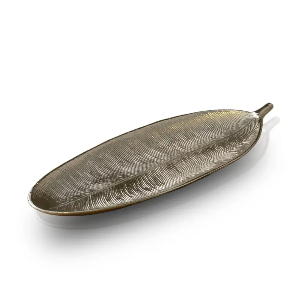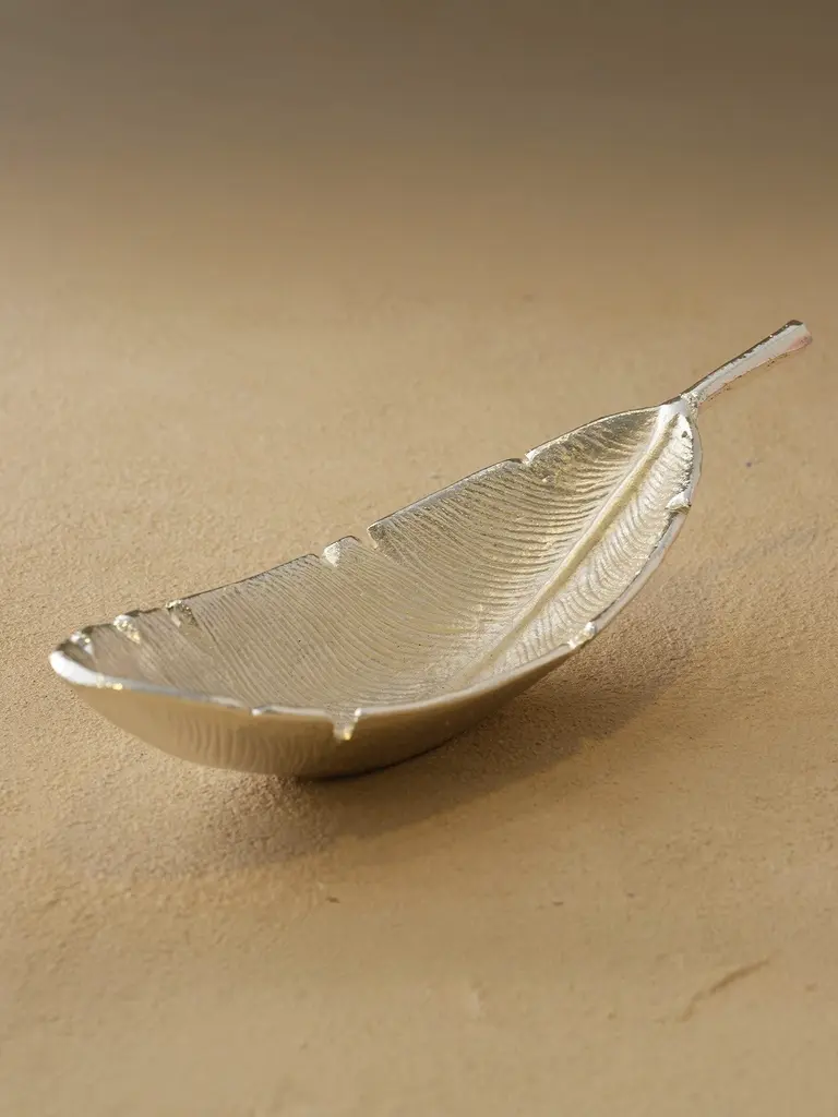 Elevate your tablescape with this sculptural silver-toned serving dish, inspired by the natural grace of a leaf. Crafted from solid brass and finished with a shimmering silver patina, this piece captures delicate vein detailing for a touch of organic elegance. Ideal for serving hors d'oeuvres, fresh fruits, or simply displayed as a decorative centrepiece, it brings a refined, artistic edge to any setting. The elongated, canoe-like silhouette adds a sense of flow and movement to your décor, effortlessly blending contemporary sophistication with artisanal charm.