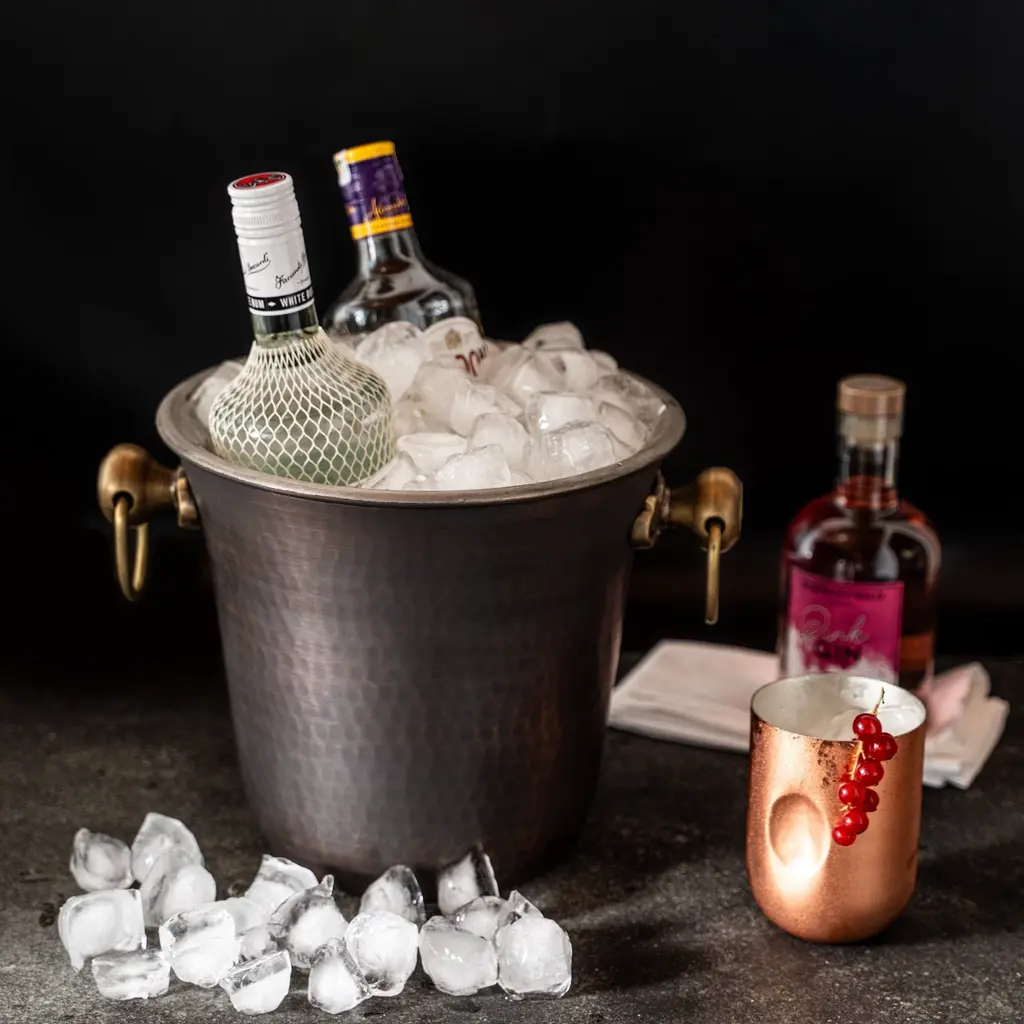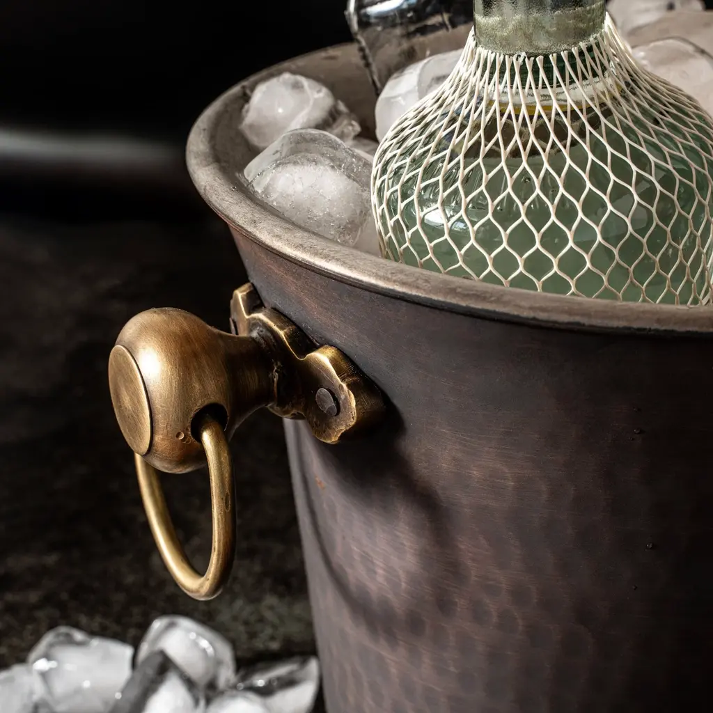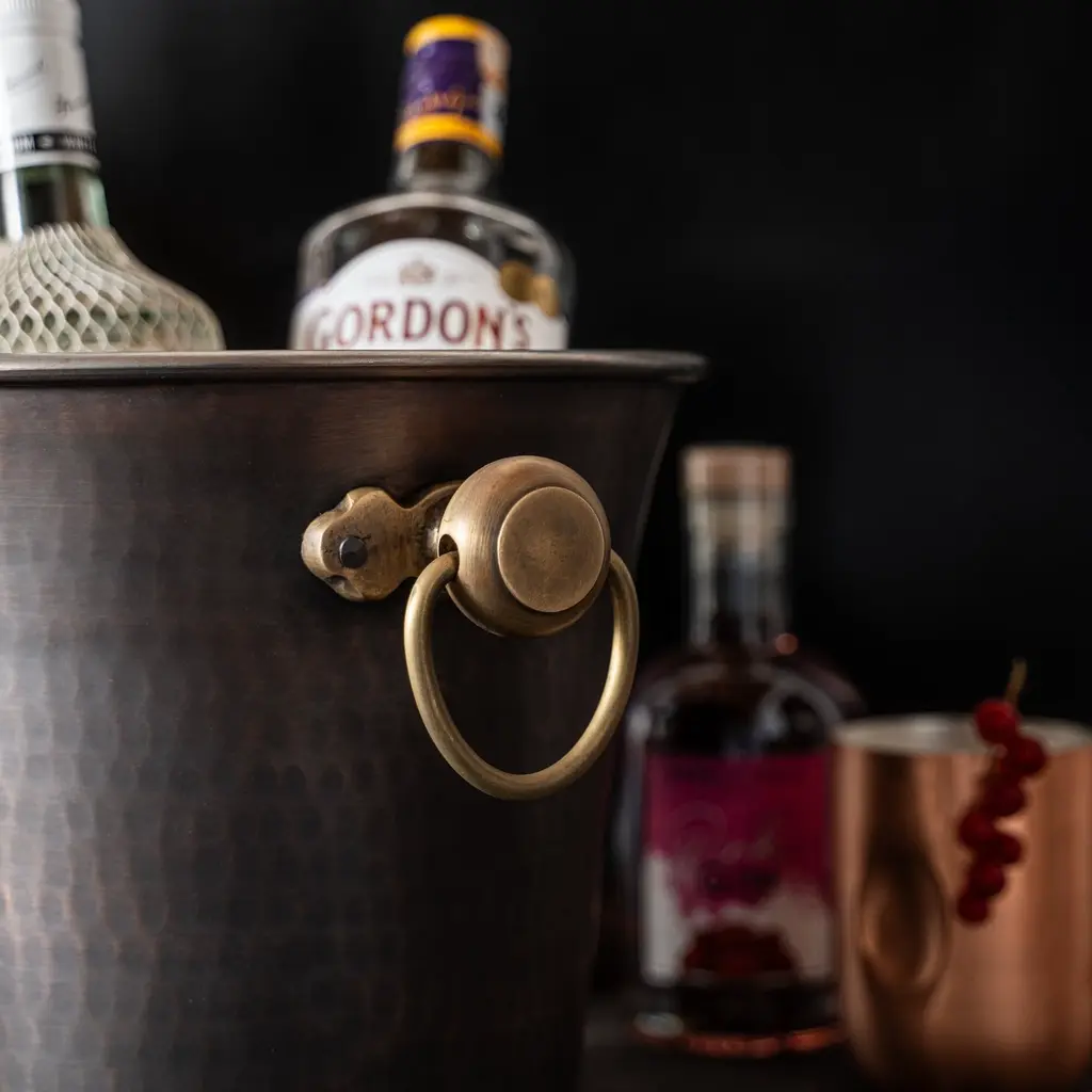 Elevate your entertaining with this Handmade Hammered Copper Ice Bucket, a perfect blend of rustic charm and timeless elegance. Crafted from pure copper with a dark oxidized finish, its hammered texture and aged patina exude vintage sophistication. The sturdy solid brass ring handles add a refined touch while ensuring easy portability. Designed to keep wine, champagne, or spirits perfectly chilled, this versatile piece is both functional and decorative, making it an essential addition to your home bar or dinner table.