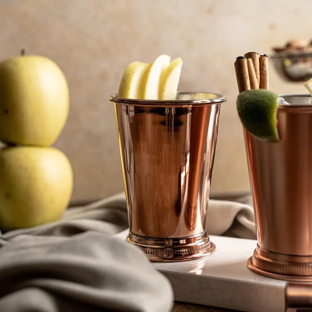 Bring sophistication to your cocktail hour with this handcrafted solid copper Mint Julep cup, a timeless addition to your drinkware collection. Expertly polished to a mirror-like finish, this classic design is elevated with elegant hand-etched details along the rim and base, showcasing exceptional craftsmanship. Perfect for serving the iconic Mint Julep or other refreshing beverages, this cup ensures a luxurious experience while maintaining the rich traditions of copper drinkware. Its durable, food-safe tin lining keeps drinks crisp and flavorful, making it ideal for entertaining or gifting.