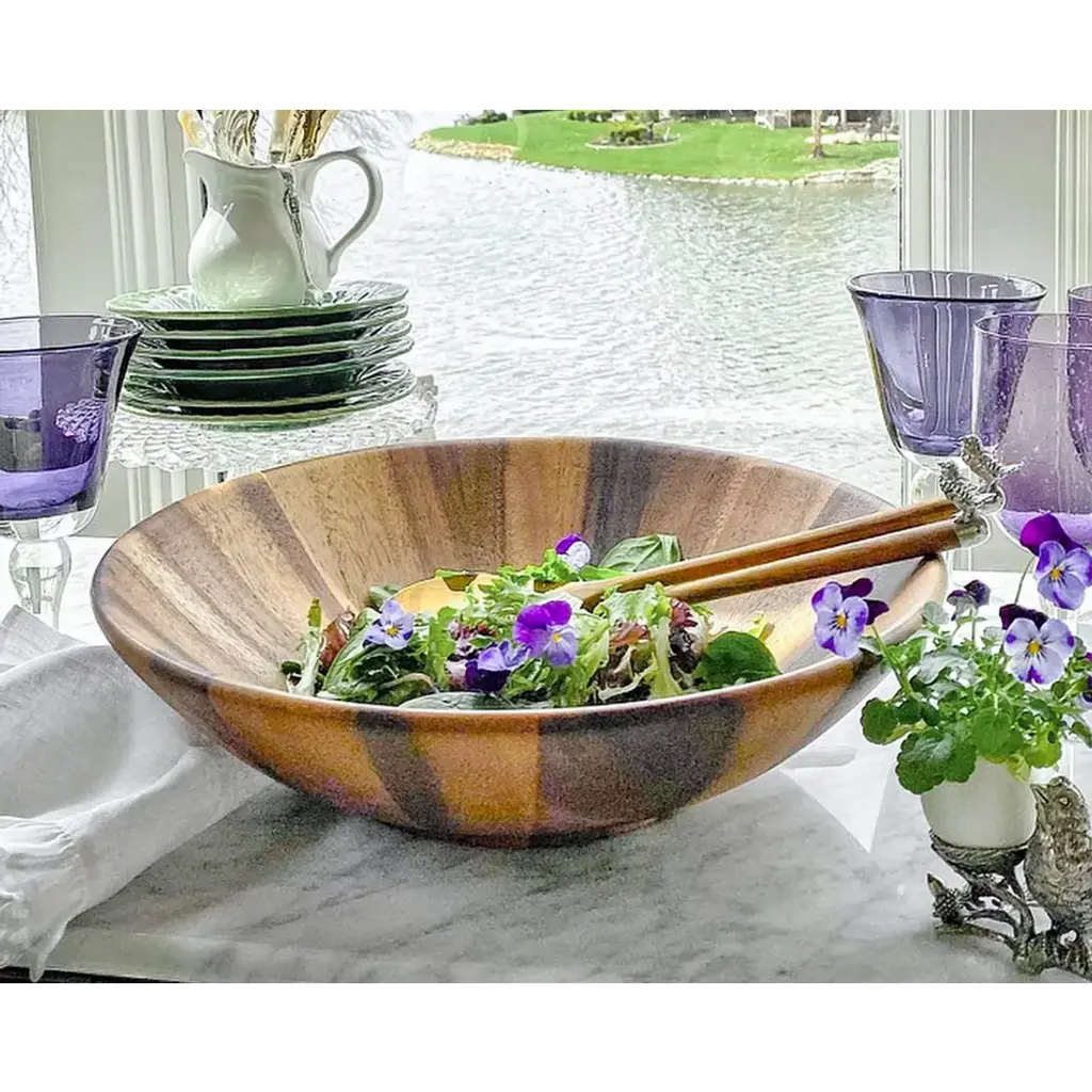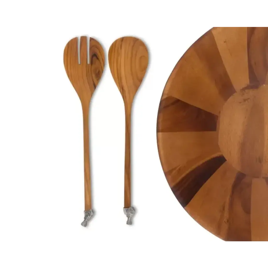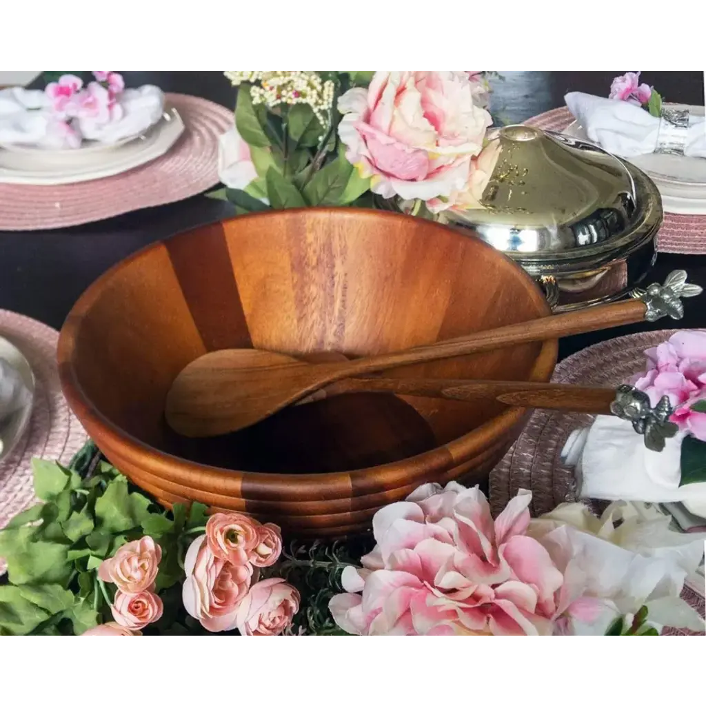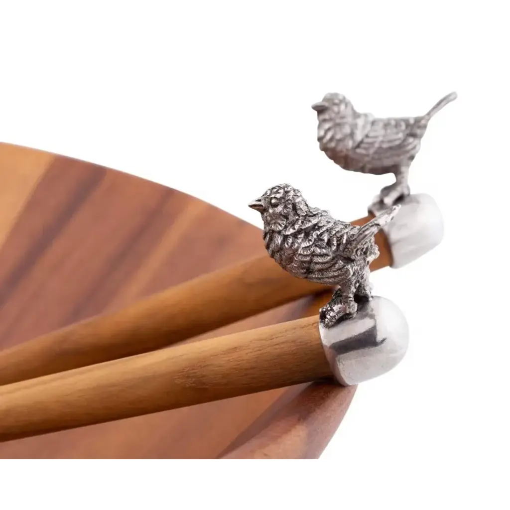 Vagabond House’s gift ready Songbird Salad Bowl Set includes a hand-turned wok style bowl crafted in hard, long wearing Acacia and two matching salad servers. A petite pewter songbird adorns the handle of both the fork and the spoon style server. The cool tones of the luxury pewter songbirds contrast beautifully with the warm chatoyancy of the golden Acacia. Inspired by a flock of song sparrows that nest near our foothill headquarters in California, Vagabond House’s Song Bird Collection captures their playful, carefree spirit as they sing to us each morning. Vagabond House is a family-owned American company specializing in fine pewter tableware, servingware and giftware. Largely inspired by nature, their exclusive products are designed to be unique, functional heirlooms for those who seek to express tradition and style in both family and formal entertaining.
