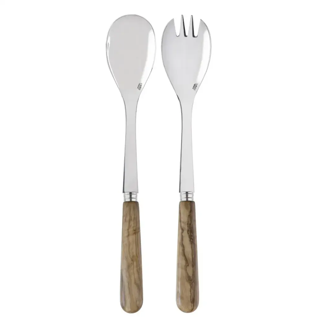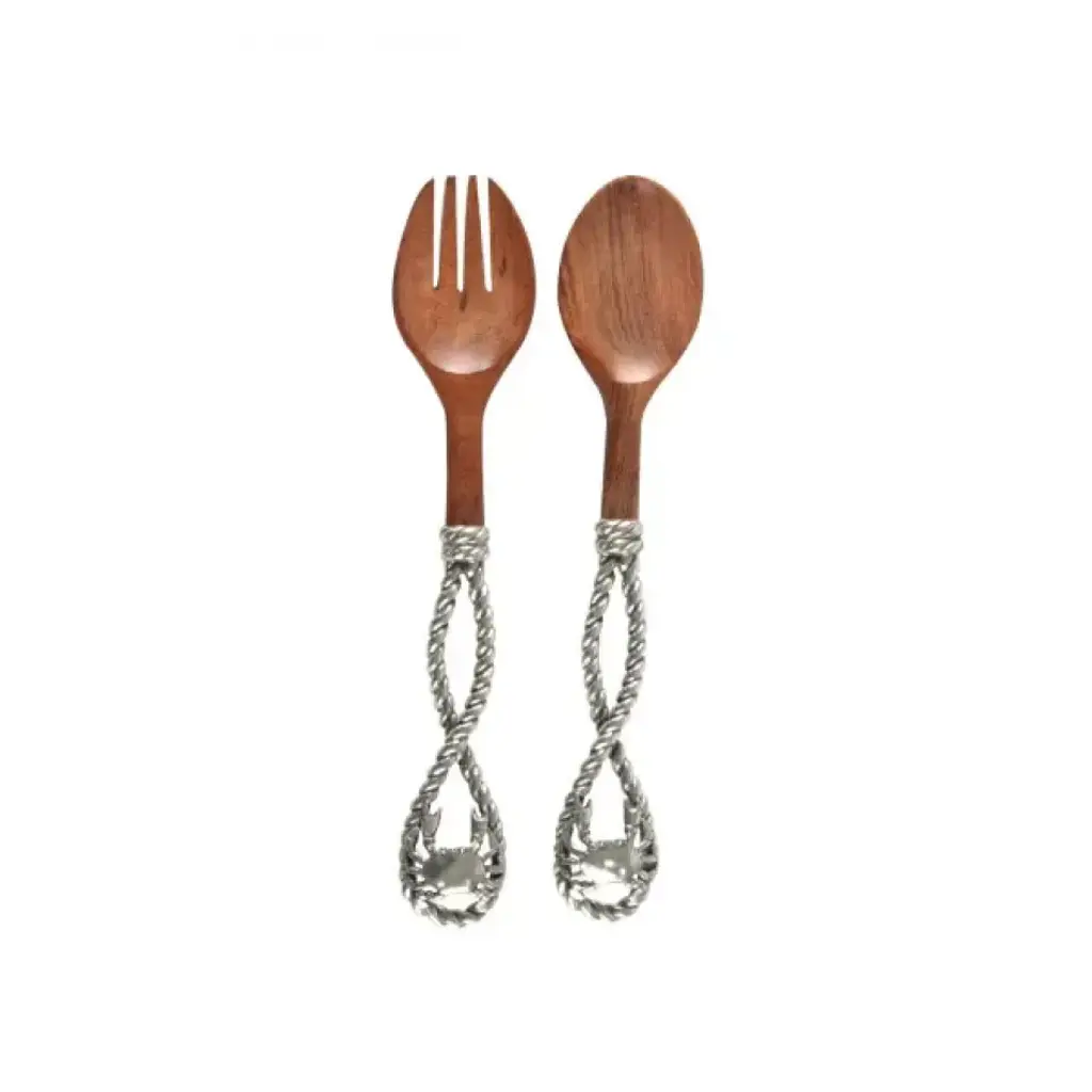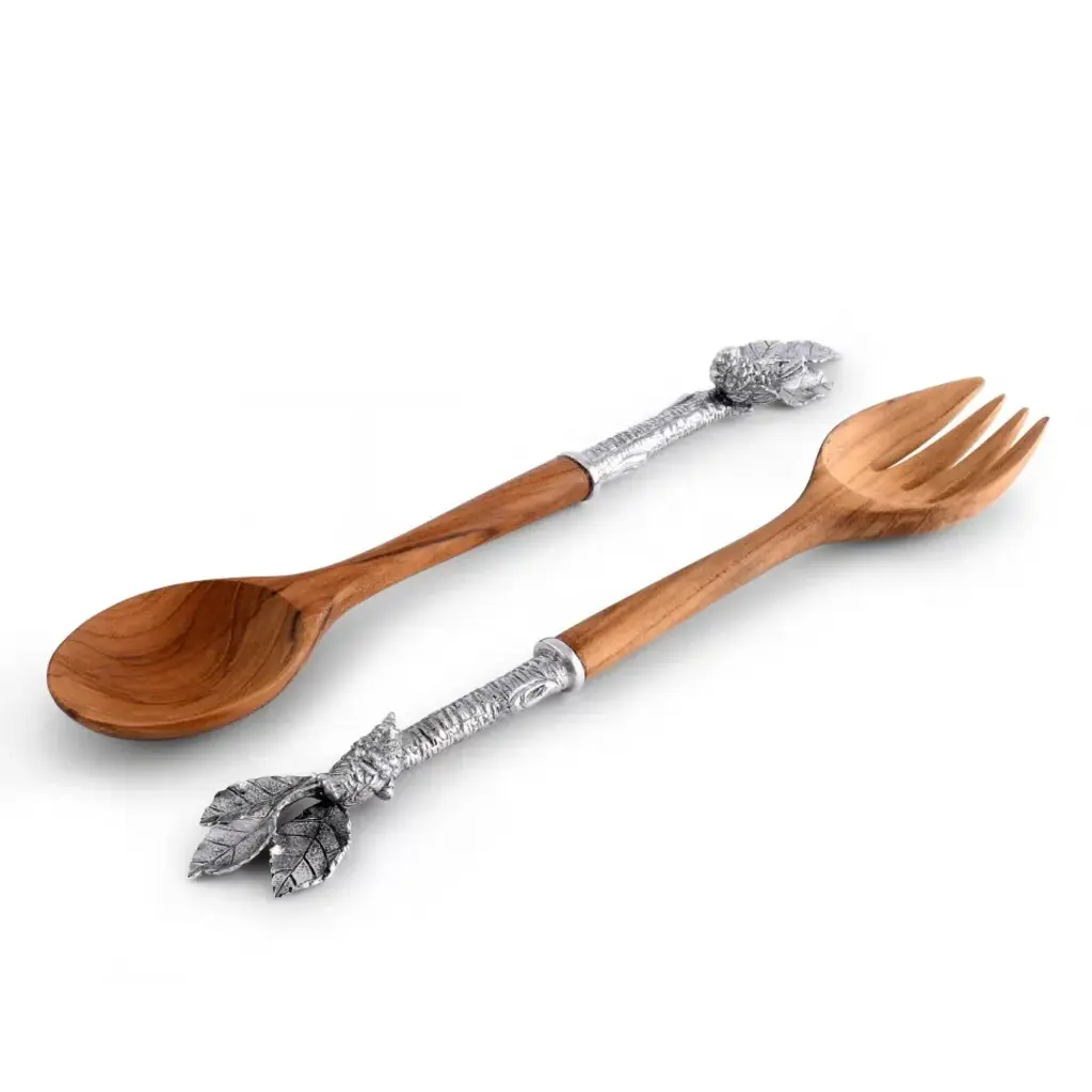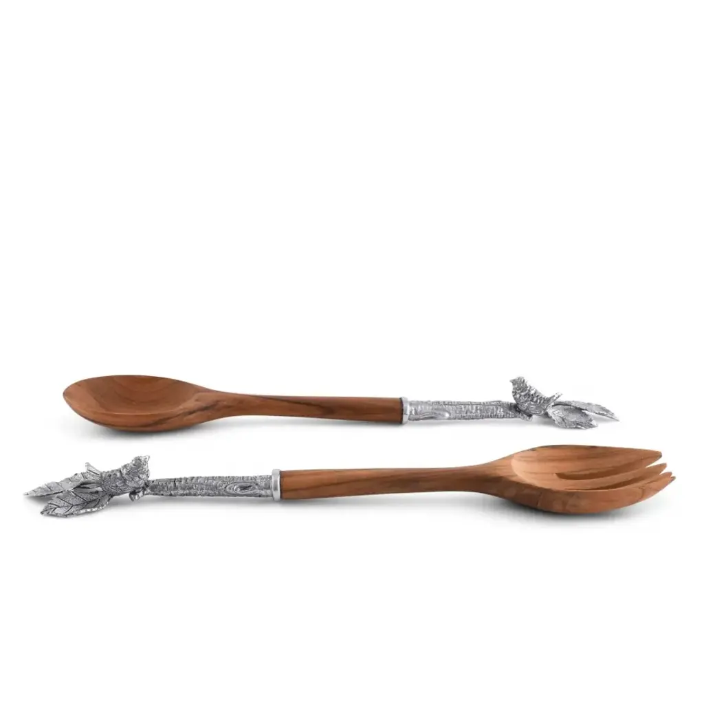The 1/2 handle ends of our Song Bird Salad Server set are cast as tree branches in exquisite, versatile pewter. Detailed, delightful song sparrows perch in a spray of leaves at their tops. Finished with generous, well shaped serving bowls carved from beautifully burled, extraordinarily durable acacia wood, these servers are stylish, strong and sure to bring smiles to the faces and songs to the hearts of the loved ones gathered at your table. Our Vagabond House salad service pieces are designed to be matched or mixed; our mission is to create pieces that enhance the expression of your style. Vagabond House is a family-owned American company specializing in fine pewter tableware, servingware and giftware. Largely inspired by nature, their exclusive products are designed to be unique, functional heirlooms for those who seek to express tradition and style in both family and formal entertaining.
