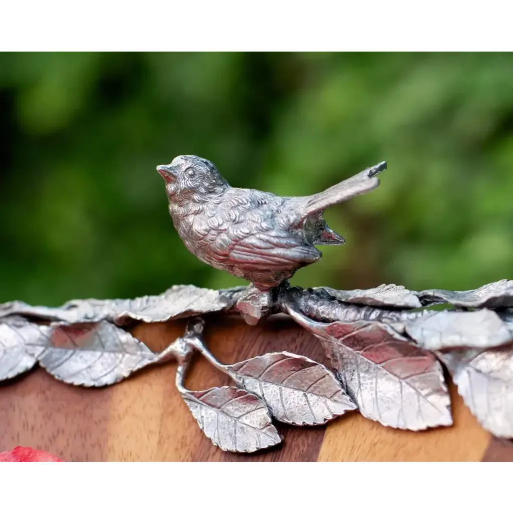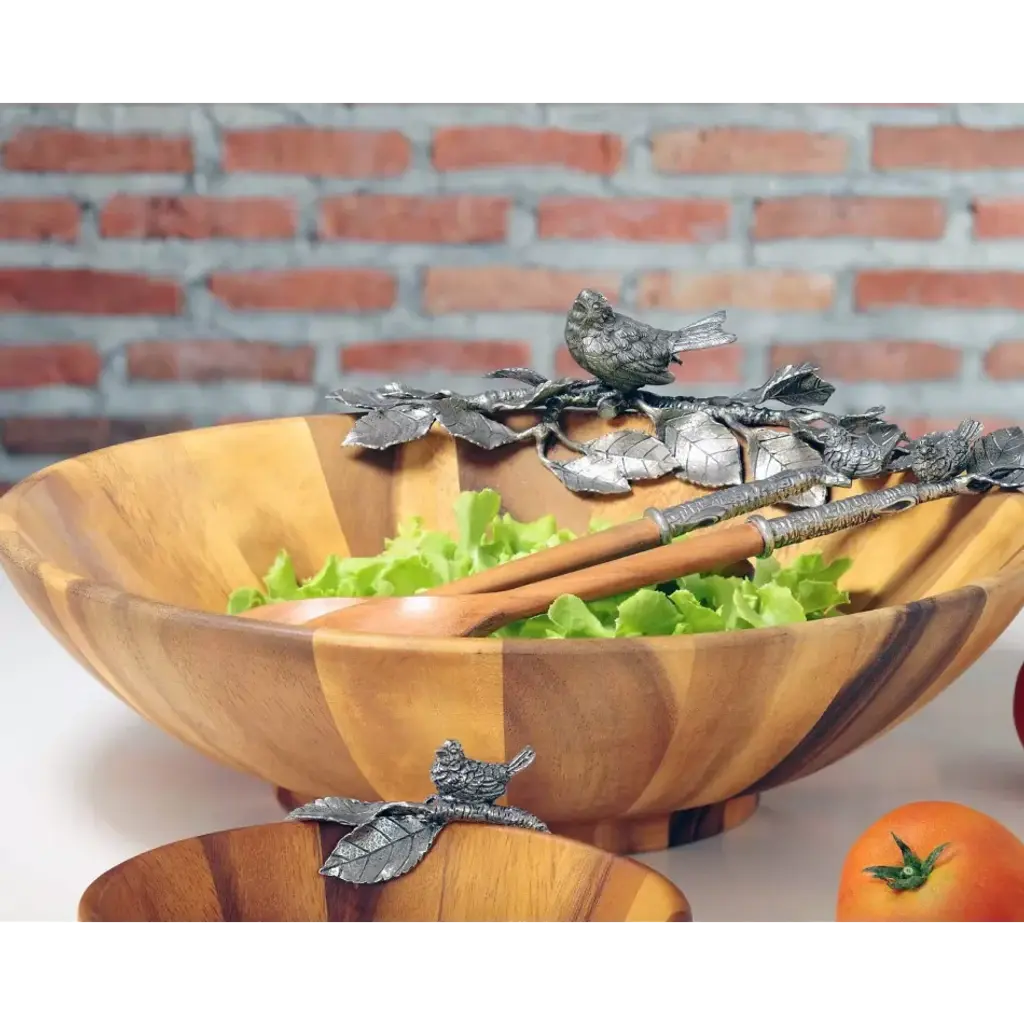 Our Song Bird Salad Serving Bowl is crafted in beautifully burled Acacia Wood. Embellished with a 3-D pewter song sparrow perching on a leafy branch, the combination of wood metal artistry will have guests talking about your beautiful table and delicious food. The elegant, inlaid look of the bowl is created by exceptional joinery. The unique combination of Vagabond House pewter and fine acacia form a bowl that is a celebration in beauty and will bring grace to your table for years to come. Vagabond House is a family-owned American company specializing in fine pewter tableware, servingware and giftware. Largely inspired by nature, their exclusive products are designed to be unique, functional heirlooms for those who seek to express tradition and style in both family and formal entertaining.