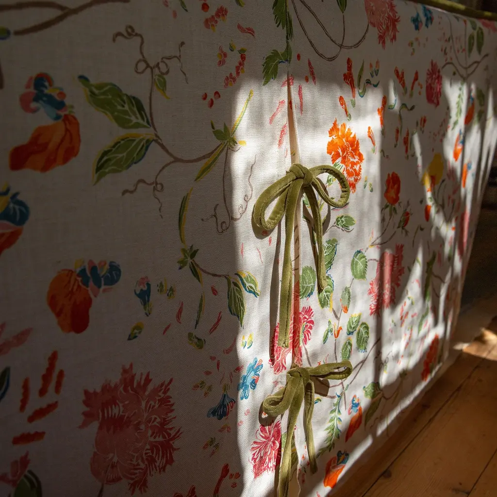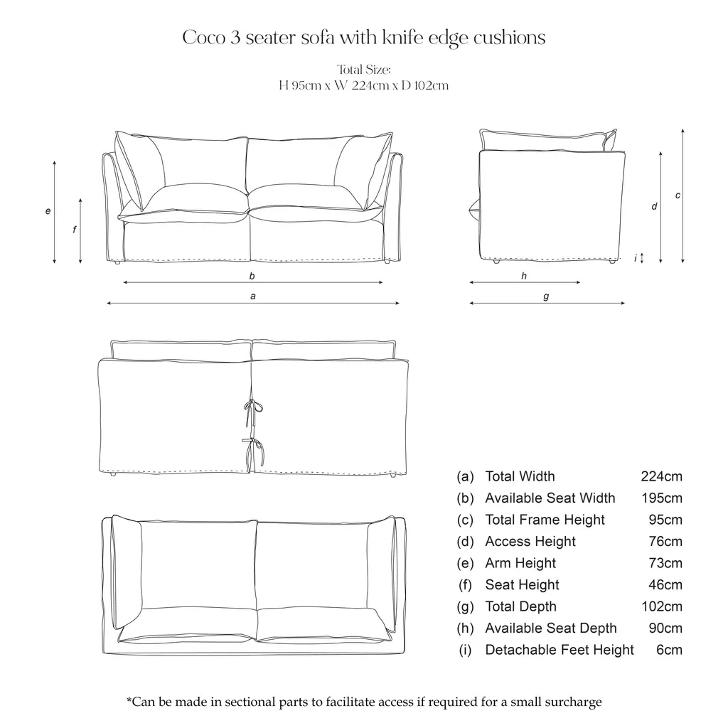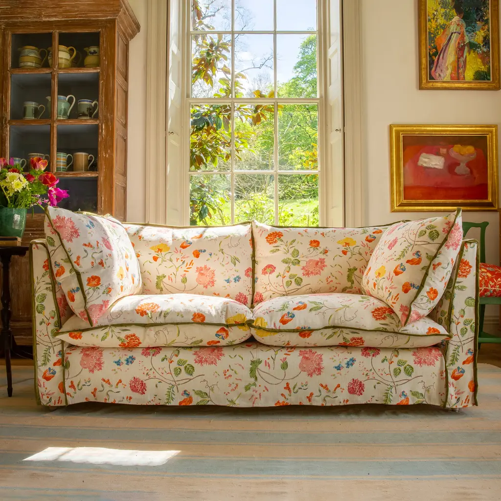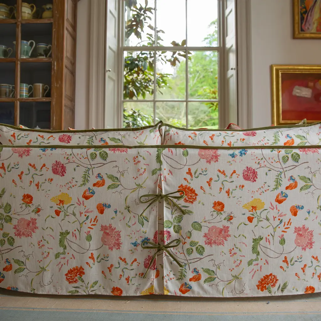 A joyous beautiful sofa made by hand in the US using all natural materials with a large dollop of comfort. Dimensions: Width 224cm (88.18 inches), Depth 102cm (40.15 inches) , Height 95cm (37.40 inches) - for more information please see illustrations Material - Our sofas are made from natural materials including: Solid Hardwood frame, all natural fibres, individual coil steel springs. Our standard cushions are filled with Feather and Fibre. This filling is very comfortable and has good resilience - so they bounce back well. The will need to be plumped once a week, but not on a daily basis. We can also provide fully customisable cushion fills depending on your requirements. These include all natural down and feather as well as latex fillings. Please read our blog section for more information regarding our cushion fills. Fabric Composition: 80% Viscose / 20% Linen ‘Tradition with a twist of joy and a very large dollop of comfort…’ Traditionally, all sofas were made using just natural materials. Ours are made traditionally, they are all natural too featuring solid Birch hardwood frames, fully sprung steel seats and made entirely from natural fibres. The result is as you’d imagine, incredibly comfortable and hand made beautifully to last a lifetime. 'Bespoke, by hand and limited production' My sofas are made completely bespoke for you by hand in North Carolina by a family owned and run business. They are highly skilled craftspeople who are very dedicated to producing truly exceptional quality. As a result, there is only ever going to be a limited amount of my sofas available every year. 'Sofas designed for living in' If your sofas are anything like mine, they get a lot of use from family friends and lots of dogs too. For that reason, all my sofas come with loose covers so they can be removed for cleaning. I wanted mine to be really easy to change so I have added a beautiful bow detail at the back of them that makes it super easy to change your covers.