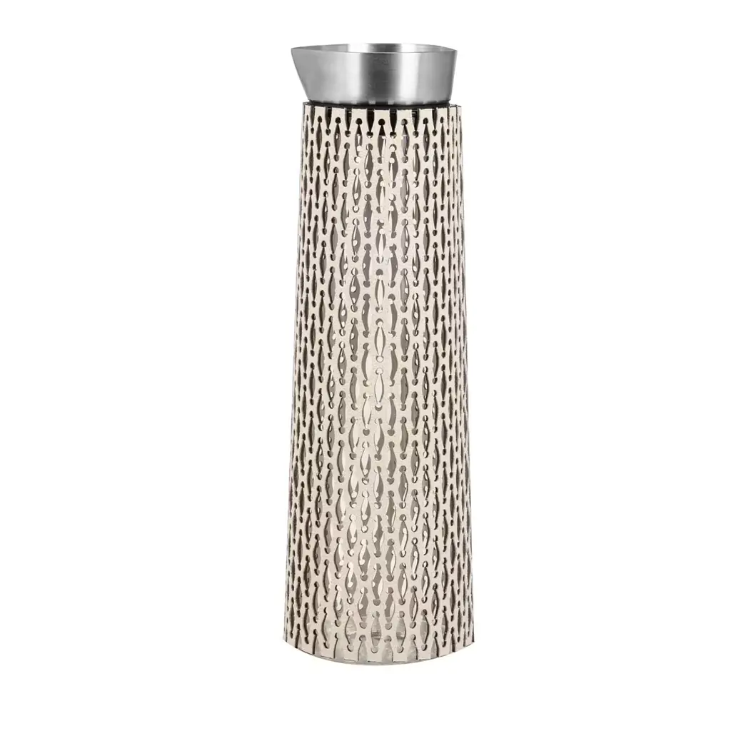 A sophisticated way to serve drinks, this stunning carafe will complete a home office decor or modern kitchenware collection. Showcasing a slender, tapered silhouette that narrows to a metal spout, it is entirely fashioned of clear glass and enveloped in a luxe leather cover (removable) exquisitely adorned with a laser-cut openwork design. It holds up to 1.5L, but it is also available in a smaller variant holding up a maximum of 1L.