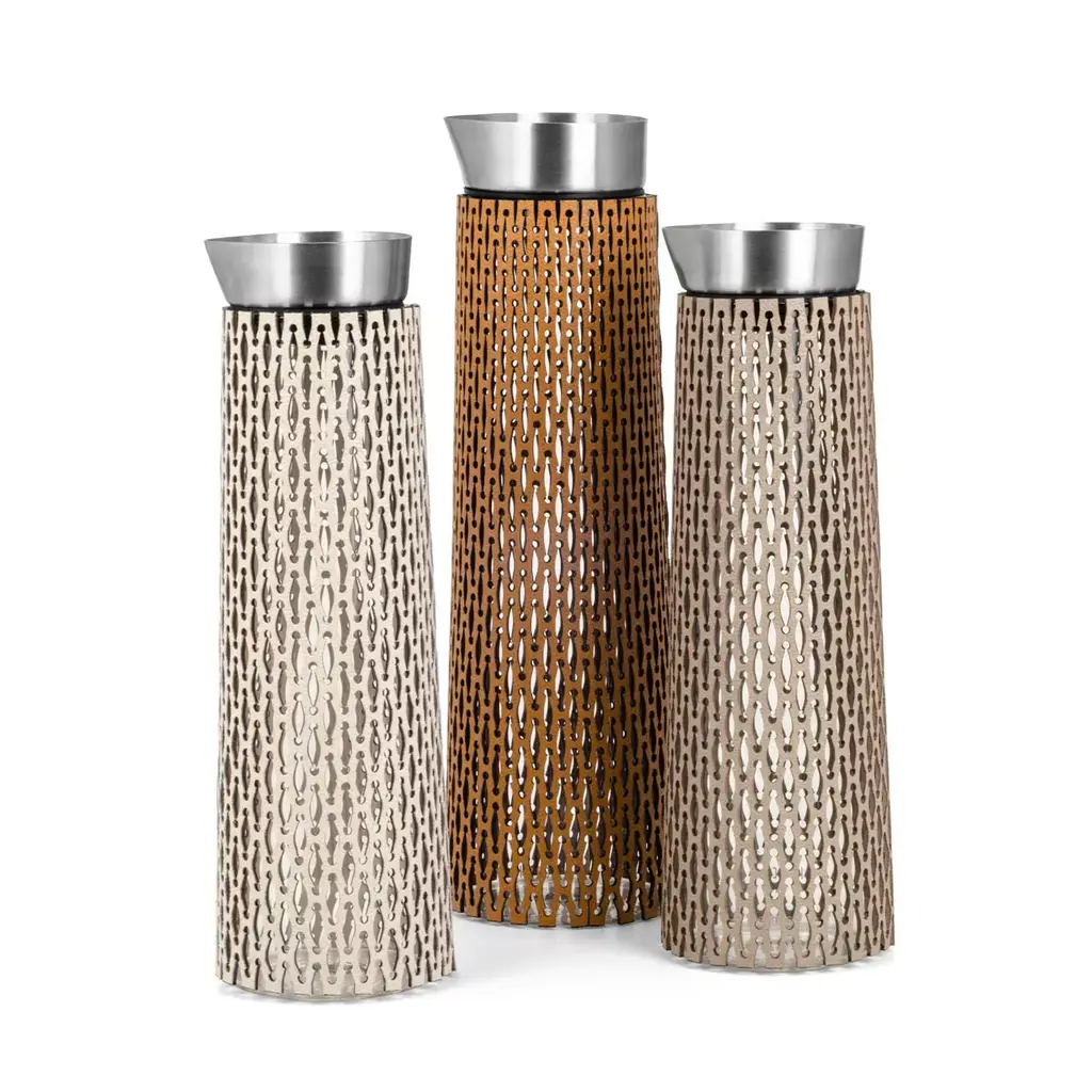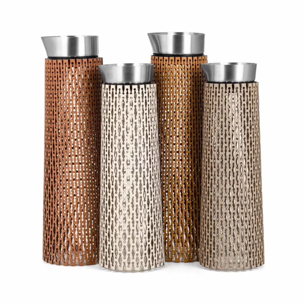 An exquisite addition to a conference room or private study, this carafe pairs an easy function with a luxe aesthetic. The glass body slowly and progressively tapers to the neck, where a metal spout allows for easy pouring of the liquid contained within. The signature feature of the design is the beige leather sleeve (removable), distinguished by an extensive, laser-cut design. Perfect to be paired with leather trays from Pinetti for a tailored look. Available in a larger version (1.5L).