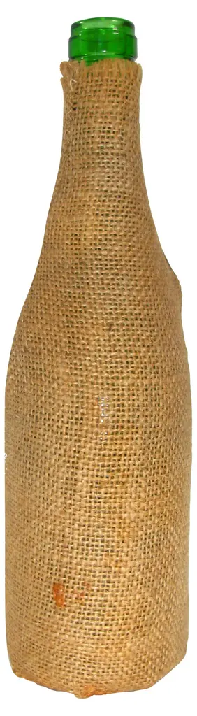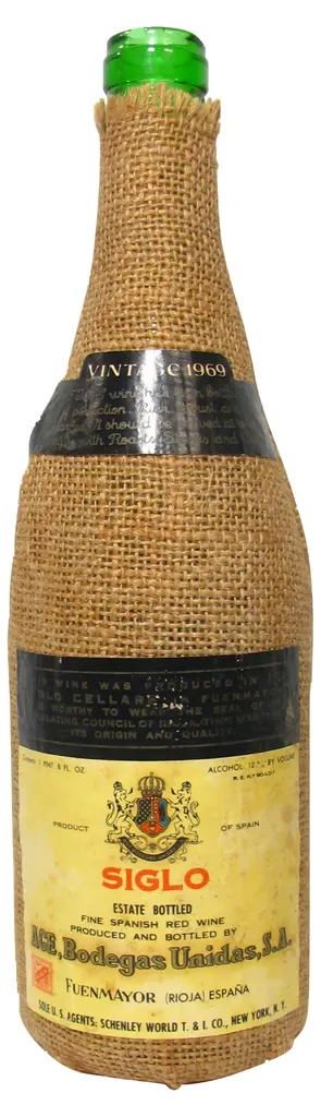 Pair of 1969 Spanish Rioja burlap-wrapped glass wine bottles from the AGE Bodega vineyards of Fuenmayor, Spain. Some age wear to labels.