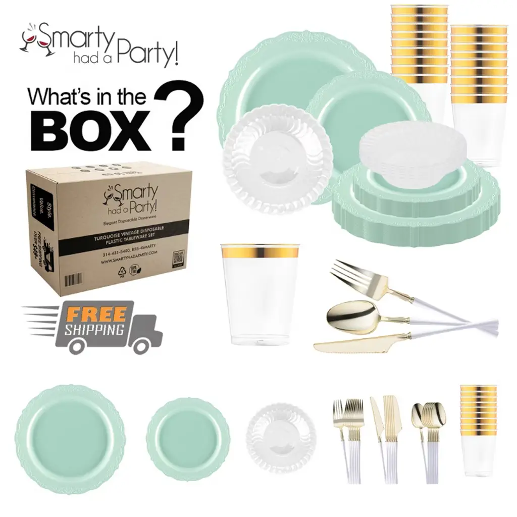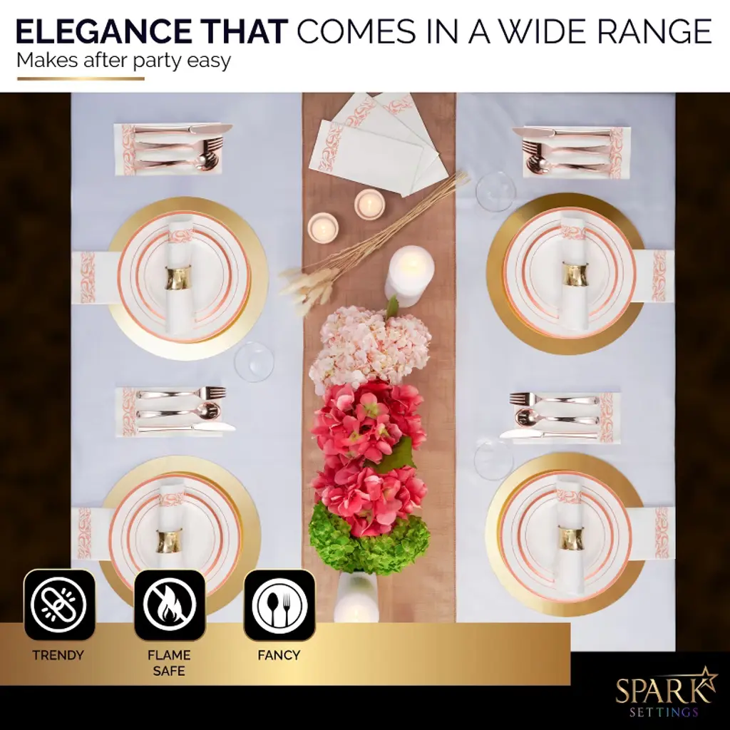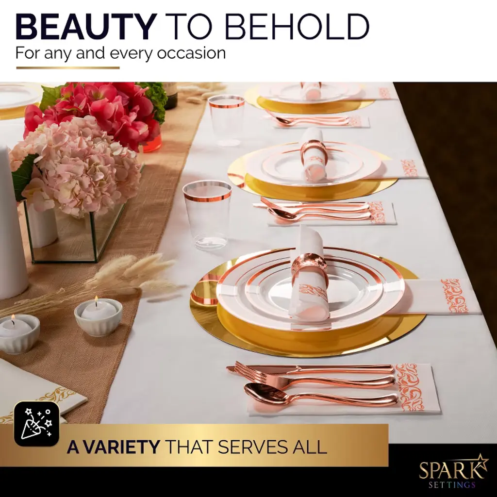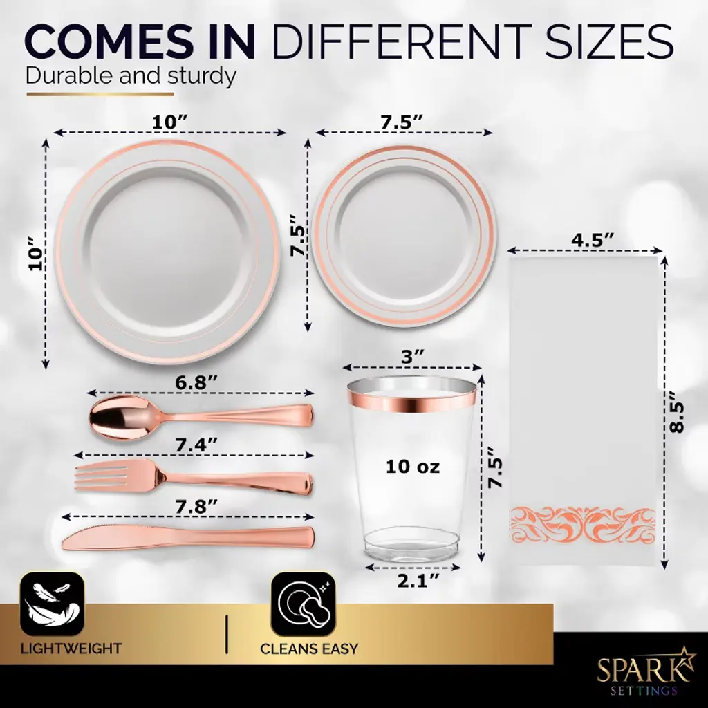 The stunning SparkSettings disposable plastic dinnerware set will equip you with everything you need to set the most attractive tables for you and your guests. The complete bundle includes: 50 x 10.25” rose gold rimmed plastic dinner plates, 50 x 7.5” rose gold rimmed plastic dessert plates, 50 rose gold rim cups, 50 napkins with gorgeous designs, 50 rose gold forks, 50 rose gold spoons and 50 rose gold knives.