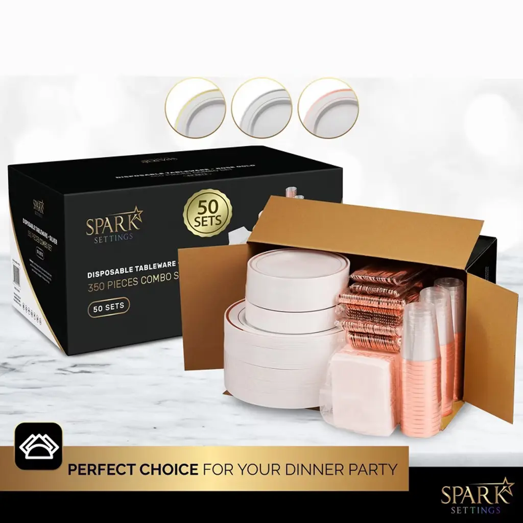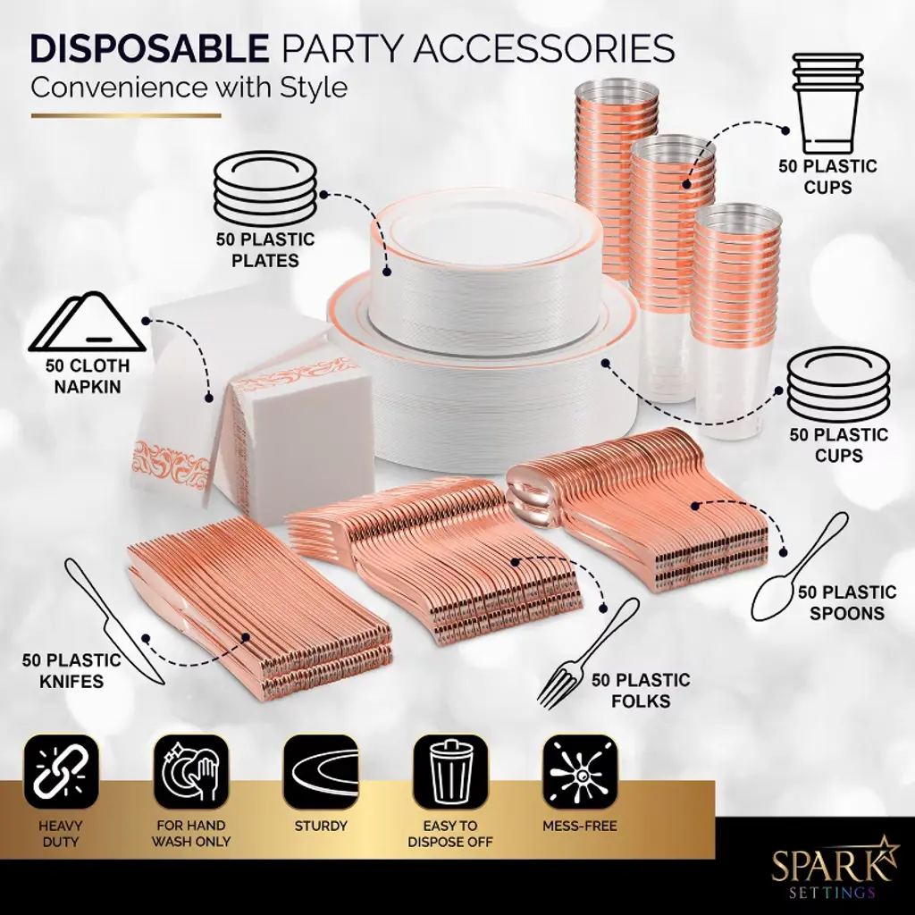 Sparksettings Rose Gold Disposable Plastic Dinnerware Set 350 Pc, For 50 Guests