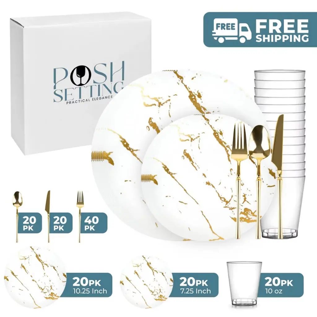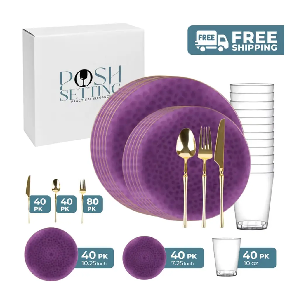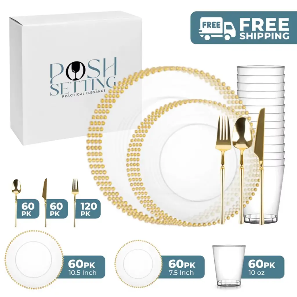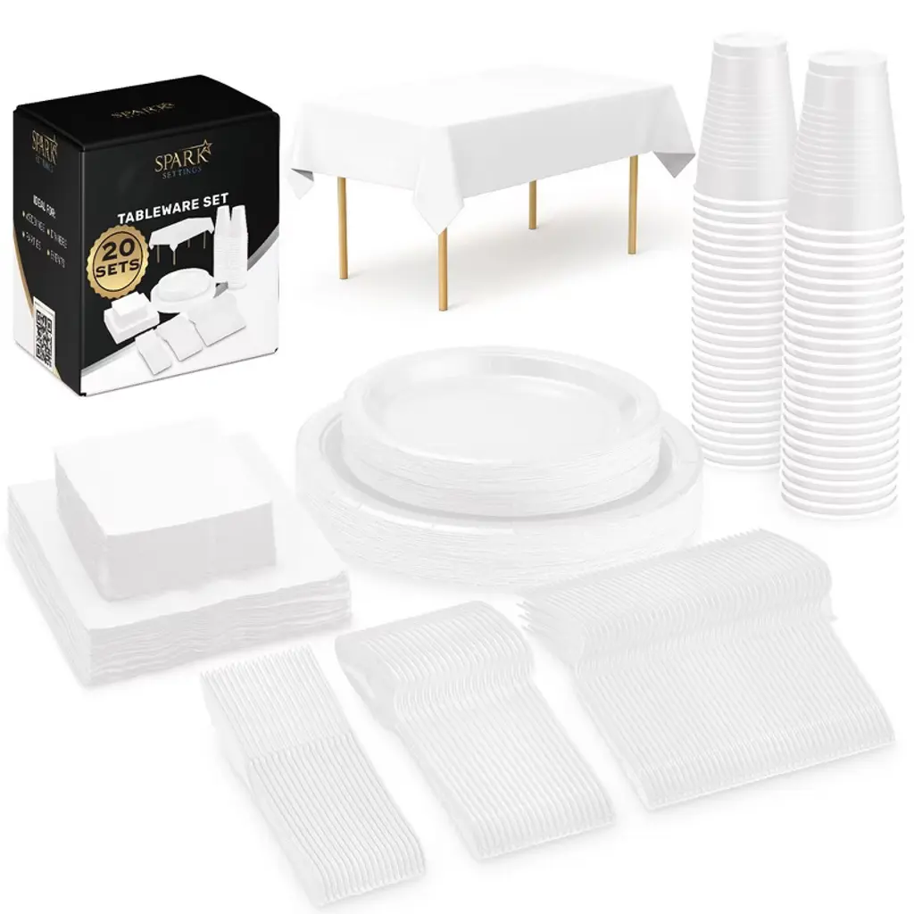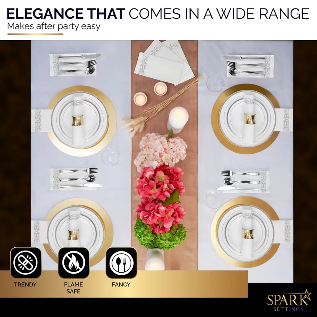 The stunning SparkSettings disposable plastic dinnerware set will equip you with everything you need to set the most attractive tables for you and your guests. The complete bundle includes: 50 x 10.25” silver rimmed plastic dinner plates, 50 x 7.5” silver rimmed plastic dessert plates, 50 silver rim cups, 50 napkins with gorgeous designs, 50 silver forks, 50 silver spoons and 50 silver knives.