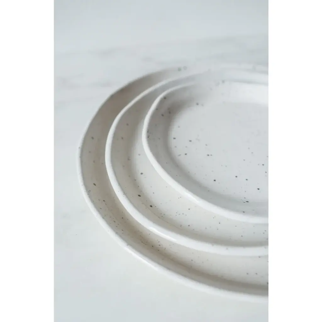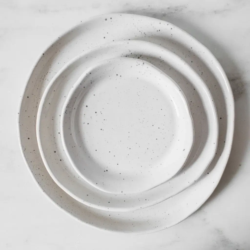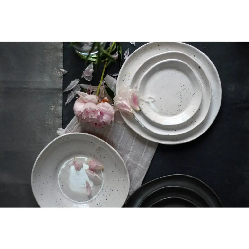 Indulge in the handmade beauty and elegant simplicity of our dinnerware set. Each piece features a glossy white glaze, accented with speckles of our unique gunmetal gray glaze. This set includes a dinner plate, salad plate, and dessert plate all made from high-quality ceramic. Perfect for elevating any dining experience.