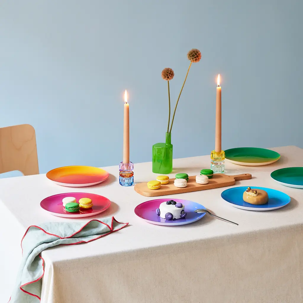 MoMA Exclusive: Set your table with a full spectrum of color with this mesmerizing set of Spectrum Dinnerware. Produced through an ombre painting technique which involves the hand-application of paint to the back of the plates, these designs visually connect one place setting to the next through overlapping colors. Made from recyclable glass. Not safe for microwaves. Hand wash only.