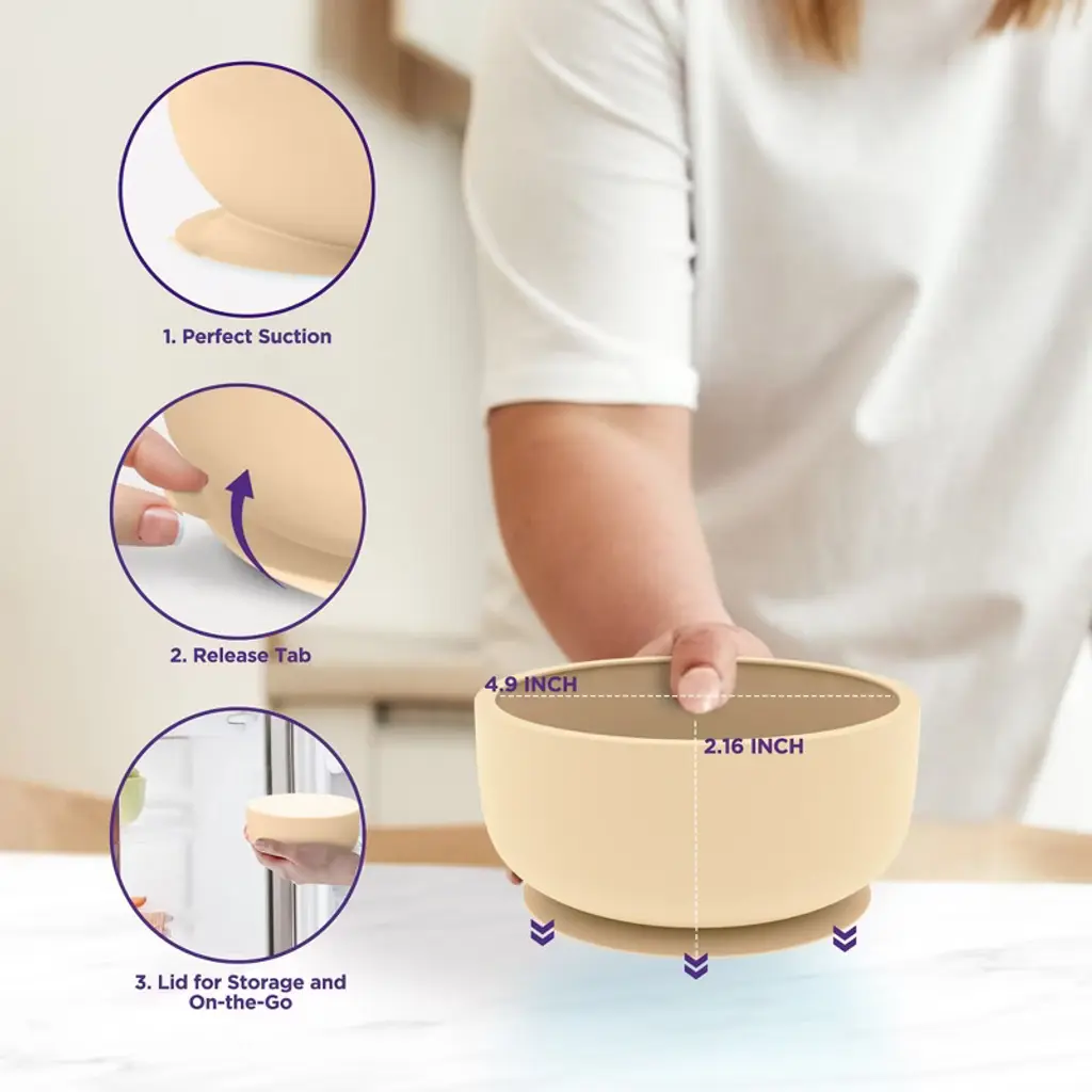 Sperric Silicone Baby Feeding Set - Infant Suction Bowls With Lids And Spoons | Bpa Free Toddler Self Feeding Utensils For 0-6 Months (Beige)